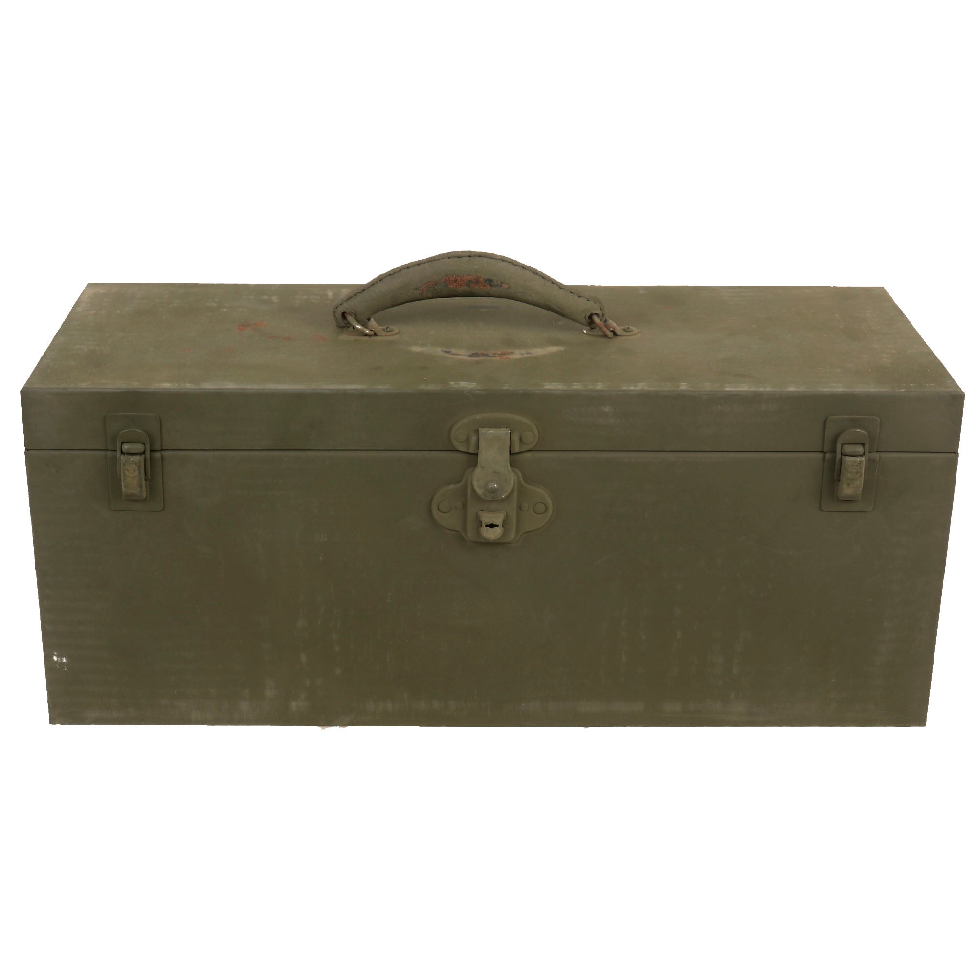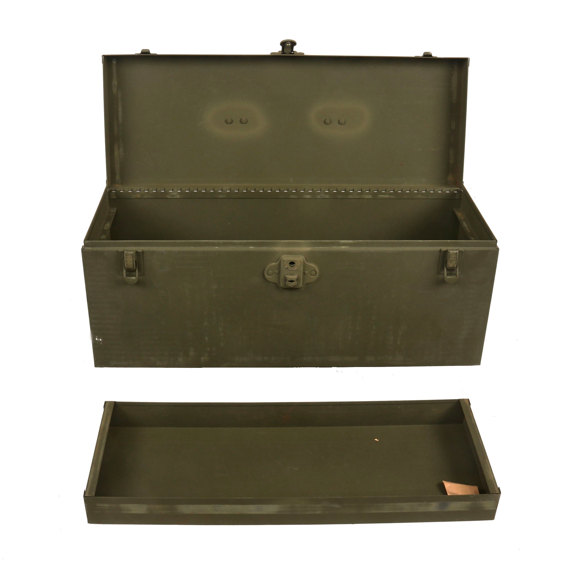 The chest retains its original inner shelf with a bag with the original two keys. There are no other components in the chest. Both latches work well, and the chest has a great layer of paint from before being packed away.