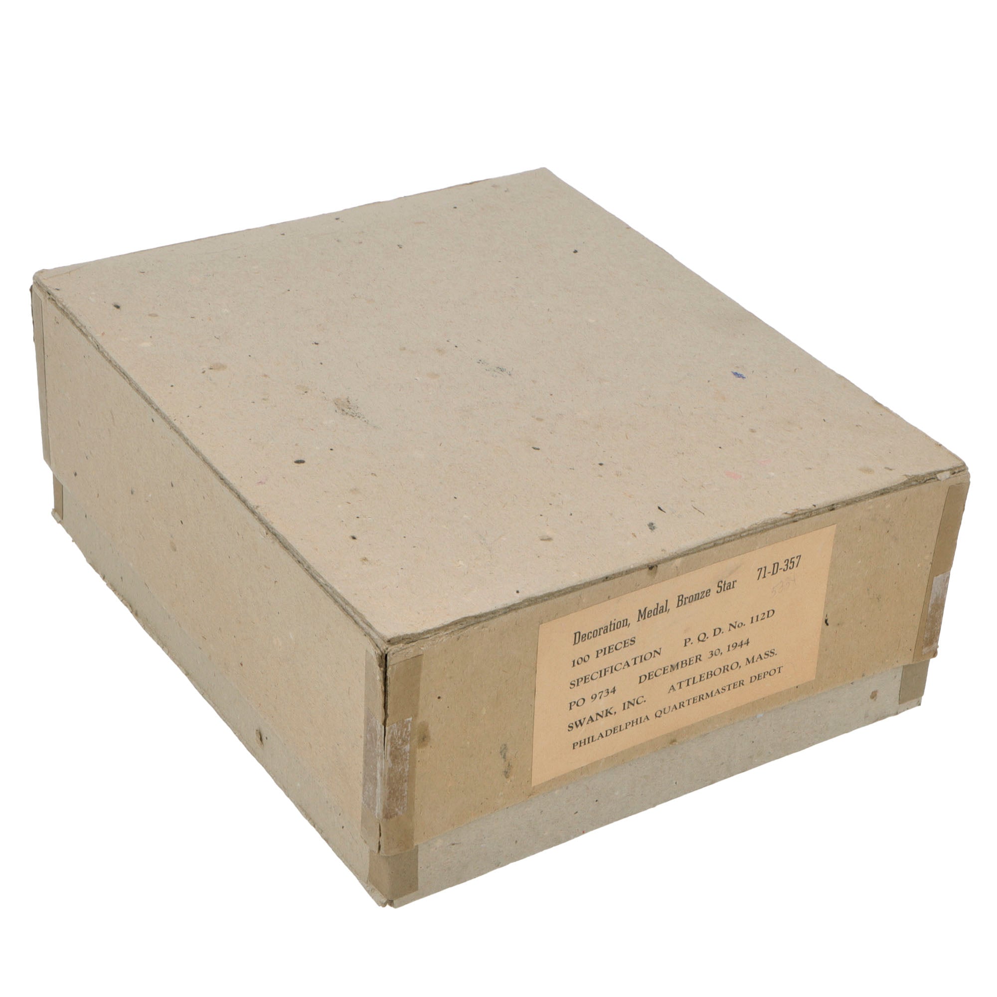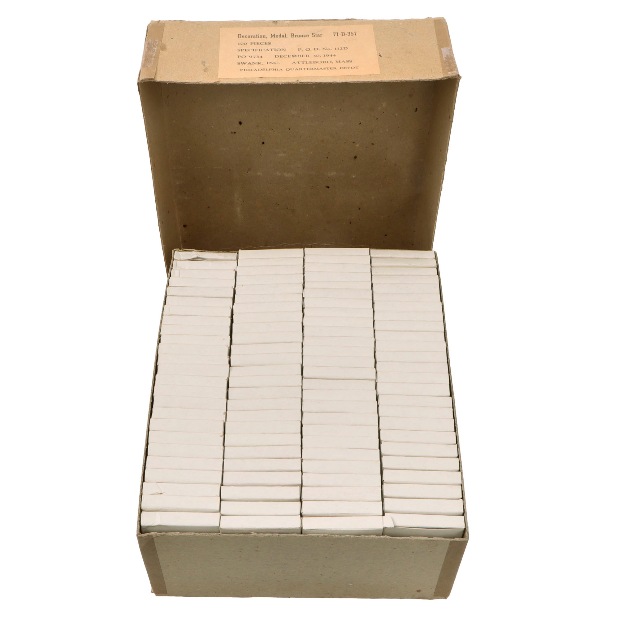 We are offering a fantastic selection of original World War II Bronze Star Medals in their original small boxes. The medals all came from a 1944-Dated carton, so these are all completely genuine WWII-issue medals.