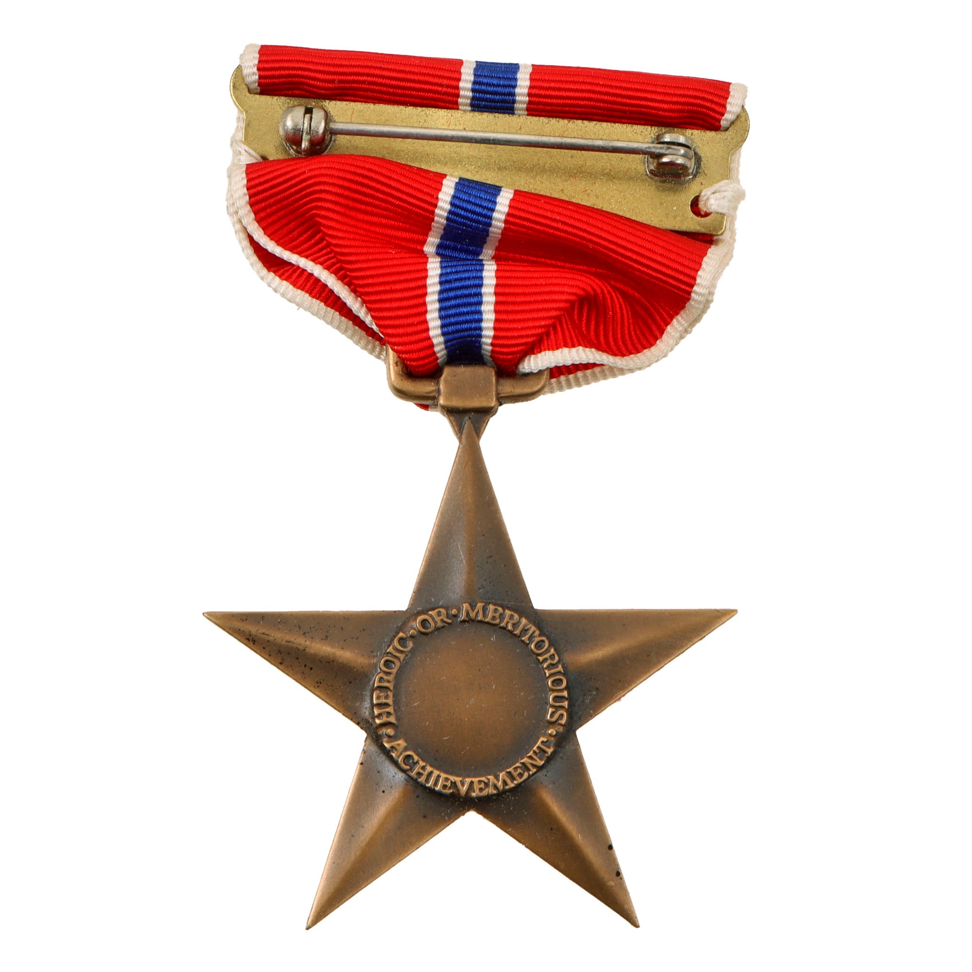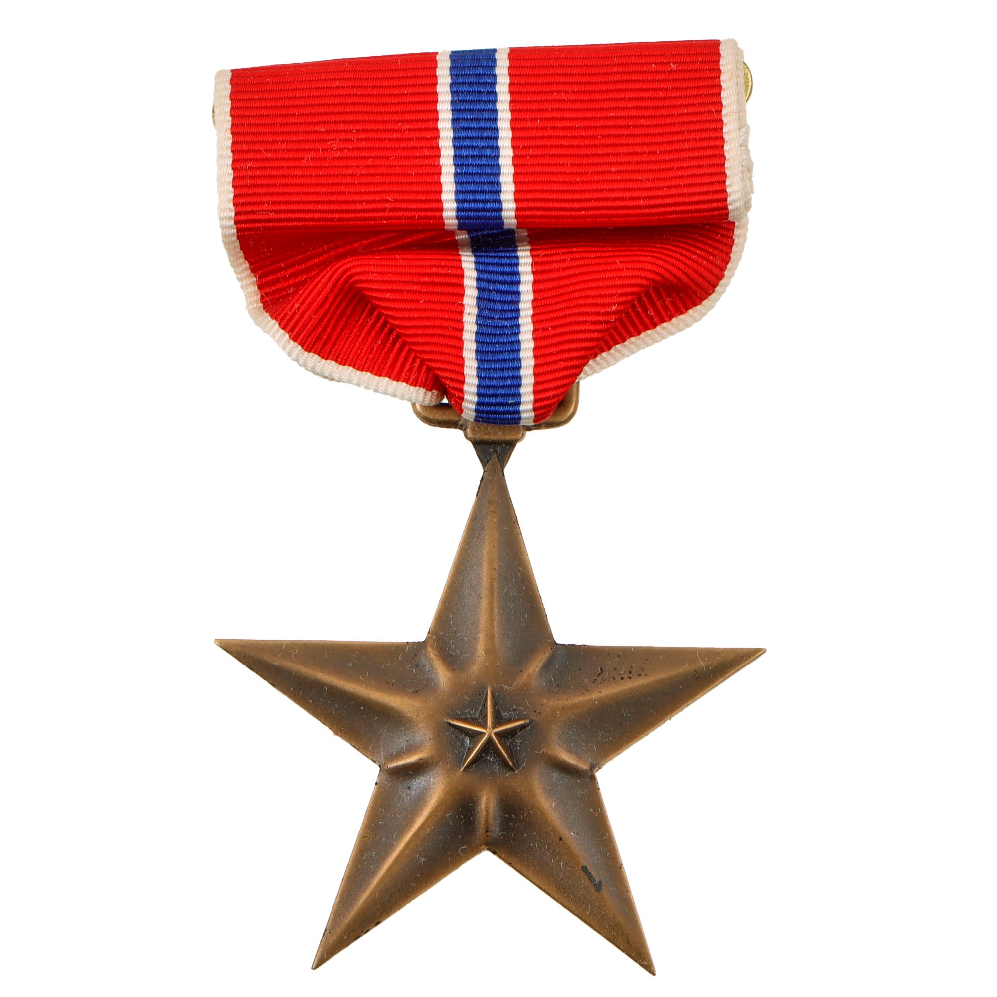 Original Item. Very Few Available. The Bronze Star Medal is a United States Armed Forces decoration awarded to members of the United States Armed Forces for either heroic achievement, heroic service, meritorious achievement, or meritorious service in a combat zone. When the medal is awarded by the Army, Air Force, or Space Force for acts of valor in combat, the "V" device is authorized for wear on the medal. When the medal is awarded by the Navy, Marine Corps, or Coast Guard for acts of valor or meritorious service in combat, the Combat "V" is authorized for wear on the medal.