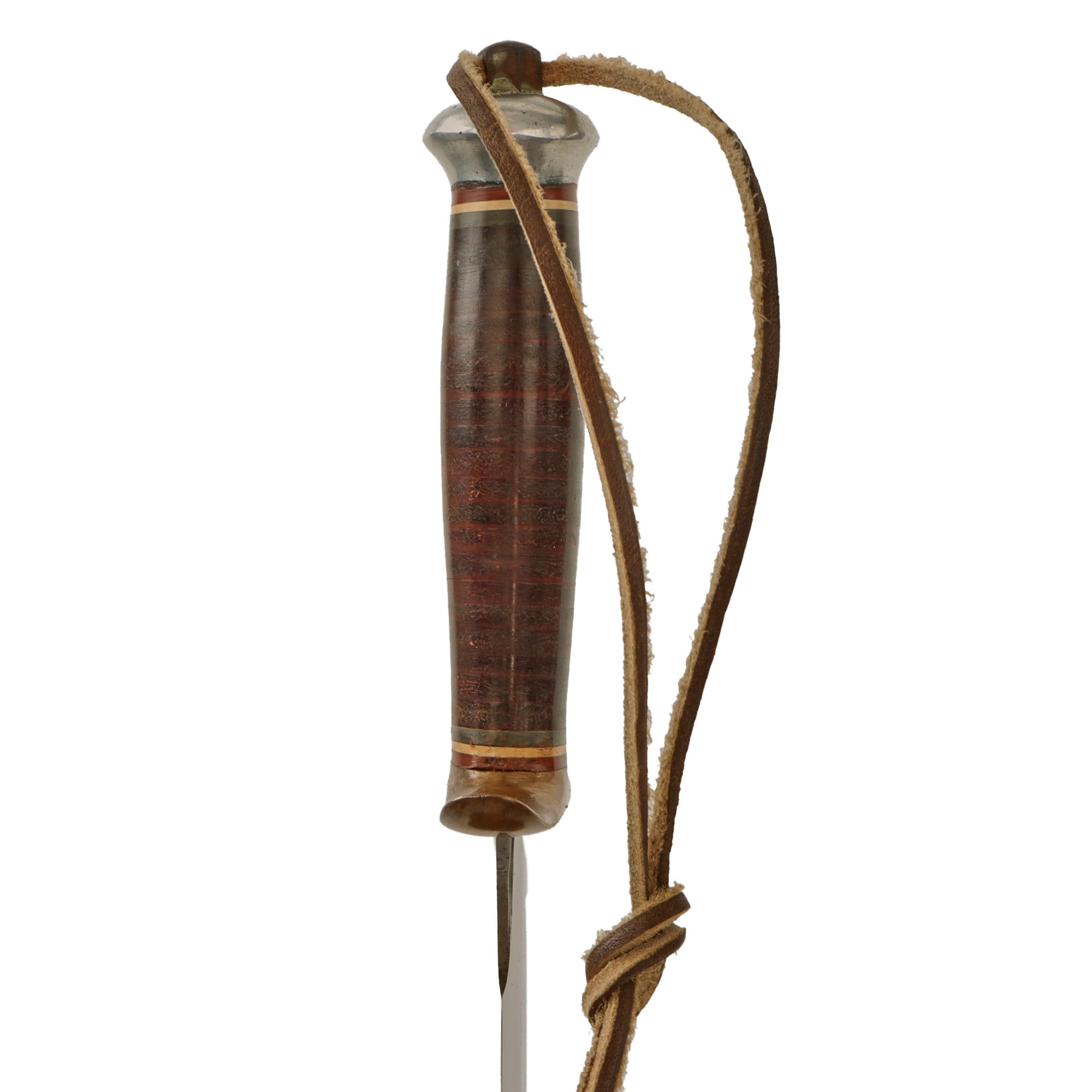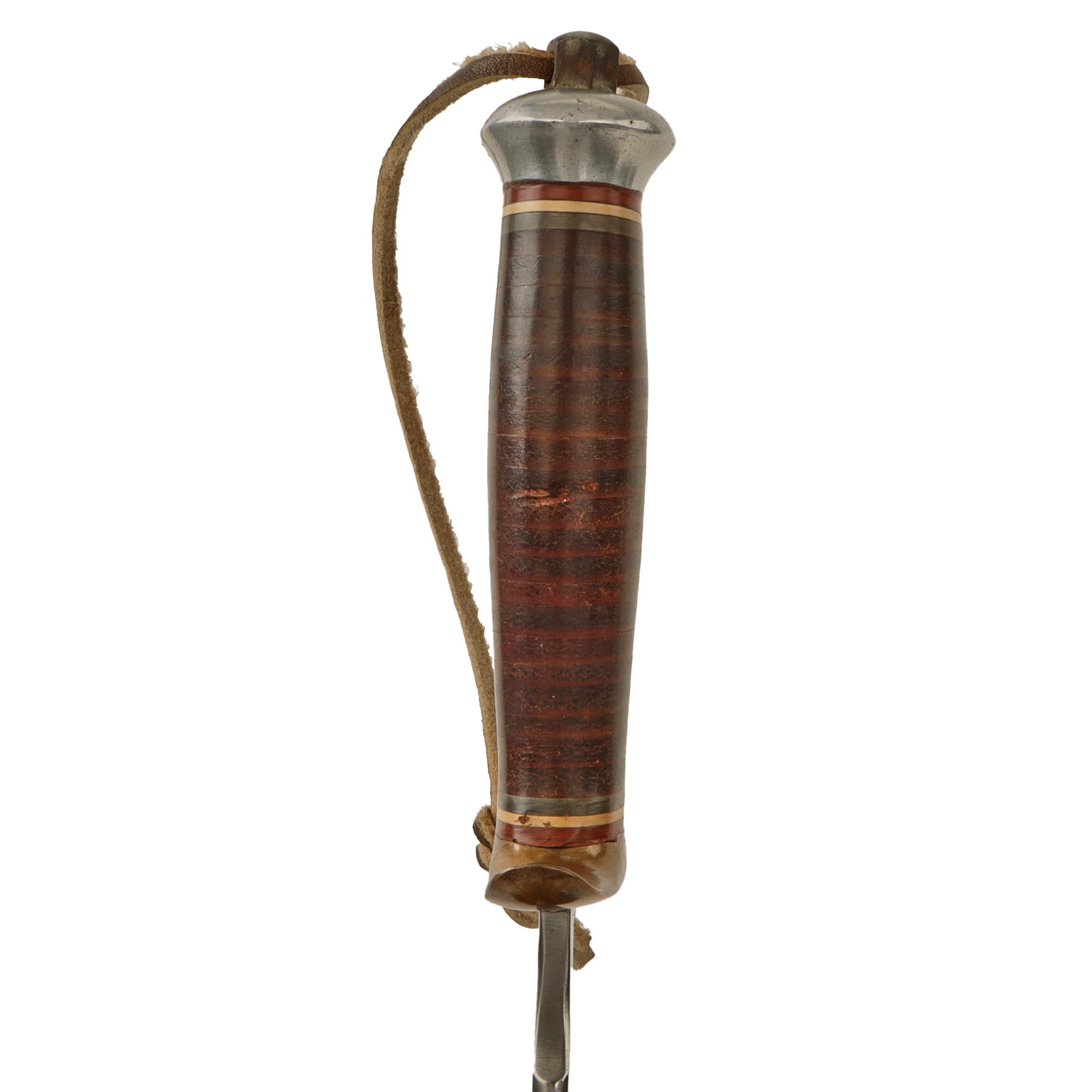 Brass cross guard, with white and black spacers on either side of the leather washer grip, an aluminum pommel cap and a hexagonal pommel nut with leather thong. The knife comes with its original unmarked Randall brown leather sheath, complete with intact securing strap with whetstone. The whetstone appears to be partially stuck inside, so you know it’s always been with the set!