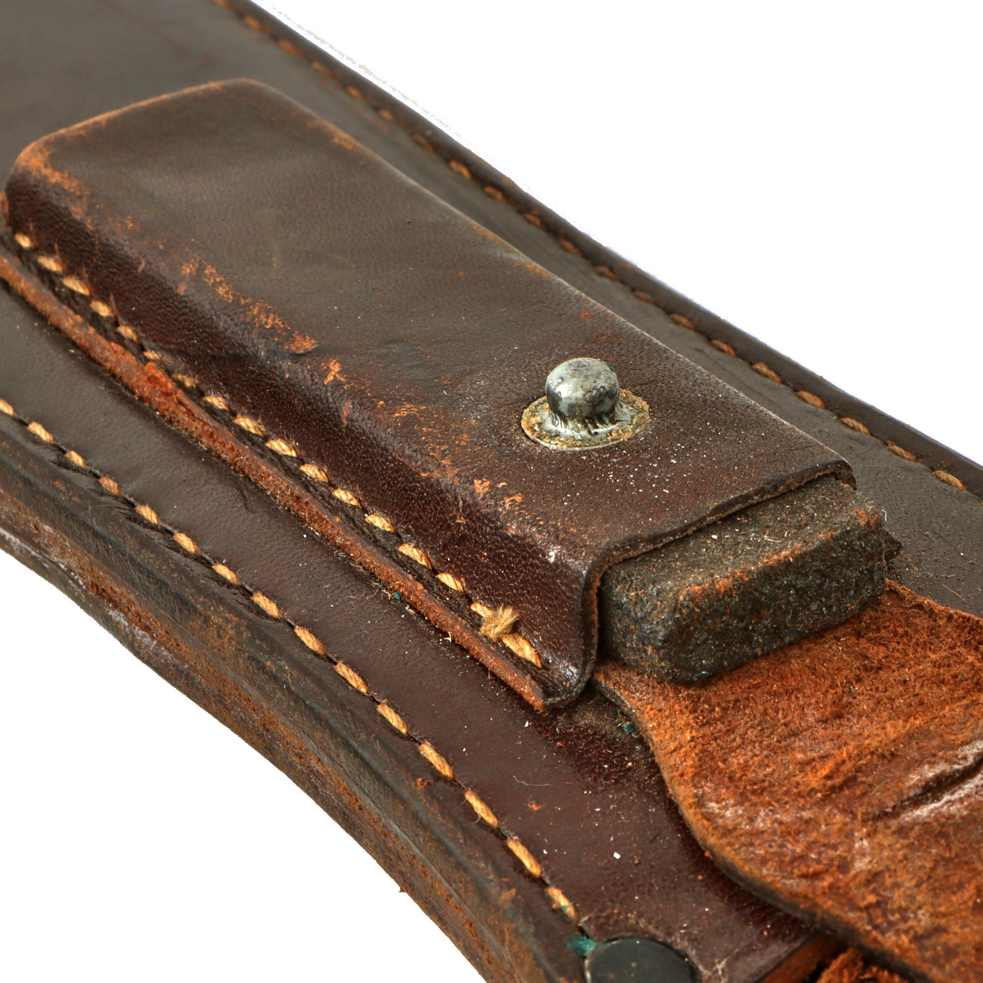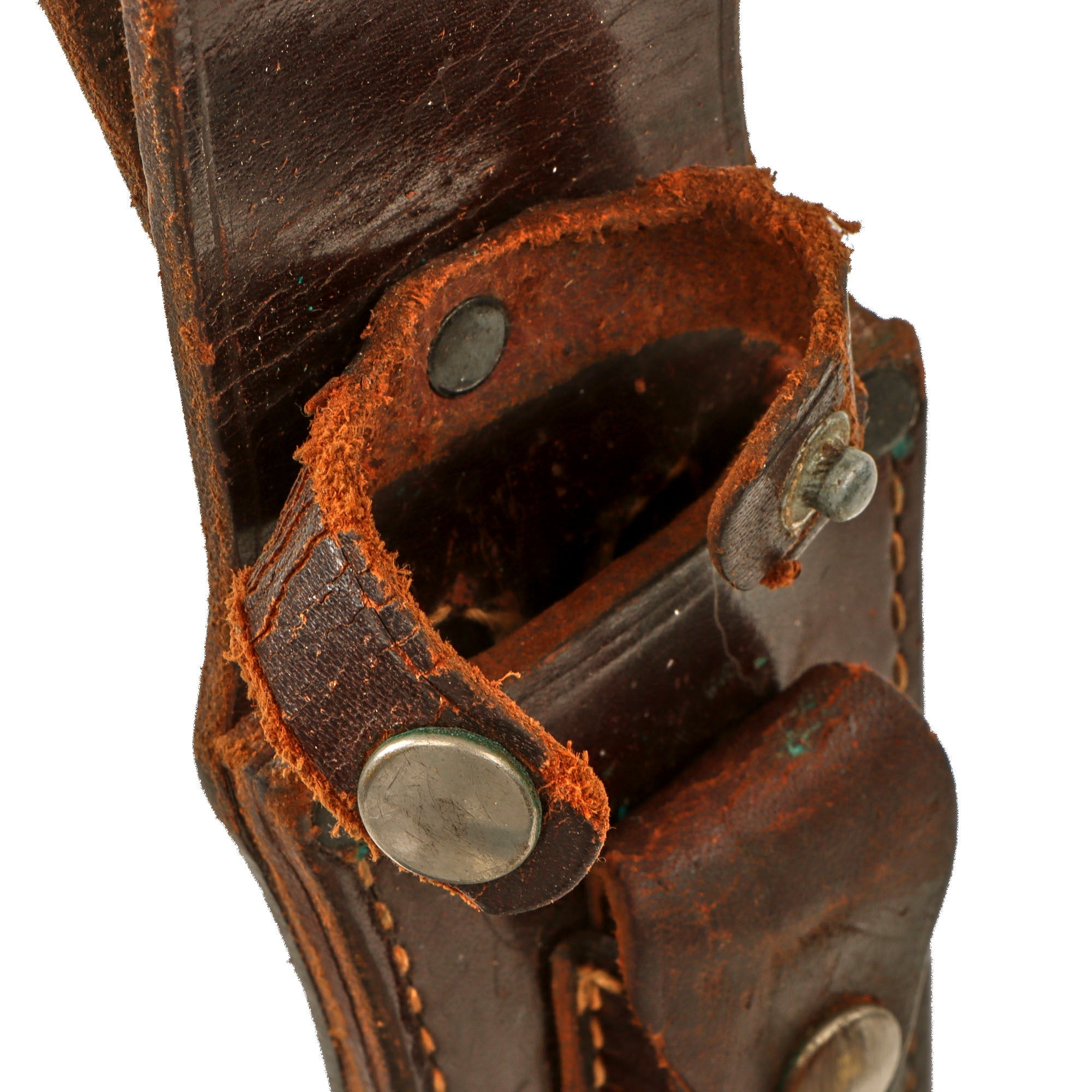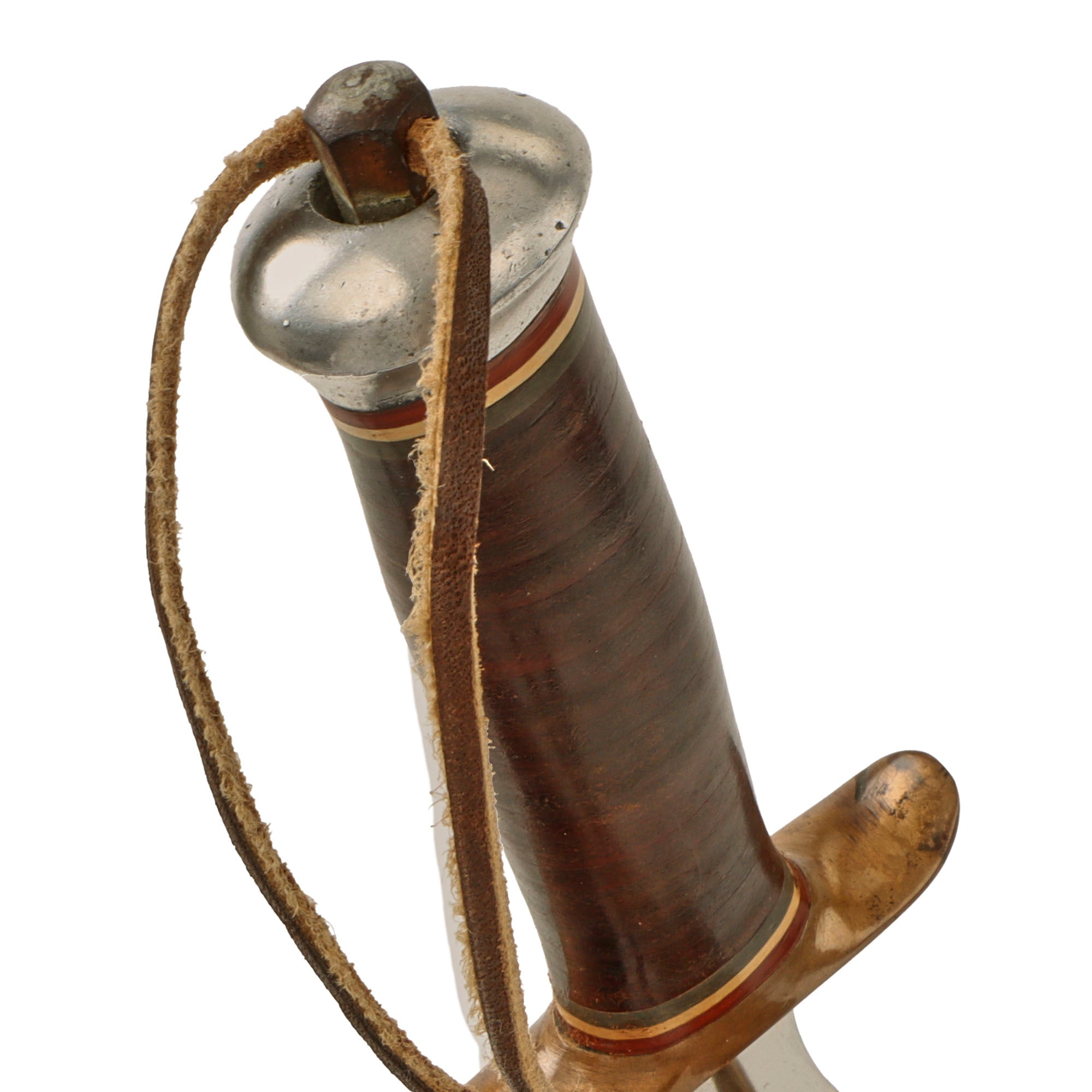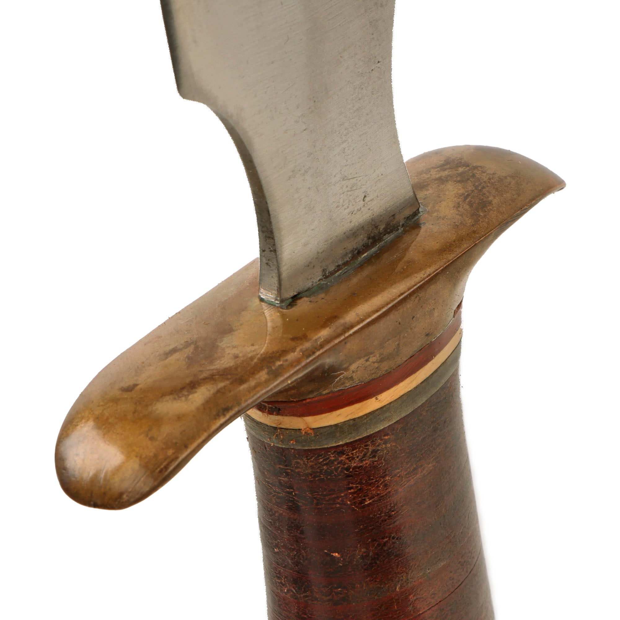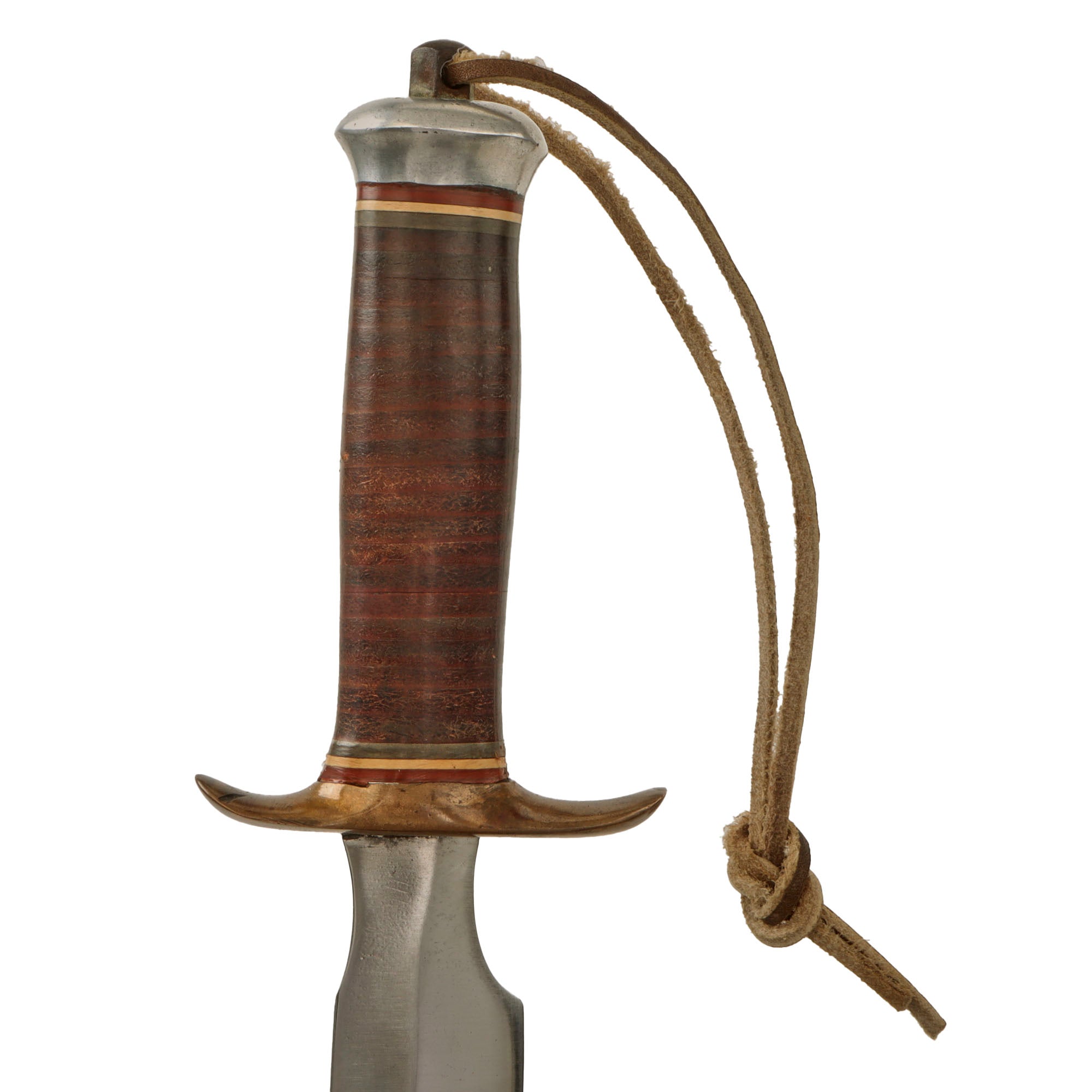 Condition is great overall, the blade has crisp original polish with an overall bright finish showing some light gray patina, and very small patches of oxidation here and there. There are signs of period sharpening marks on the edge. The guard has an attractive, aged patina with some small scratches and dings. The grip shows some very minor scratches and scuffs on the leather. However, the leather washers are in good solid condition. Extremely light oxidation is visible on the pommel nut with some dings and scrapes exhibiting. Overall, the knife, while showing signs of honest period use, and storage/handling wear over the last several decades, is in very good condition.
