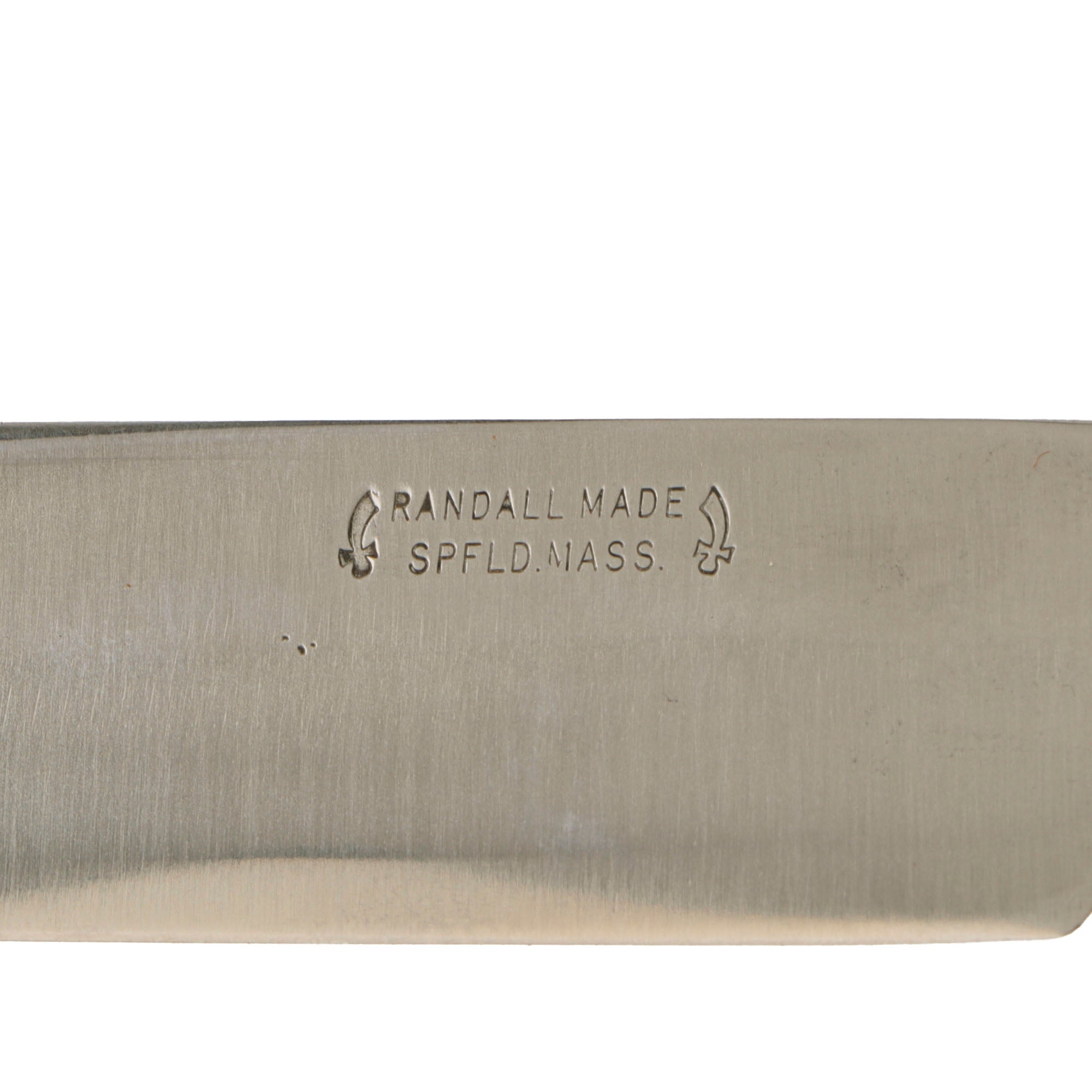 Produced in response to the greatly elevated demand for Randall knives during WWII, the Springfield Fighting Knife was produced by the Northampton Cutlery Company based on design specs and a prototype knife supplied by Bo Randall himself. Production was limited, due to restrictions on wartime material and an unwillingness to compromise on the high-quality steel needed to make a proper fighting knife, with only around 1,200 believed to have been manufactured. The knife measures 12 3/4 inches overall, with a 7 3/4 inch carbon steel blade, outfitted with a 1 1/2 inch sharpened false edge and the scimitar flanked address reading "RANDALL MADE / SPFLD MASS" on the left side of the blade.