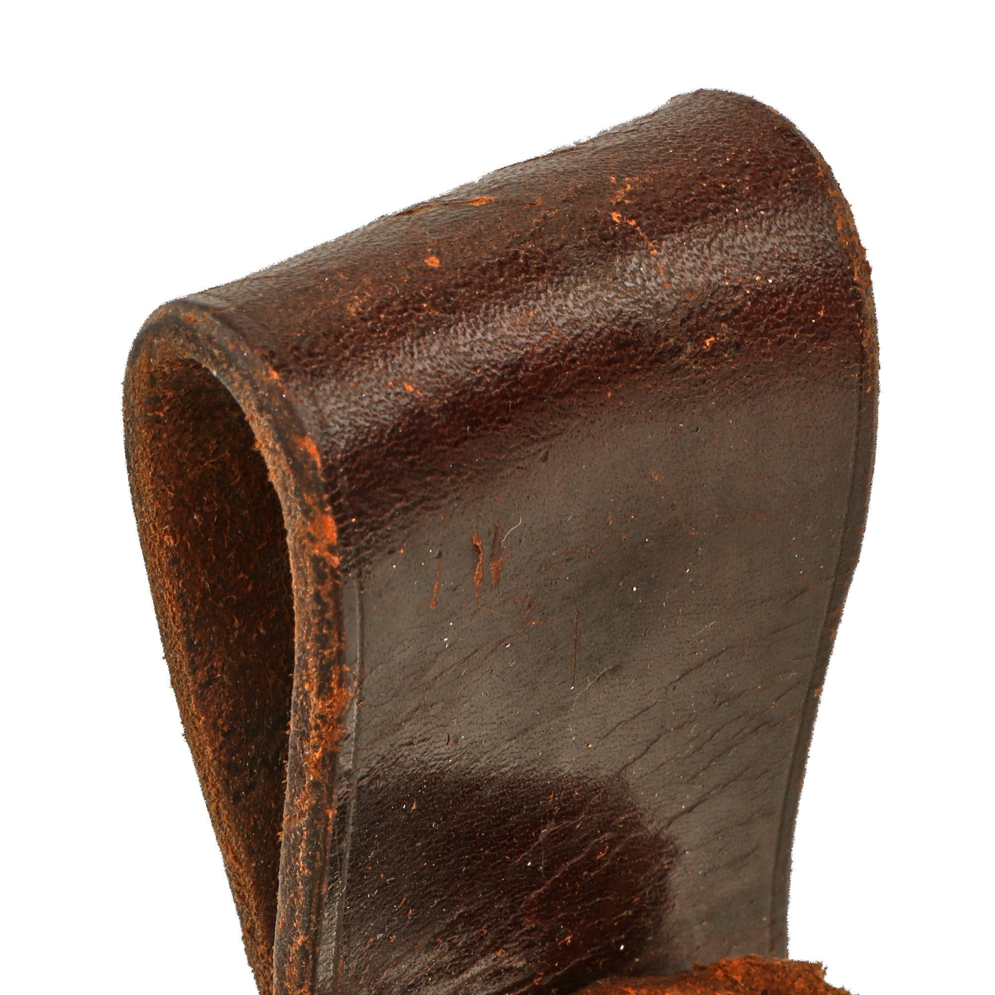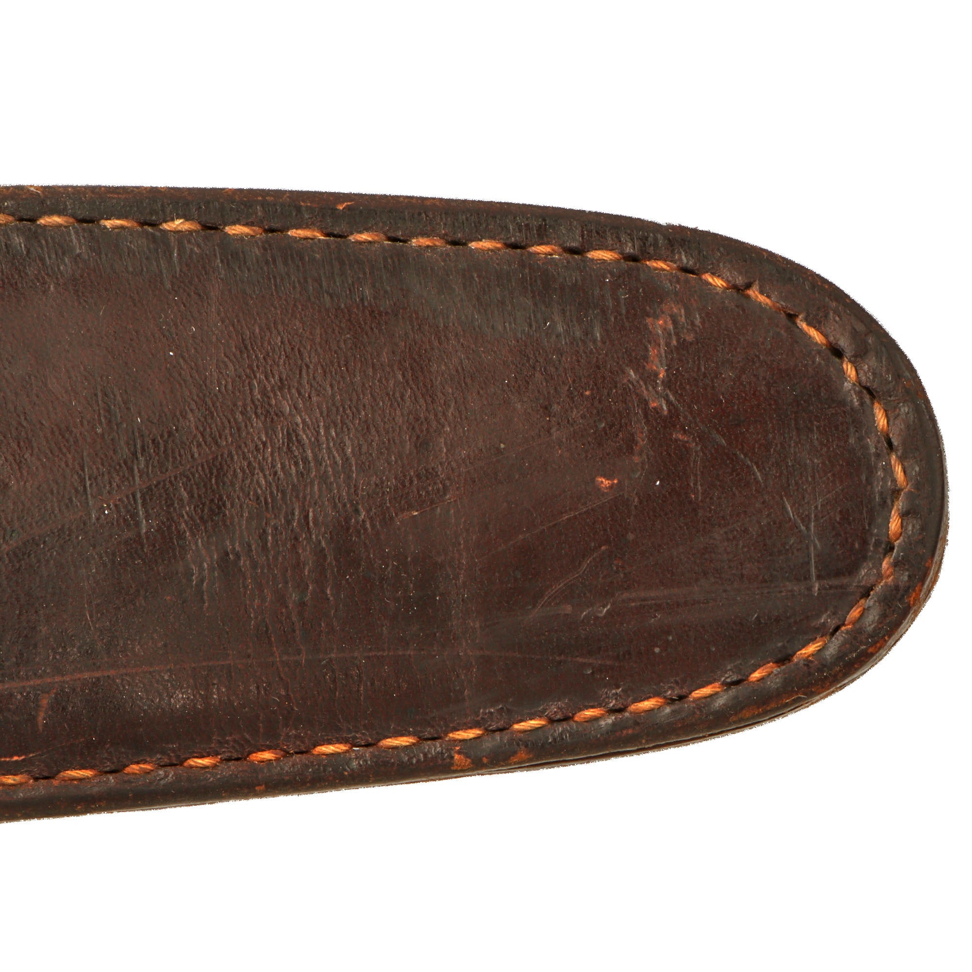 The original Randall Sheath is also fine with tight stitching, attractive original russet brown finish, intact closure strap, and functional snap on the whetstone pouch. Overall, the leather is in very good order, and is nice and pliable, expect on the securing closure strap, which shows heavy crazing and cracking. There is verdigris on the metal fittings, and scuffs and scratches, as expected with any piece of historic leather.