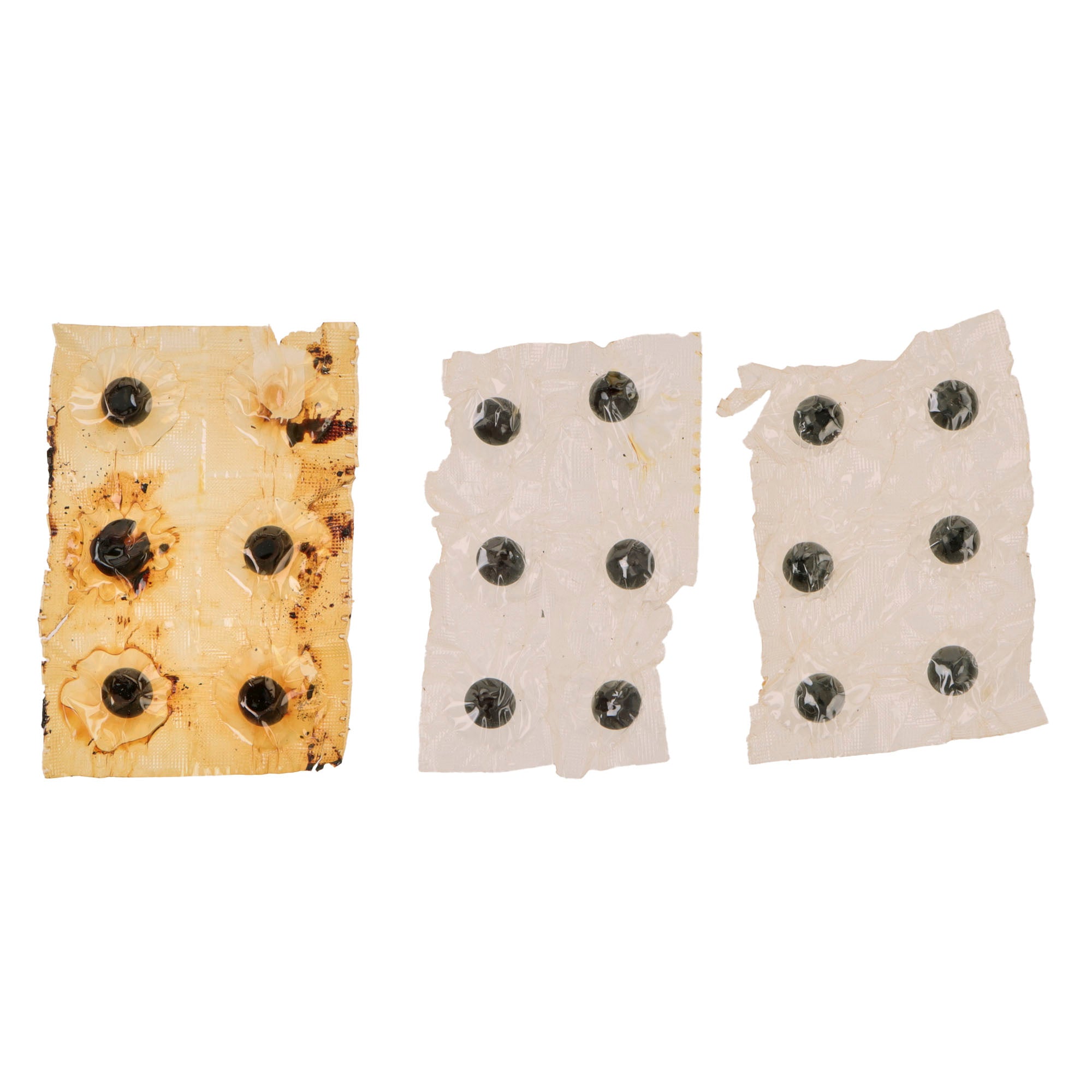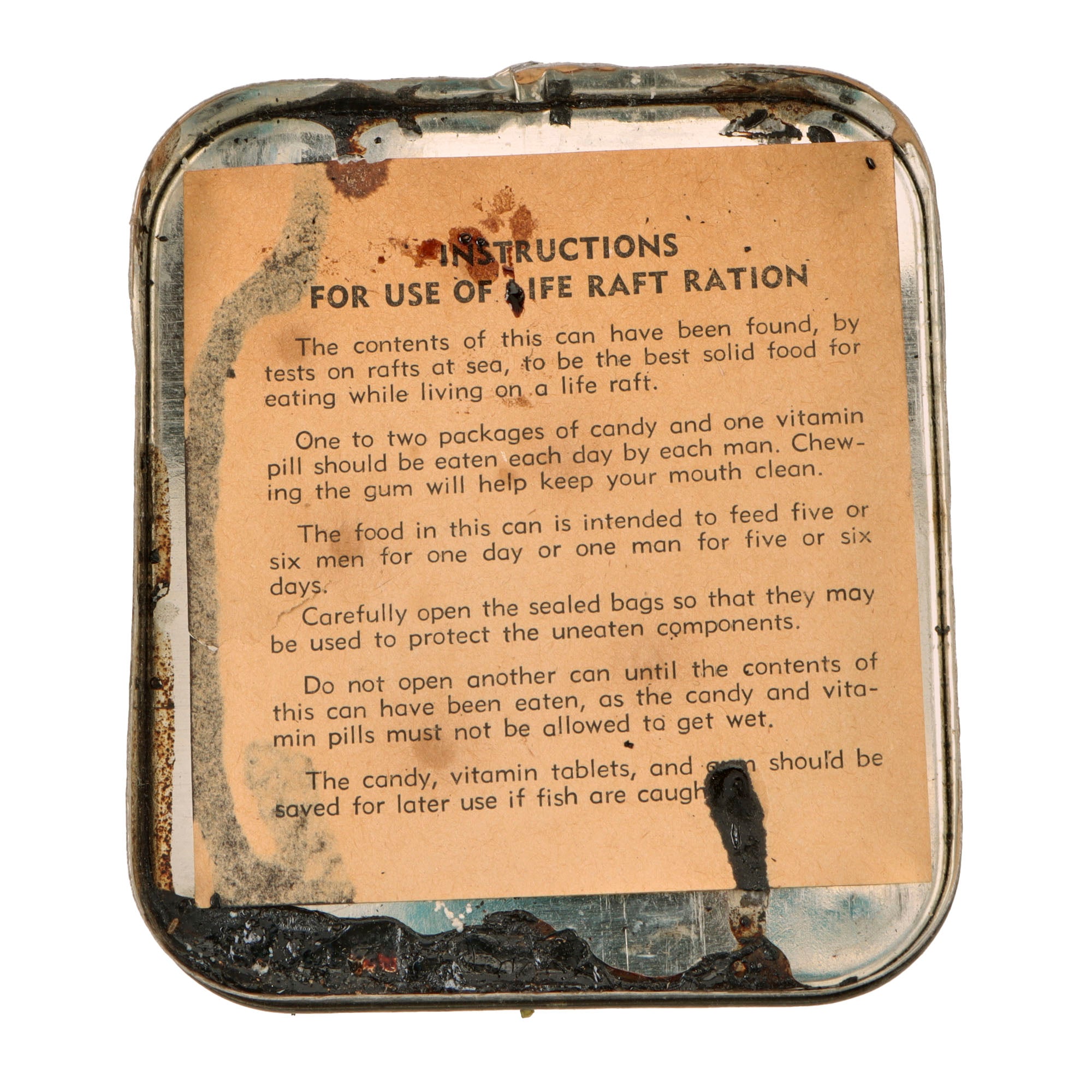- Opened Life Raft Ration with sealed pack of six individual packs of Assorted Charms with heavy residue on the package. All 18 vitamins are retained with some damage to the plastic. The gum does not appear present. Meant for the survival of one man for 5-6 days or 5-6 men for a day.