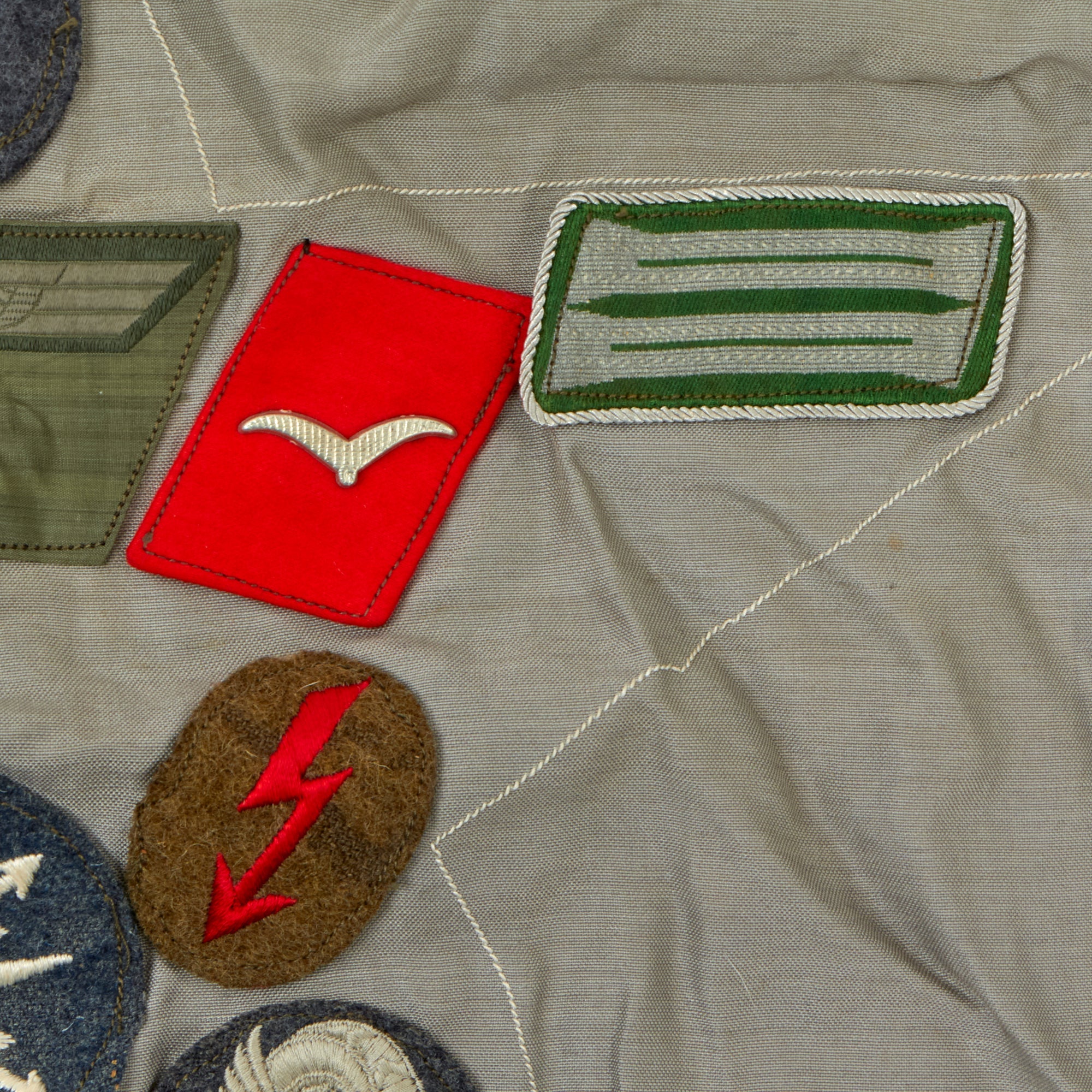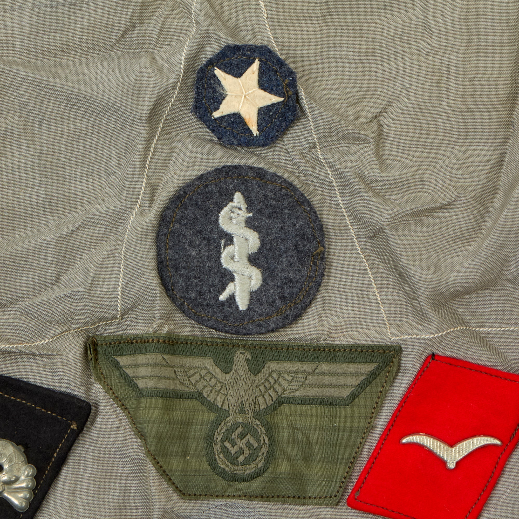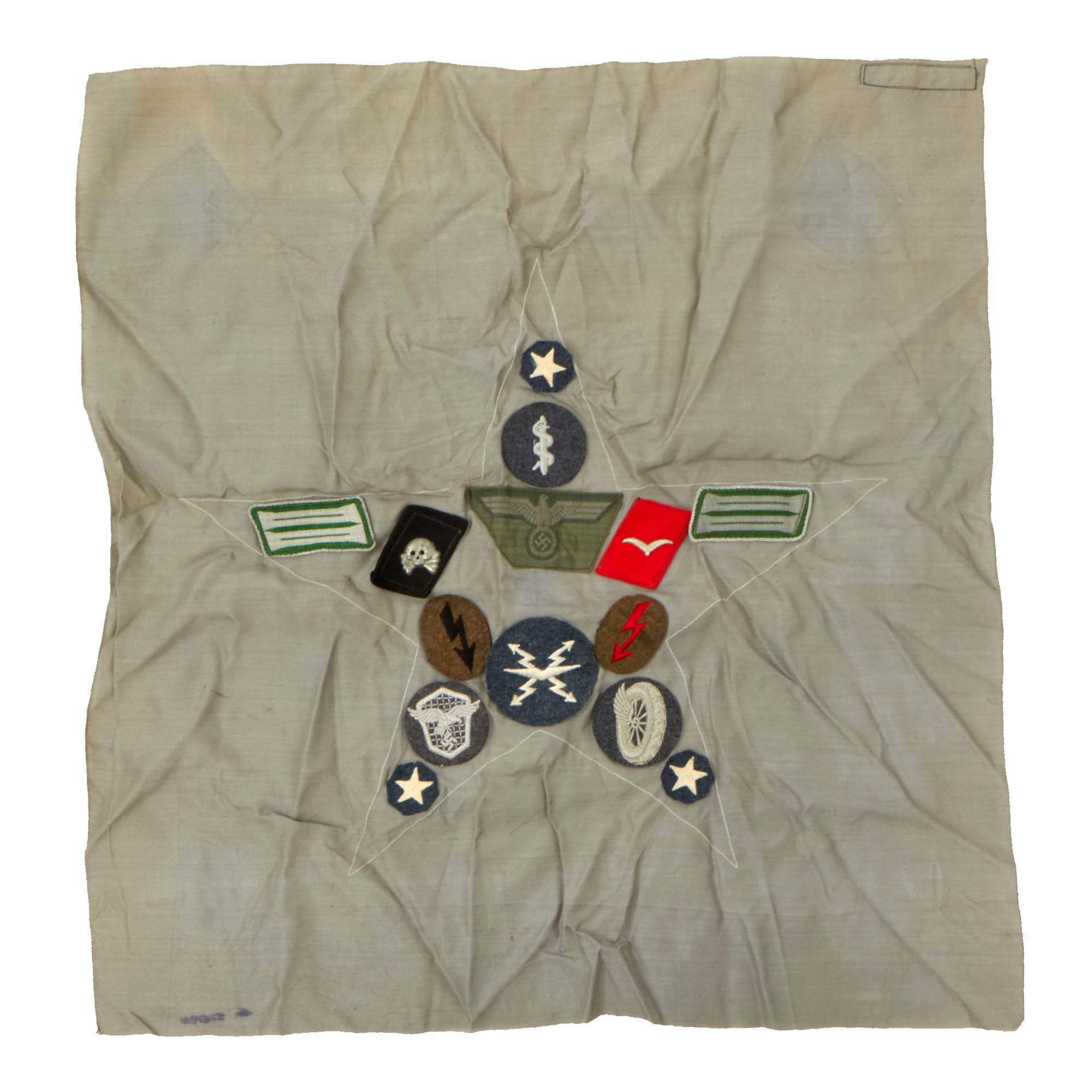 The scarf itself has a machine stitched white 5 pointed star outline, inside of which are a variety of different German Wehrmacht insignia, which are from the Heer Army, Luftwaffe Air Force, and other German organizations, numbering 14 items in total.