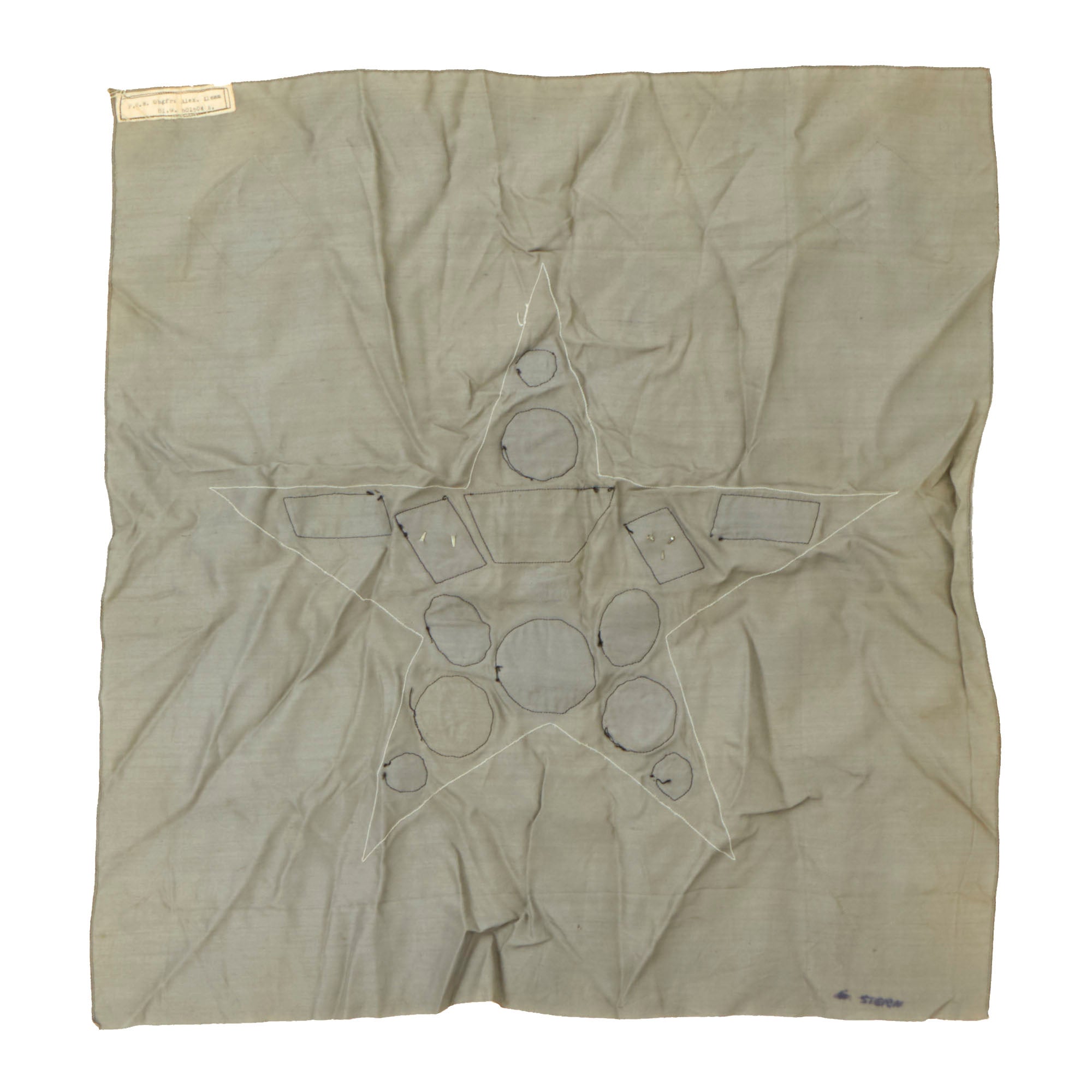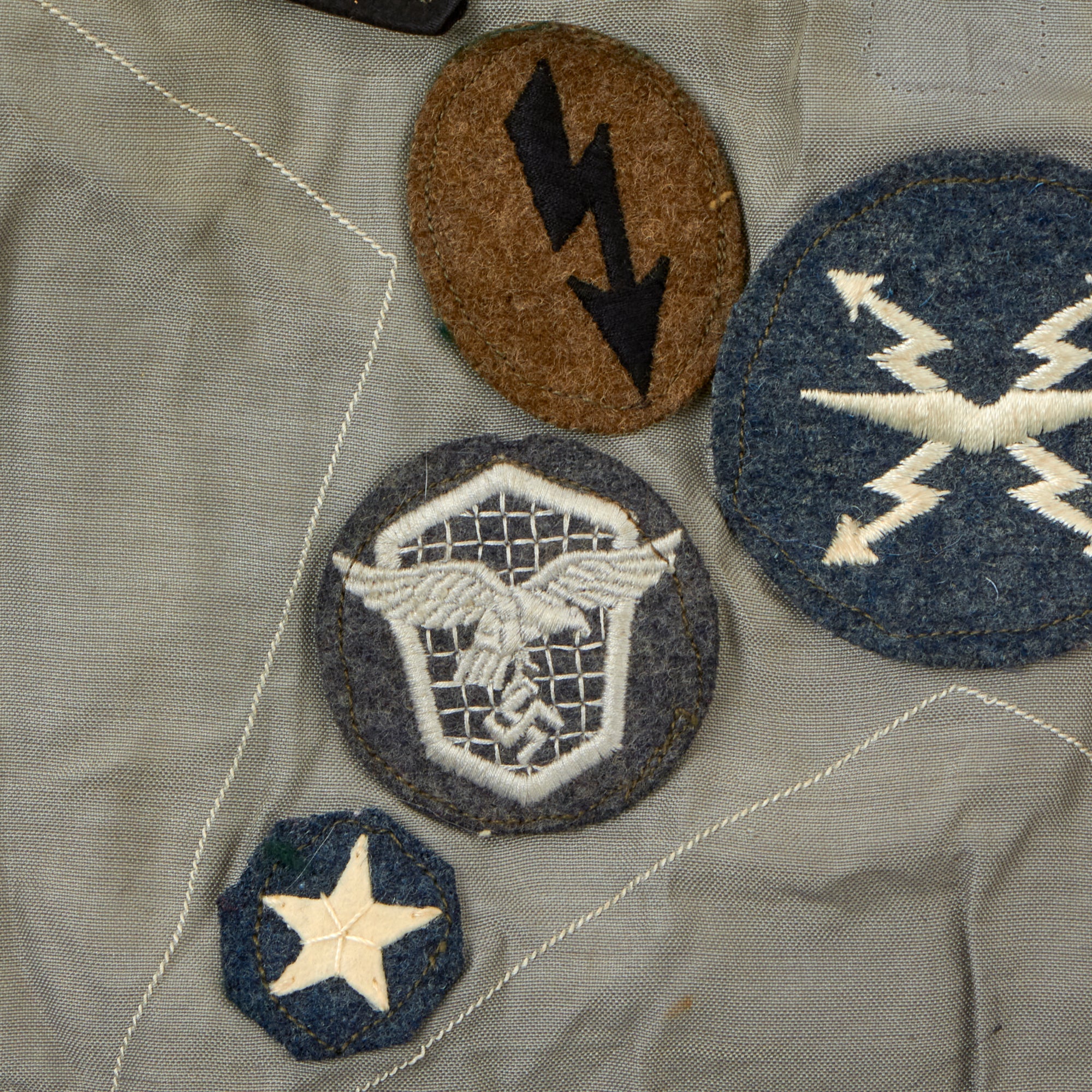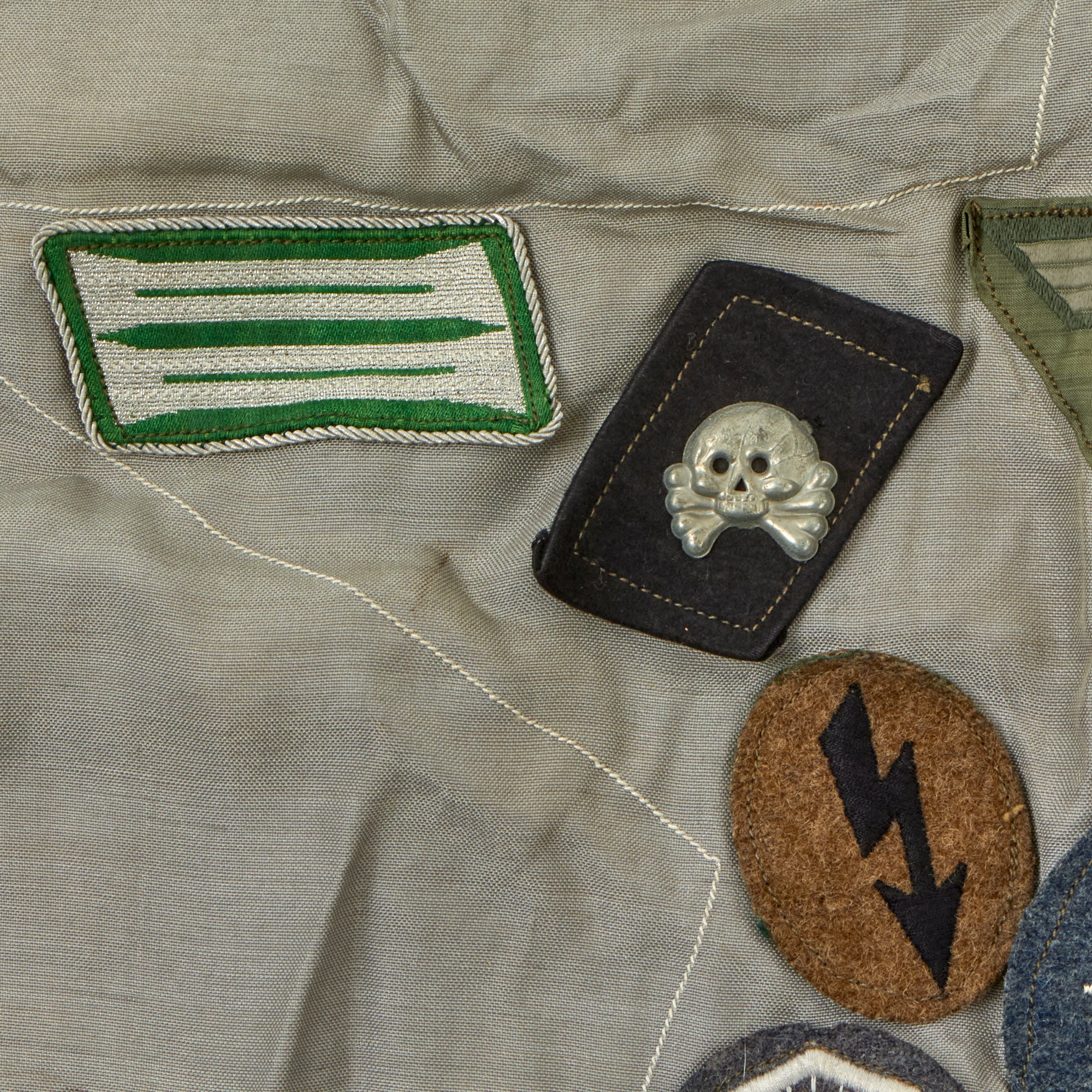 The scarf itself has a machine stitched white 5 pointed star outline, inside of which are a variety of different German Wehrmacht insignia, which are from the Heer Army, Luftwaffe Air Force, and other German organizations, numbering 14 items in total.