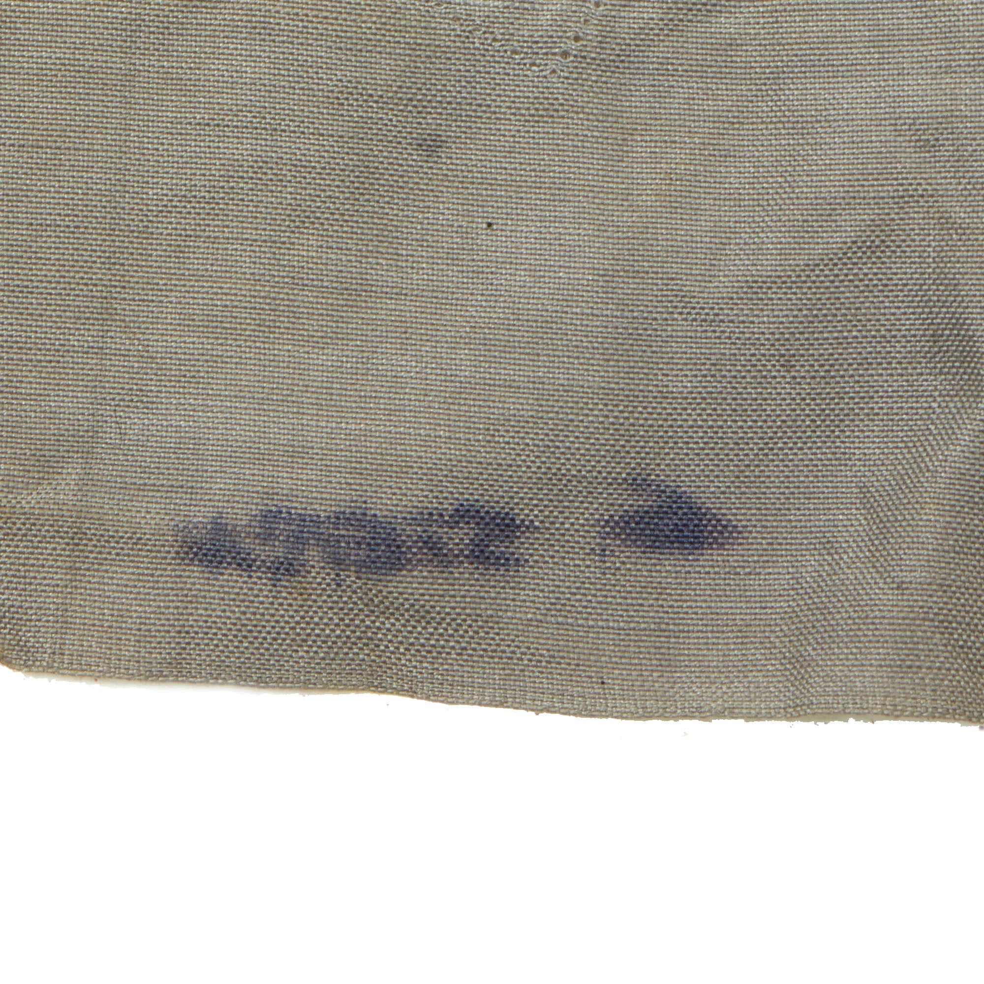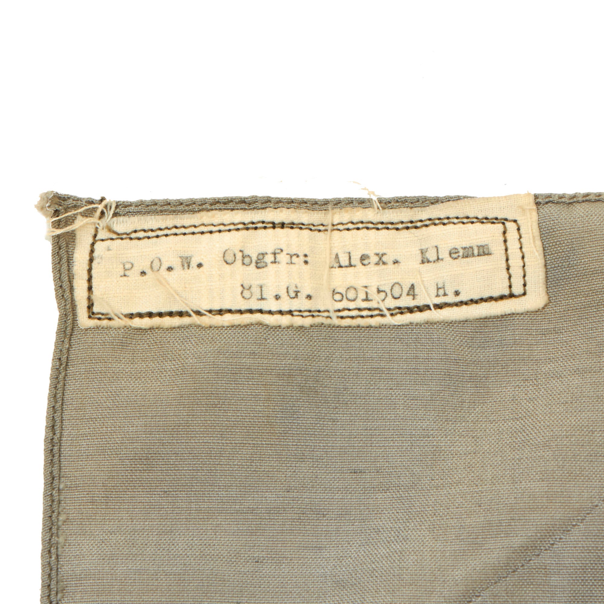 Original Items: One of a Kind Set. This is really a special item, the likes of which we have really not seen before. It is a 24" x 23" light gray scarf which was owned by a German POW being held in a U.S. POW camp. The scarf feels like it is made from rayon or a cotton rayon blend, and the reverse it has a POW name tag that reads as follows: