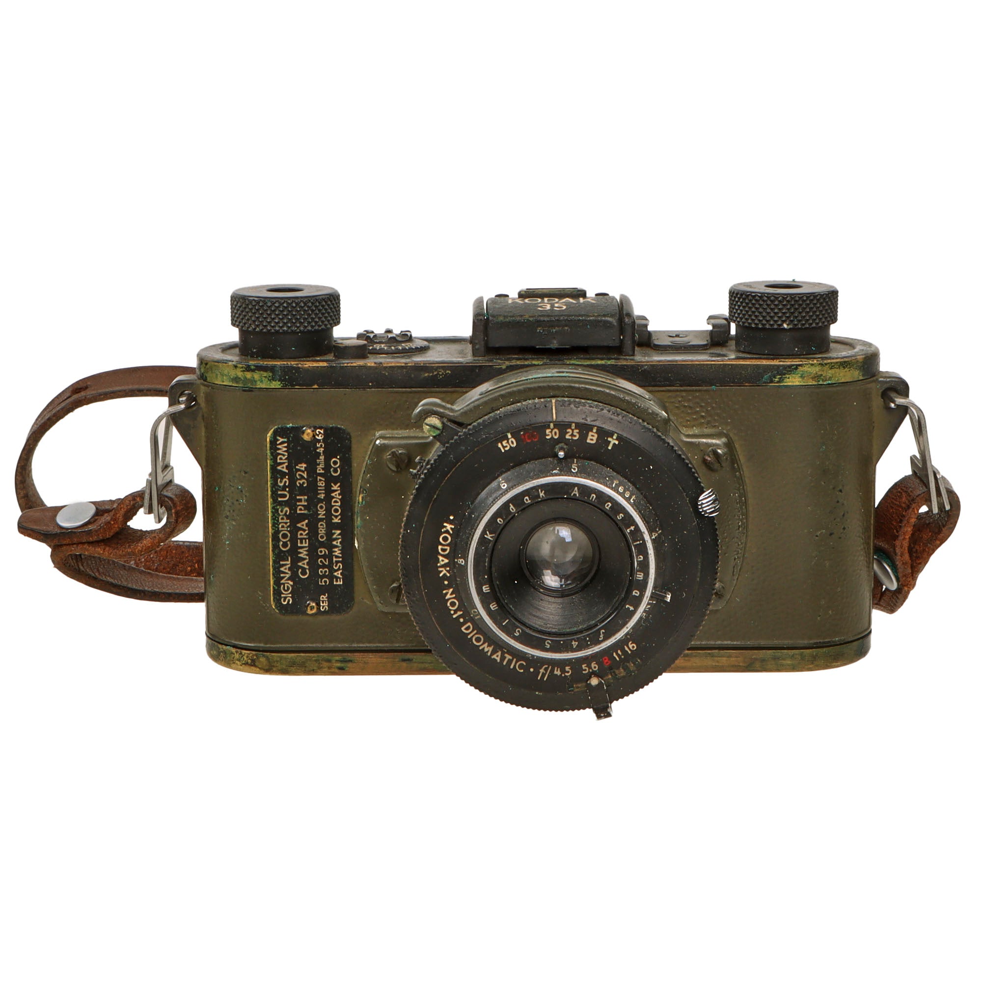 Original Item. Only One Available. The PH-324 was issued throughout WWII to US Army Signal Photographic units as the standard 35mm camera. Included with this camera was an enlarger, photo paper, film, and chemicals needed to develop both in the field. Kodak produced the camera, a standard Kodak 35, in OD green exclusively for the federal government during the war. The camera used a leaf shutter and basic three element design to produce images on either Kodak Microfile or Kodak Super-XX film. A +2 Portra lens was included for copying documents with the accompanying stand in Photographic Set PH-261.