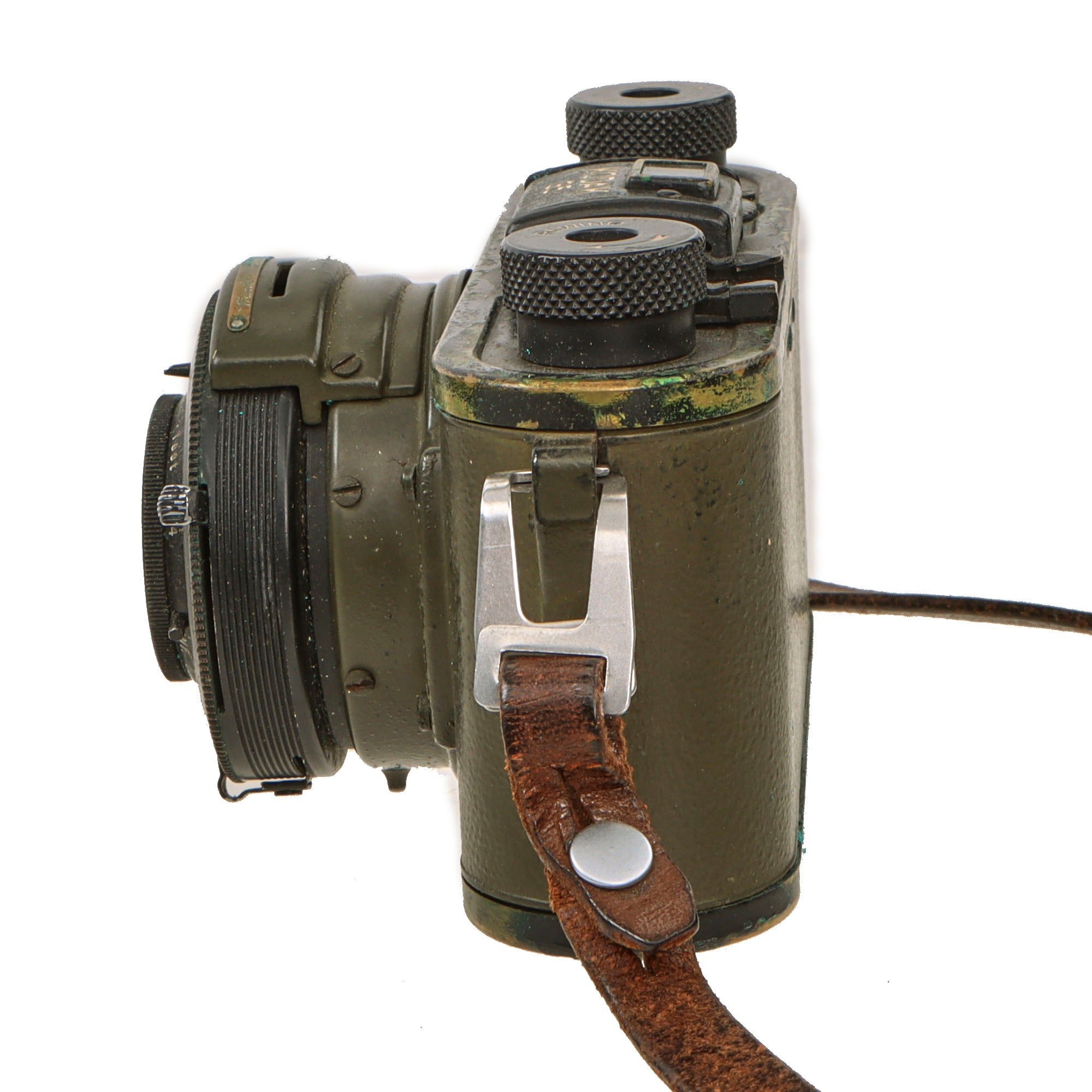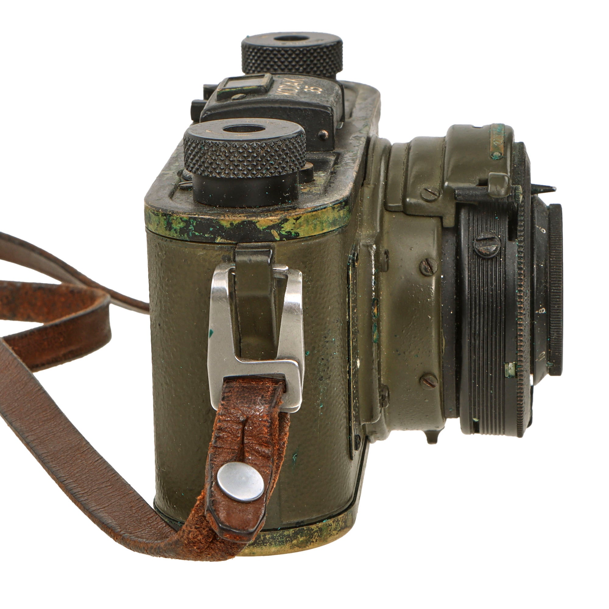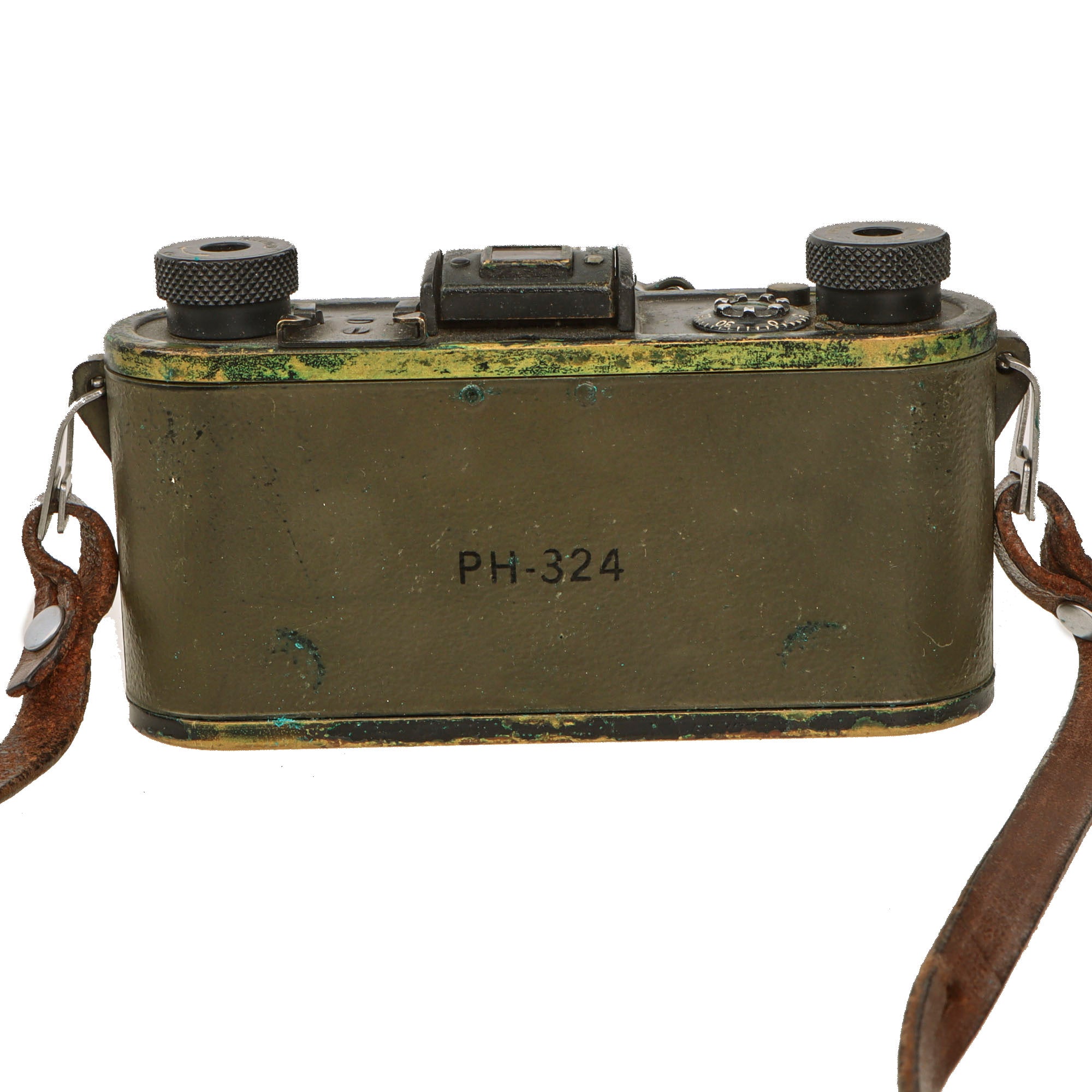 The back of the camera is stamped with the Army designation PH 324. The camera appears in good functional condition although we cannot test it for functionality. There is no film currently in the camera. The original leather strap is in good shape.