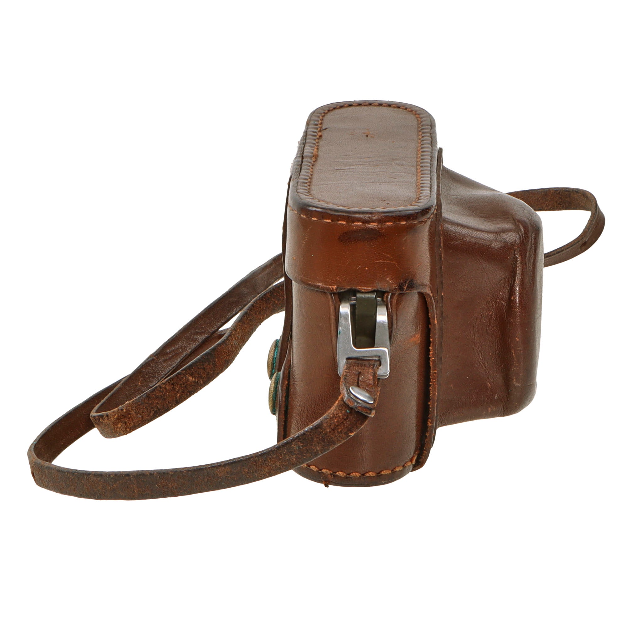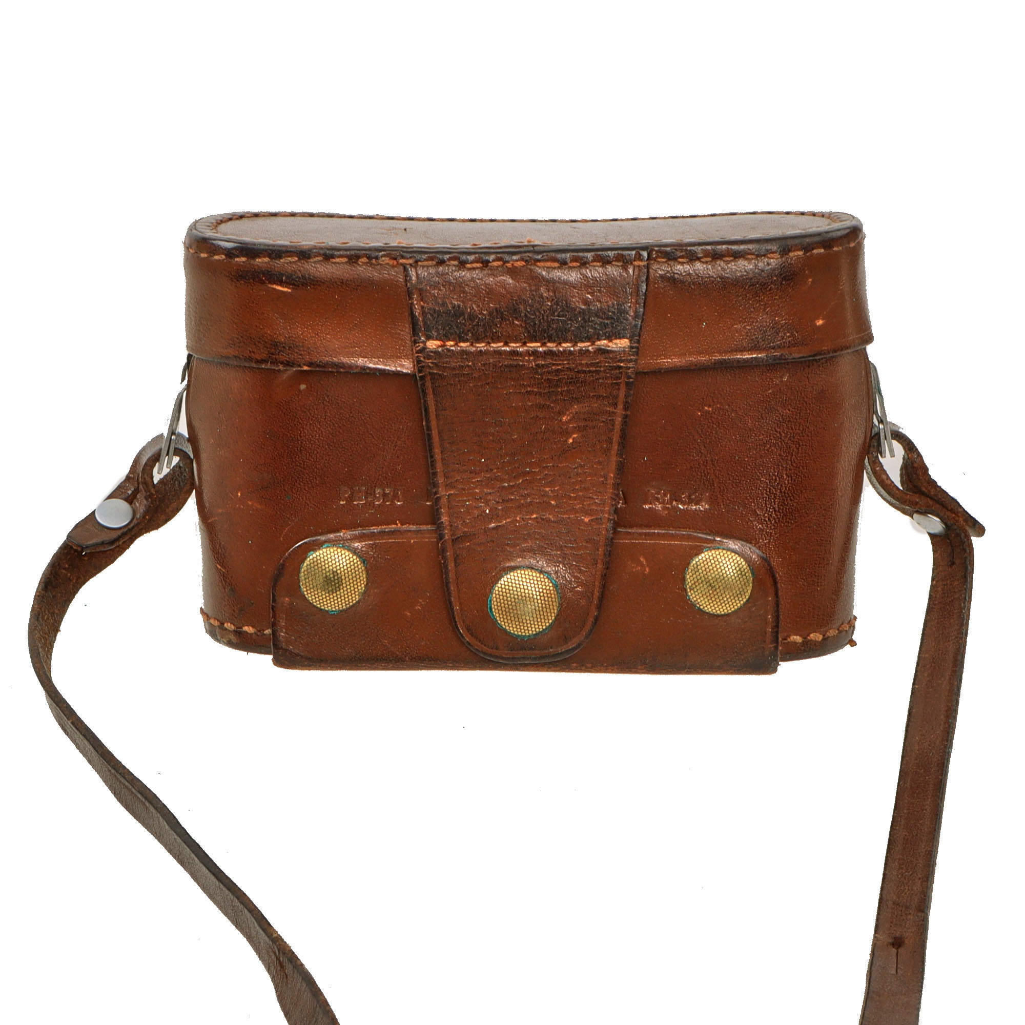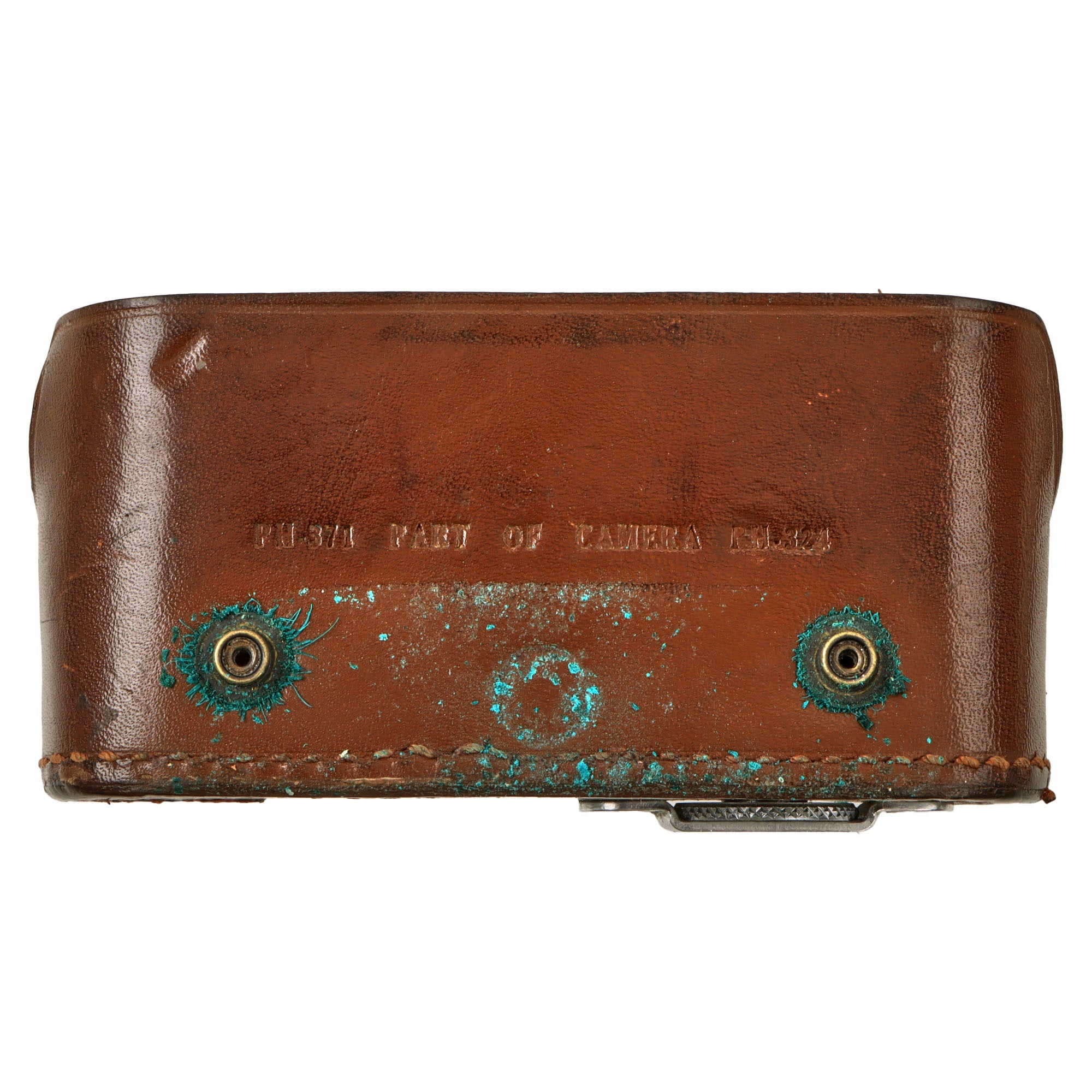 The small circular leather piece that covers the lens in the case has fallen out but is still intact. The metal fittings and snaps have verdigris, but otherwise the leather of the case is in good order.
