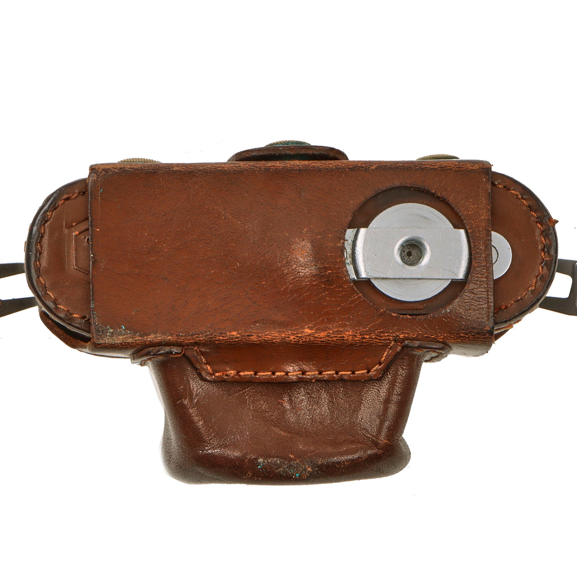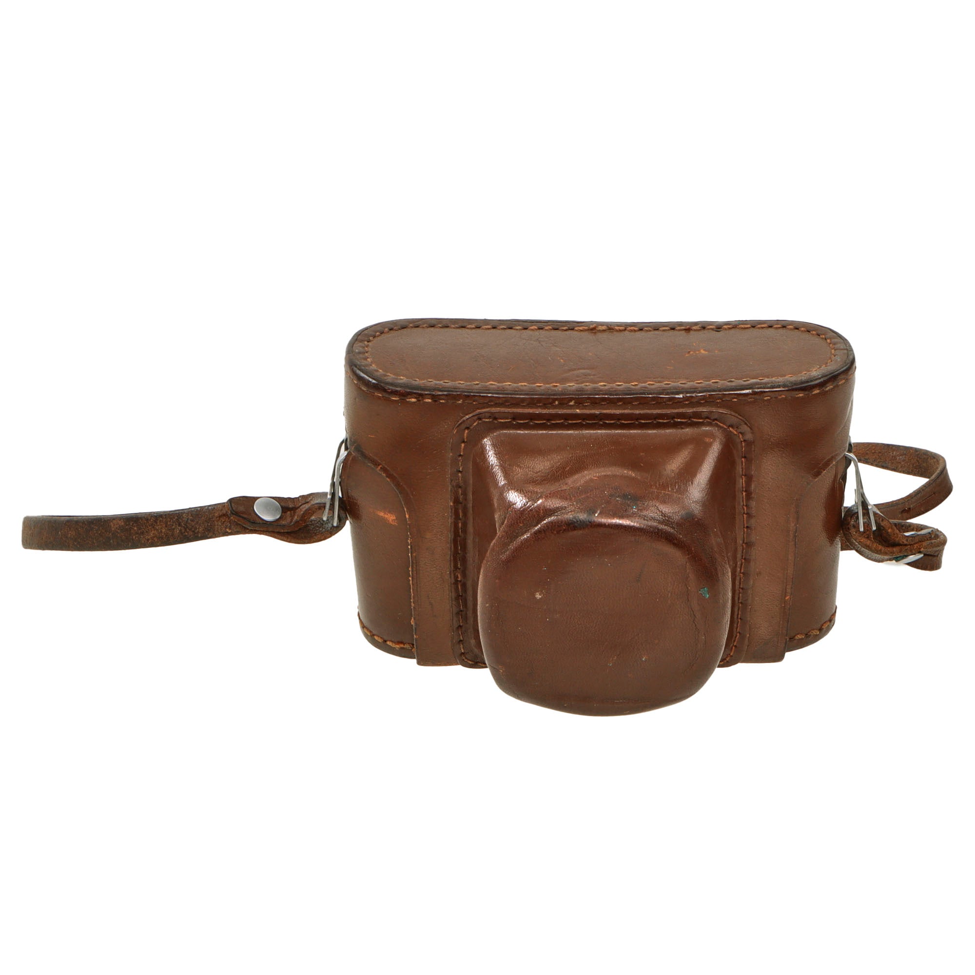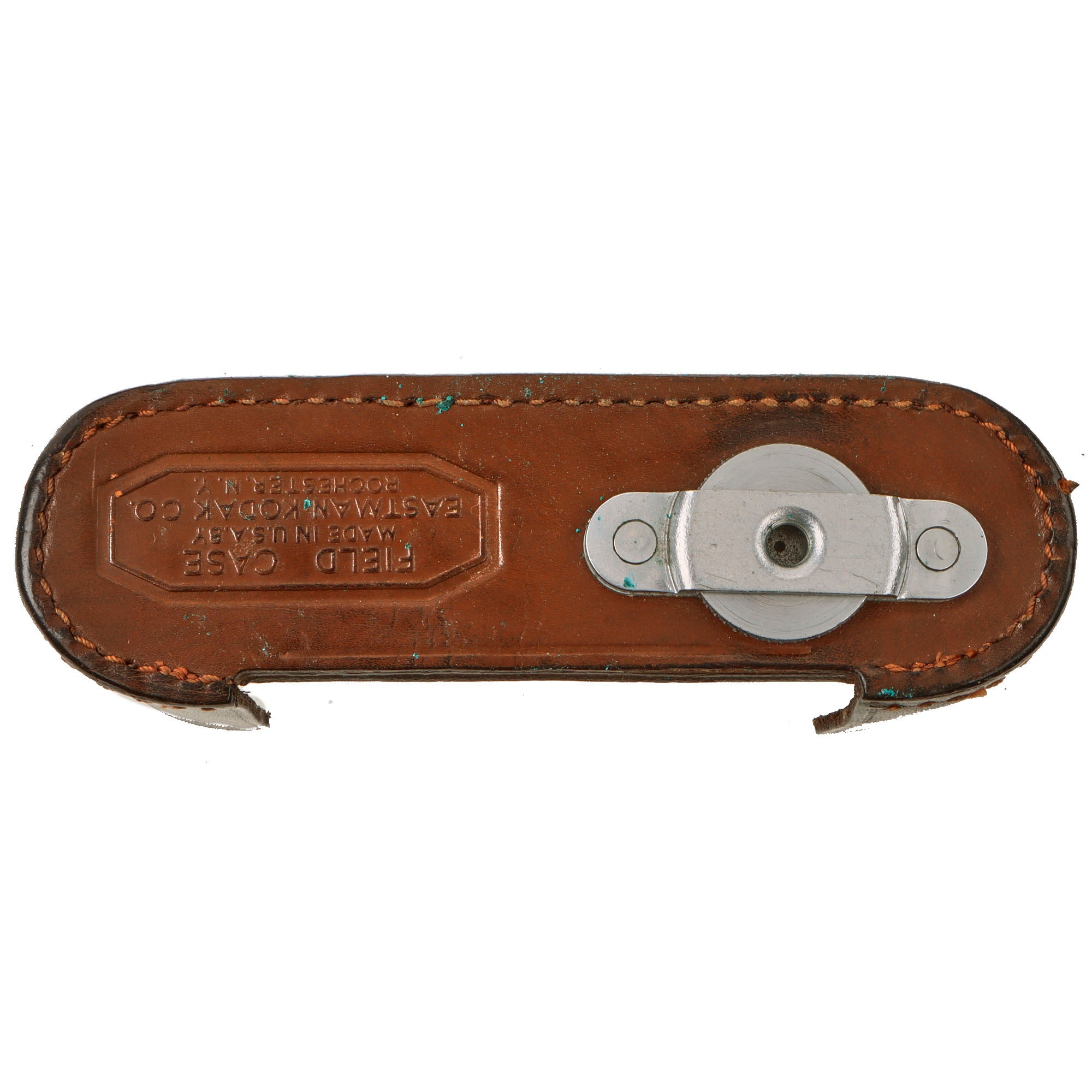 The small circular leather piece that covers the lens in the case has fallen out but is still intact. The metal fittings and snaps have verdigris, but otherwise the leather of the case is in good order.