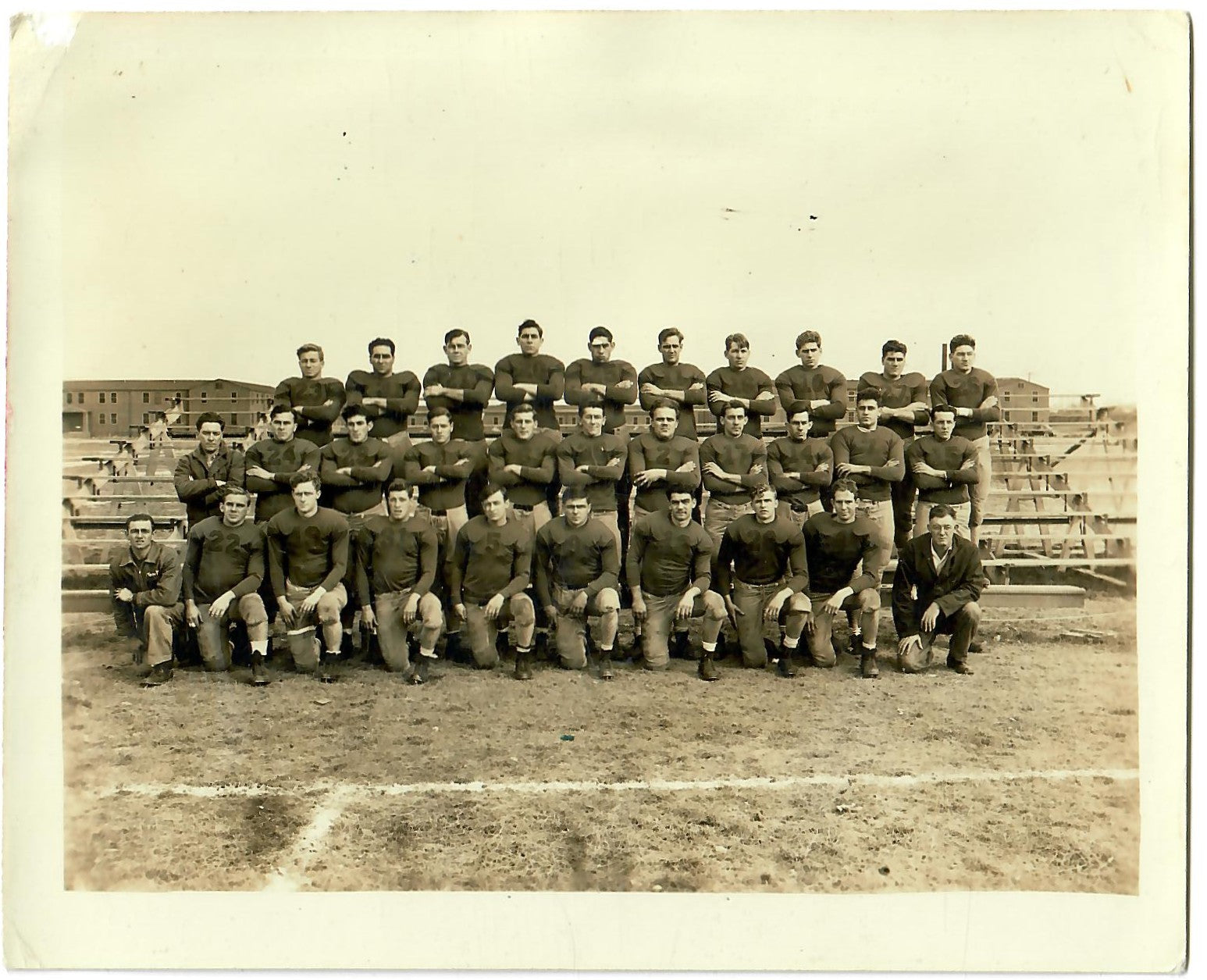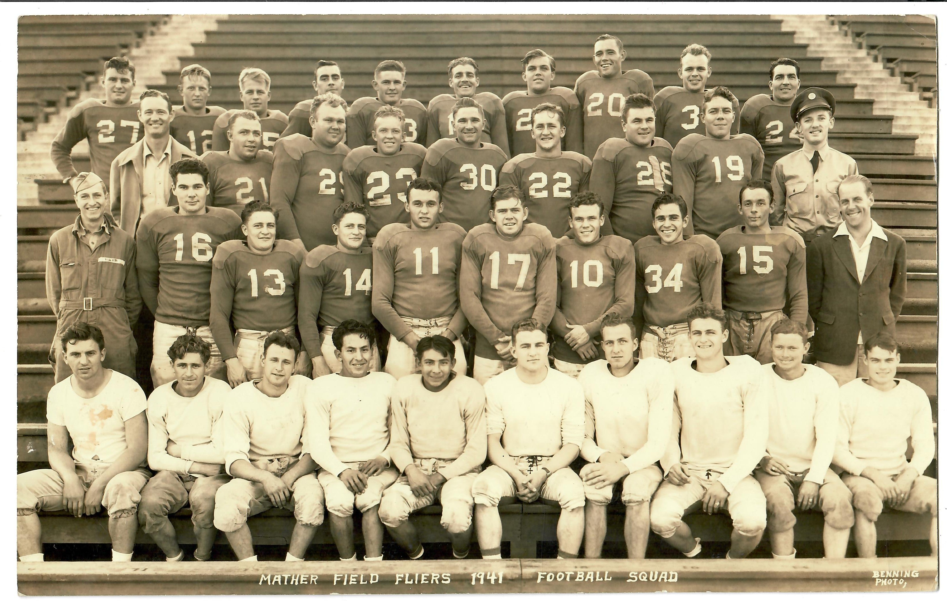 - 6¾ x 10¾” photo of the Mather Field Fliers in 1941, football players. Man on the left has a name tape. Photo taken by M.T. Benning in Sacramento, California.