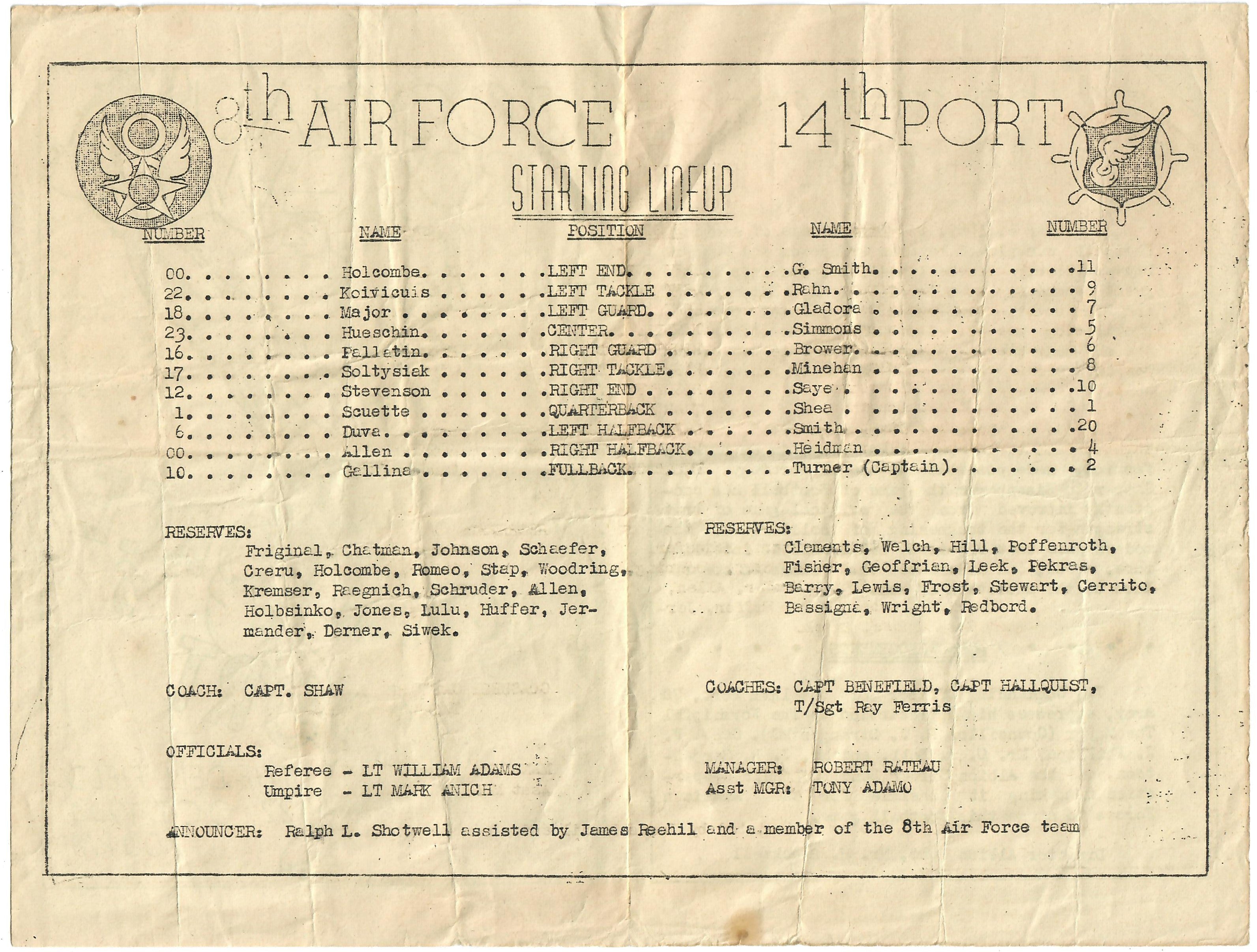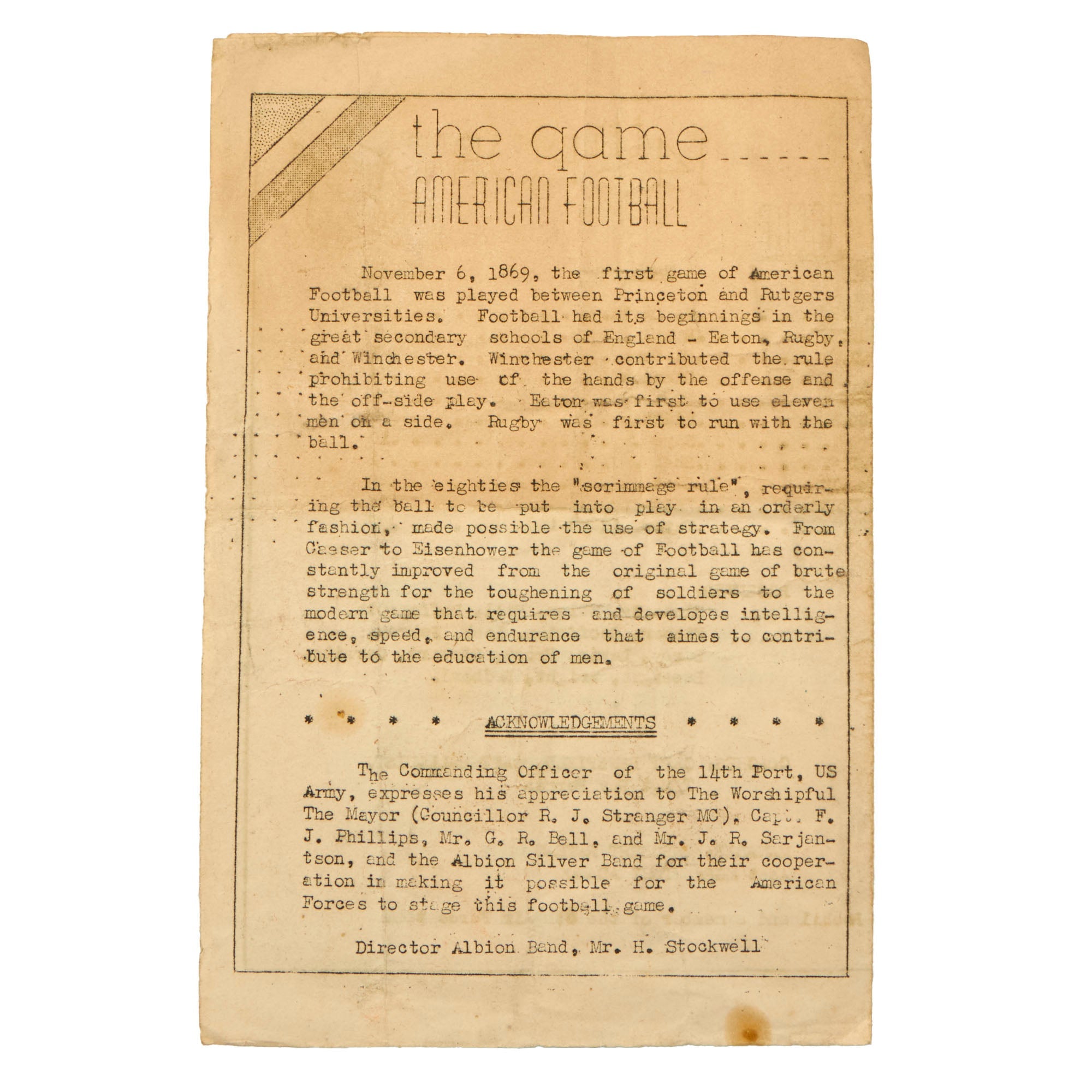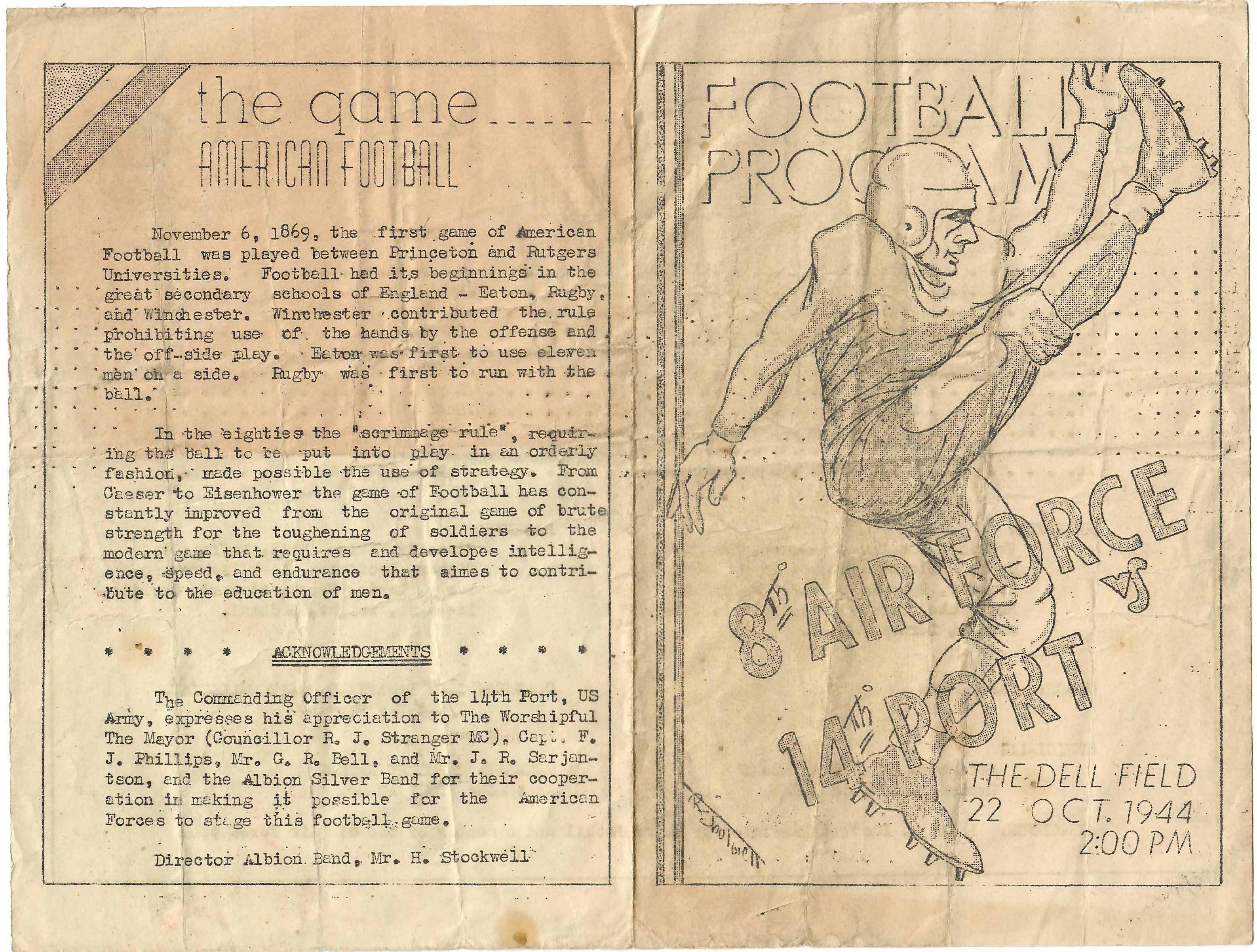 - 1944 Football Program for 8th Air Force vs. 14th Port, with history of Football to the reverse.