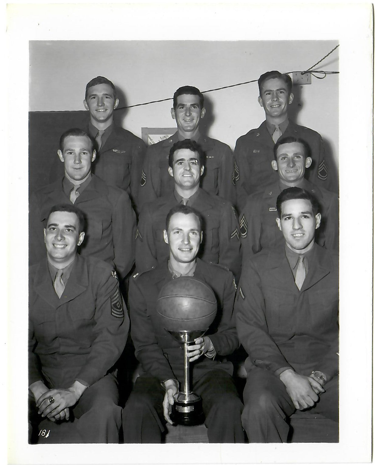 - 4 x 5” photo of WWII soldiers with Basketball trophy. Wearing Army Air Force patches.