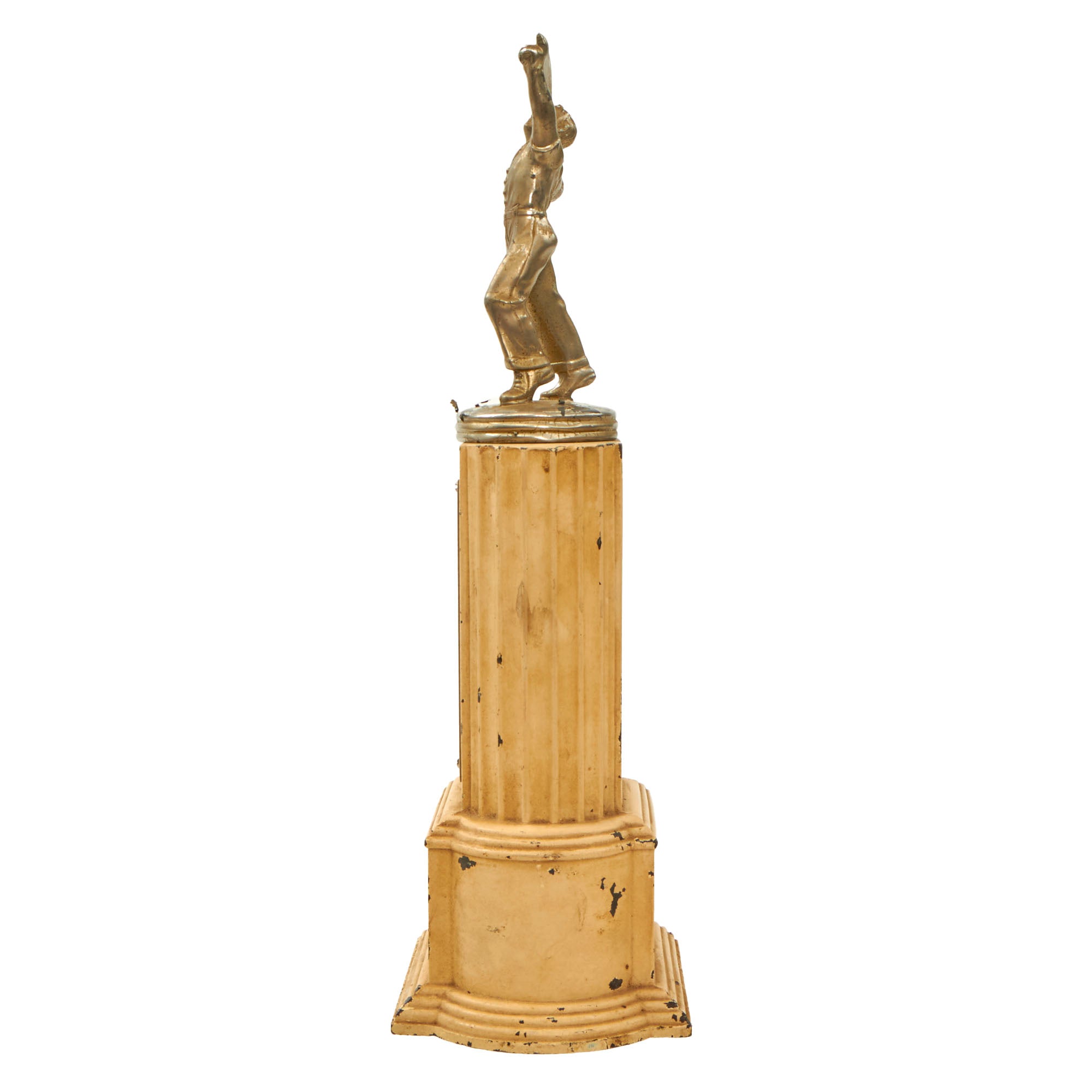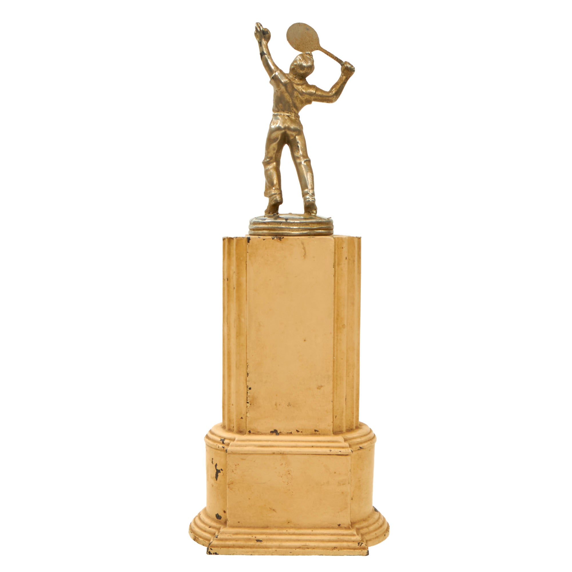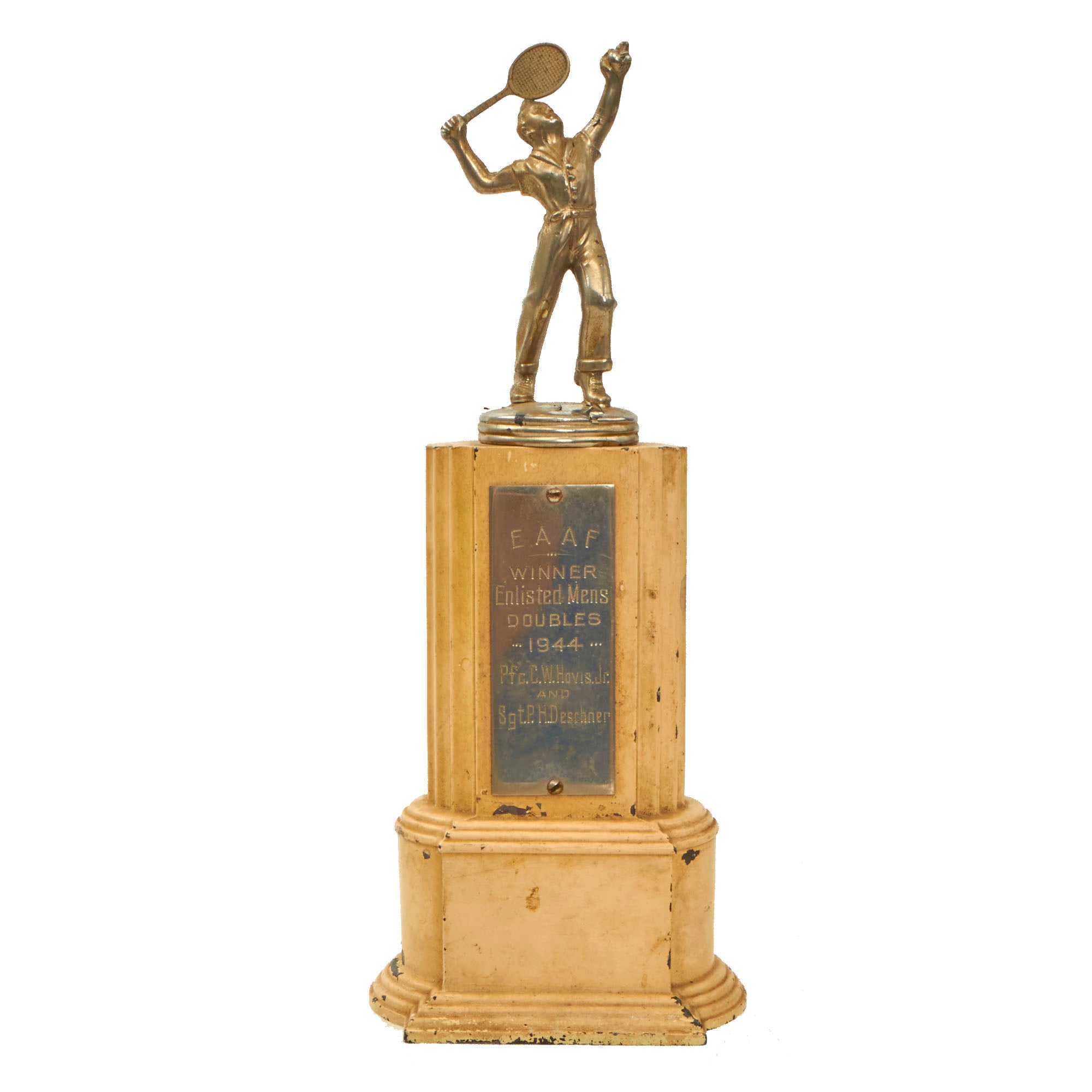 - Tennis Doubles Trophy engraved EAAF WINNER ENLISTED MENS DOUBLES 1944 PFC. C.W. HOVIS JR AND SGT. P.H. DESCHNER. Statue of man playing tennis is a bit loose and plating/paint is chipping. Measures 10” tall.