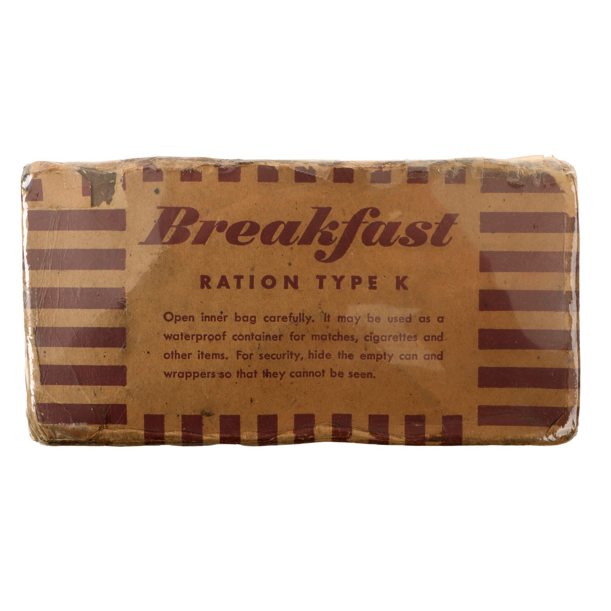 Original Items: Only One Available. The K-ration was an individual daily combat food ration which was introduced by the United States Army during World War II. It was originally intended as an individually packaged daily ration for issue to airborne troops, tank crews, motorcycle couriers, and other mobile forces for a short duration. The K-ration provided three separately boxed meal units: breakfast, dinner (lunch) and supper (dinner).