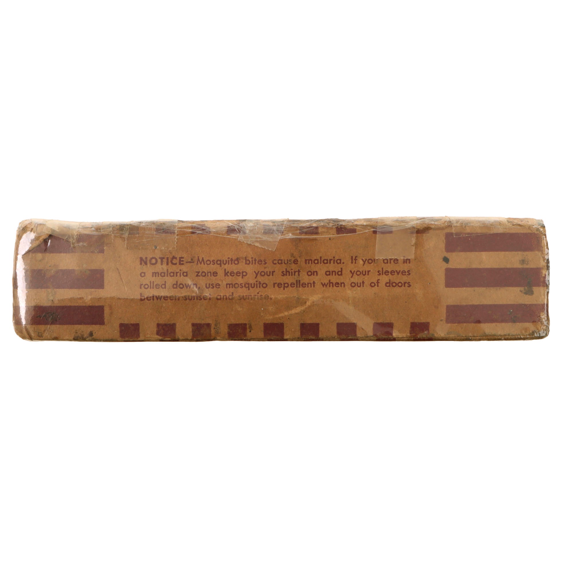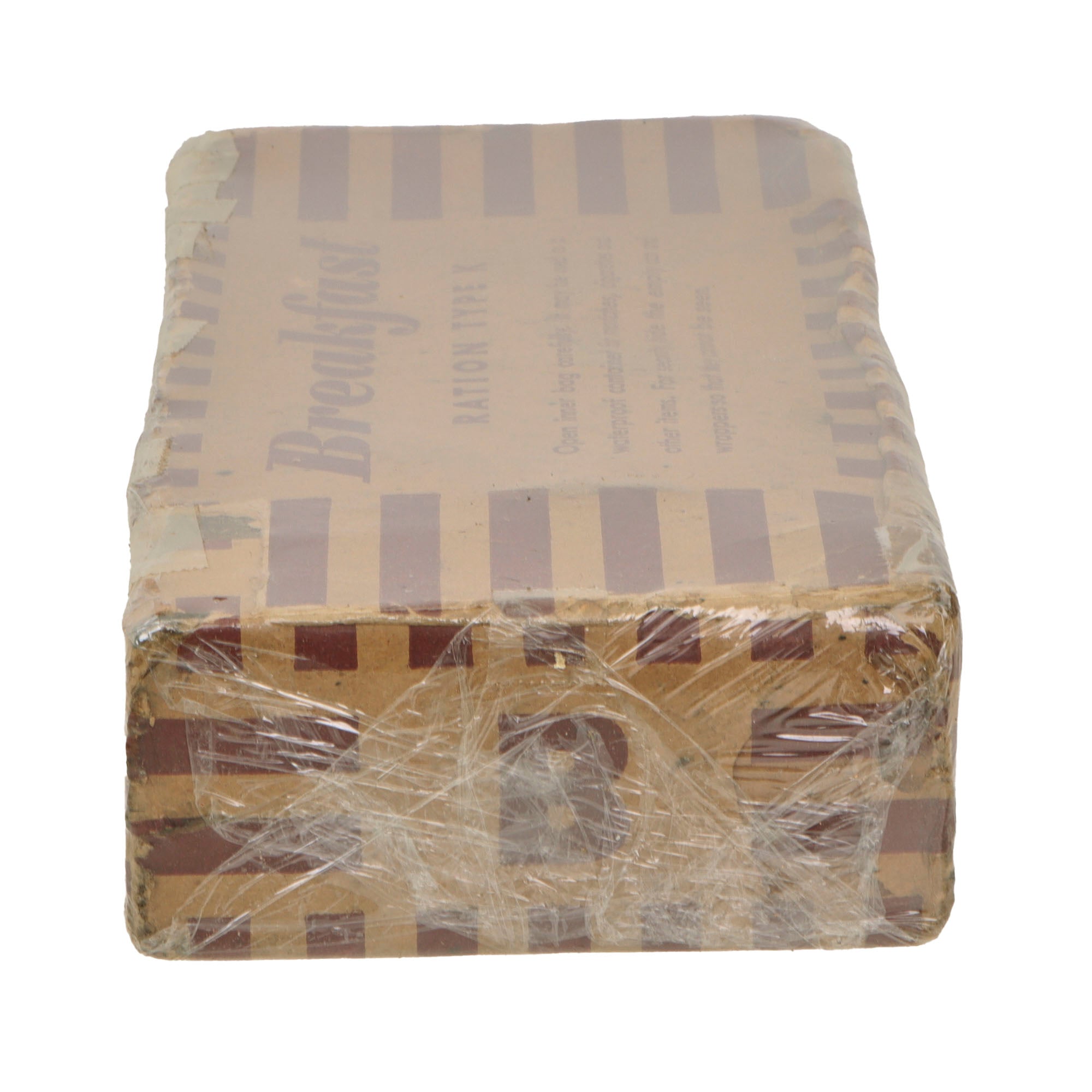 This is a very nice unissued BREAKFAST unit by Hills Brothers Company of New York, New York. It is the later war "Morale Series", with the maroon design on the exterior. While we did not open it, years of storage and bouncing around have worn the exterior carton, which is now torn in several places, and shows wear. The internal carton looks to still be intact, however opened at one time, and closed and covered in plastic.