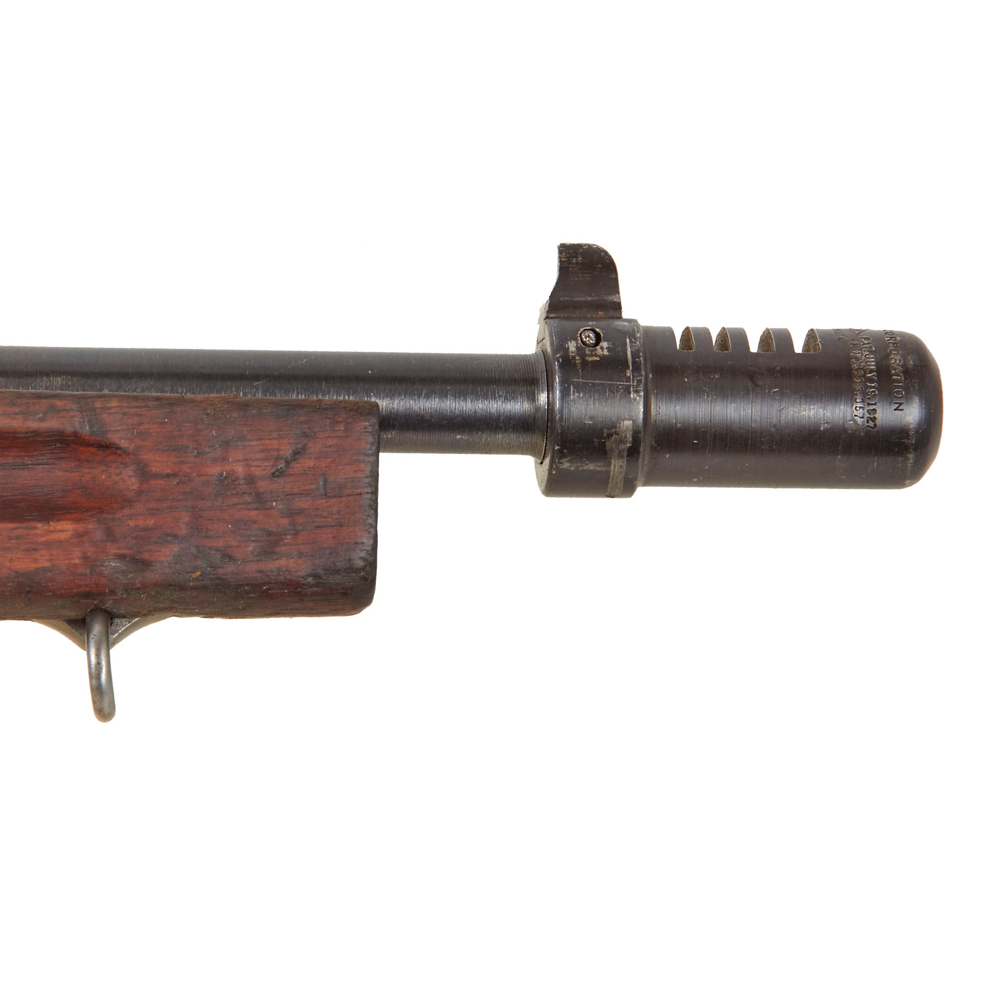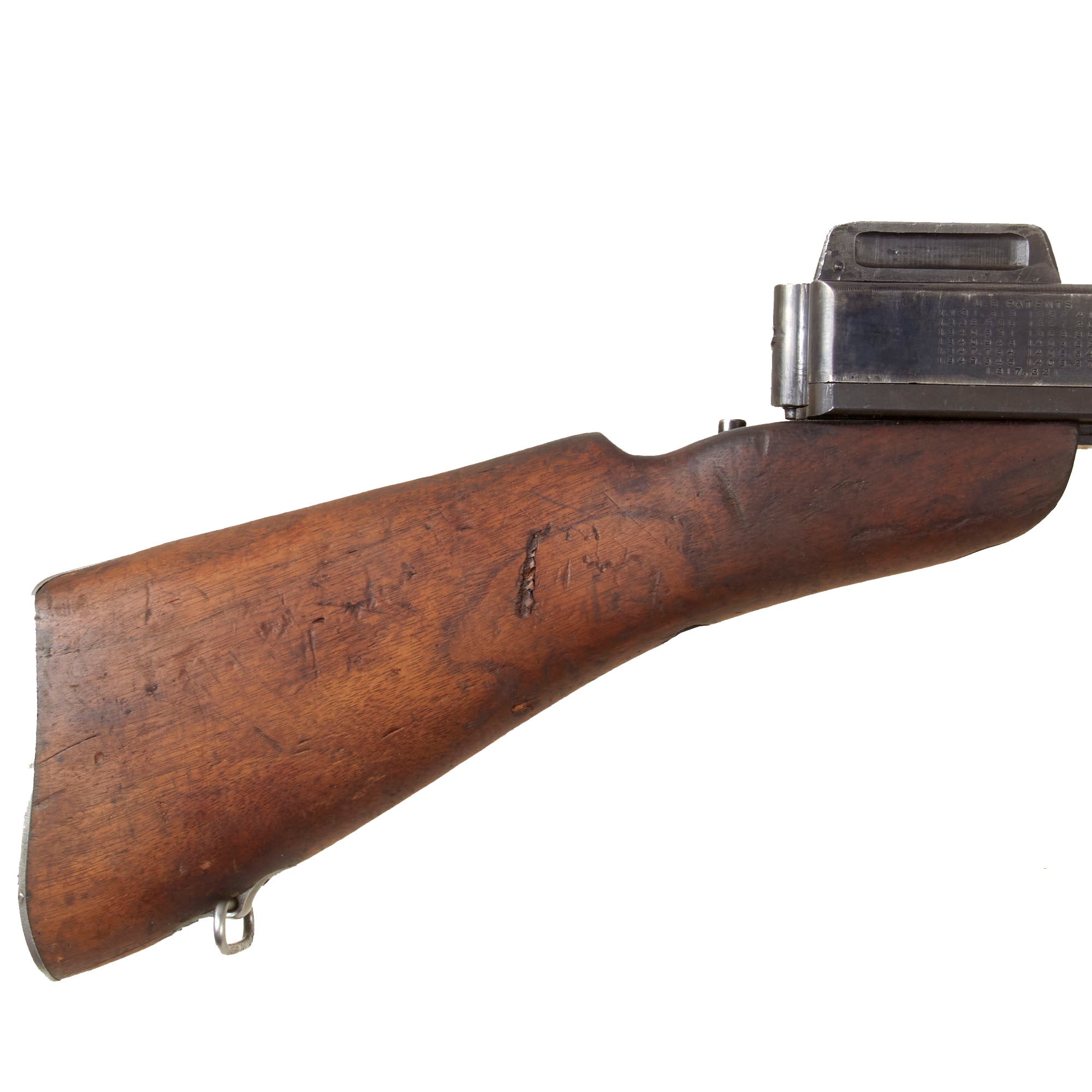 This example is typical of the early war issue Thompson M1928A1, with the more delicate adjustable Lyman Sight. It also has the early style buttstock, without the reinforcement bolt, and the sling swivel mounts are both the correct machined steel type. It has lovely American Black Walnut furniture that has that red brown color only achieved after years of age, showing some great service wear from actual use in the field. The metalwork has a lovely aged patina, still retaining a lot of the original finish, while also showing wear from service.