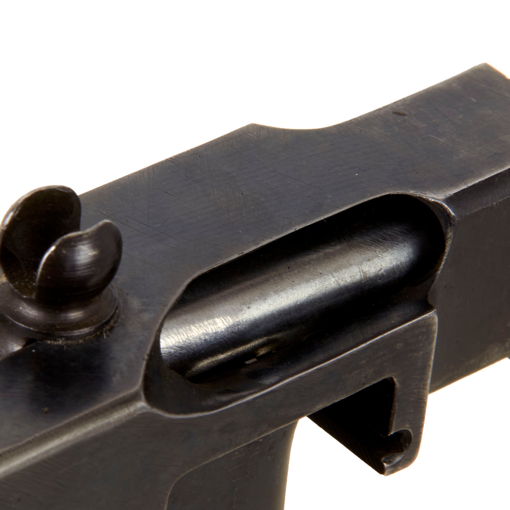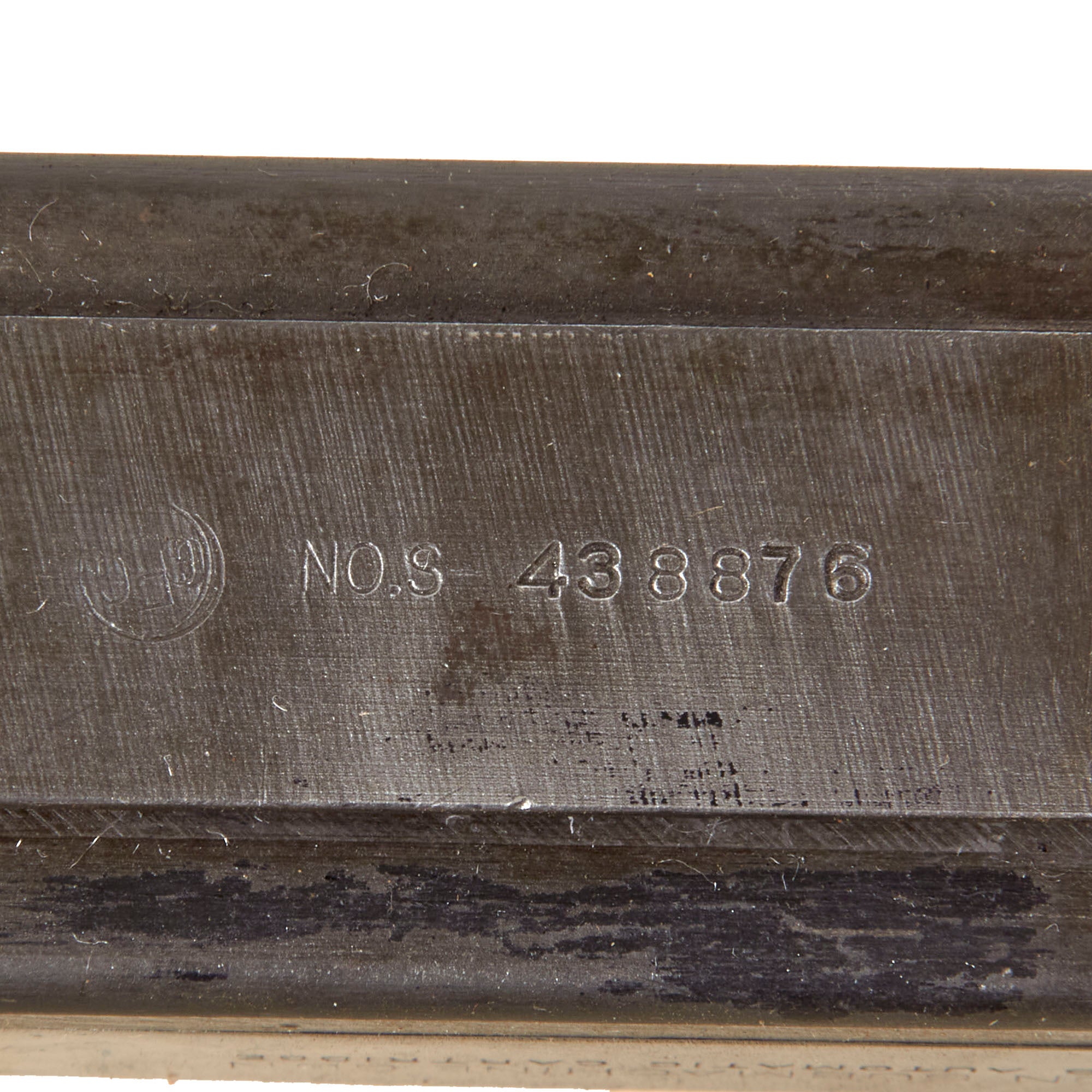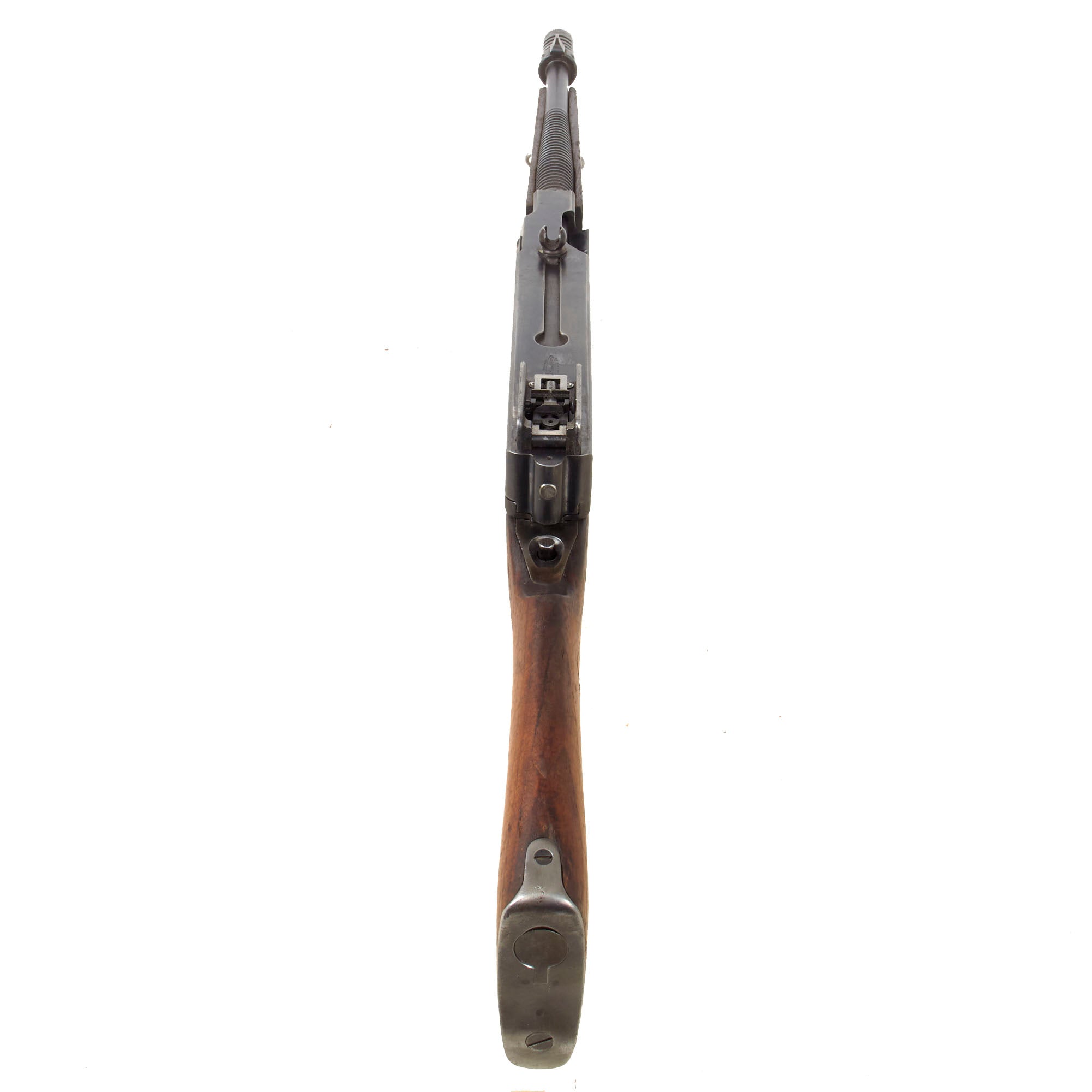 It has properly had a 25% section of the total length completely replaced entirely with solid steel bar stock. Meaning a 1/4 length section of the display receiver is solid steel, making this totally legal to own without a license of any kind. Every part on this display gun is original WWII manufacture other than 25% of the receiver replaced by solid steel. Additionally, an original bolt and actuator have been installed, welded into the forward position as required by the BATF, and other deactivated components may have been included as well. The barrel is live and has not been deactivated.