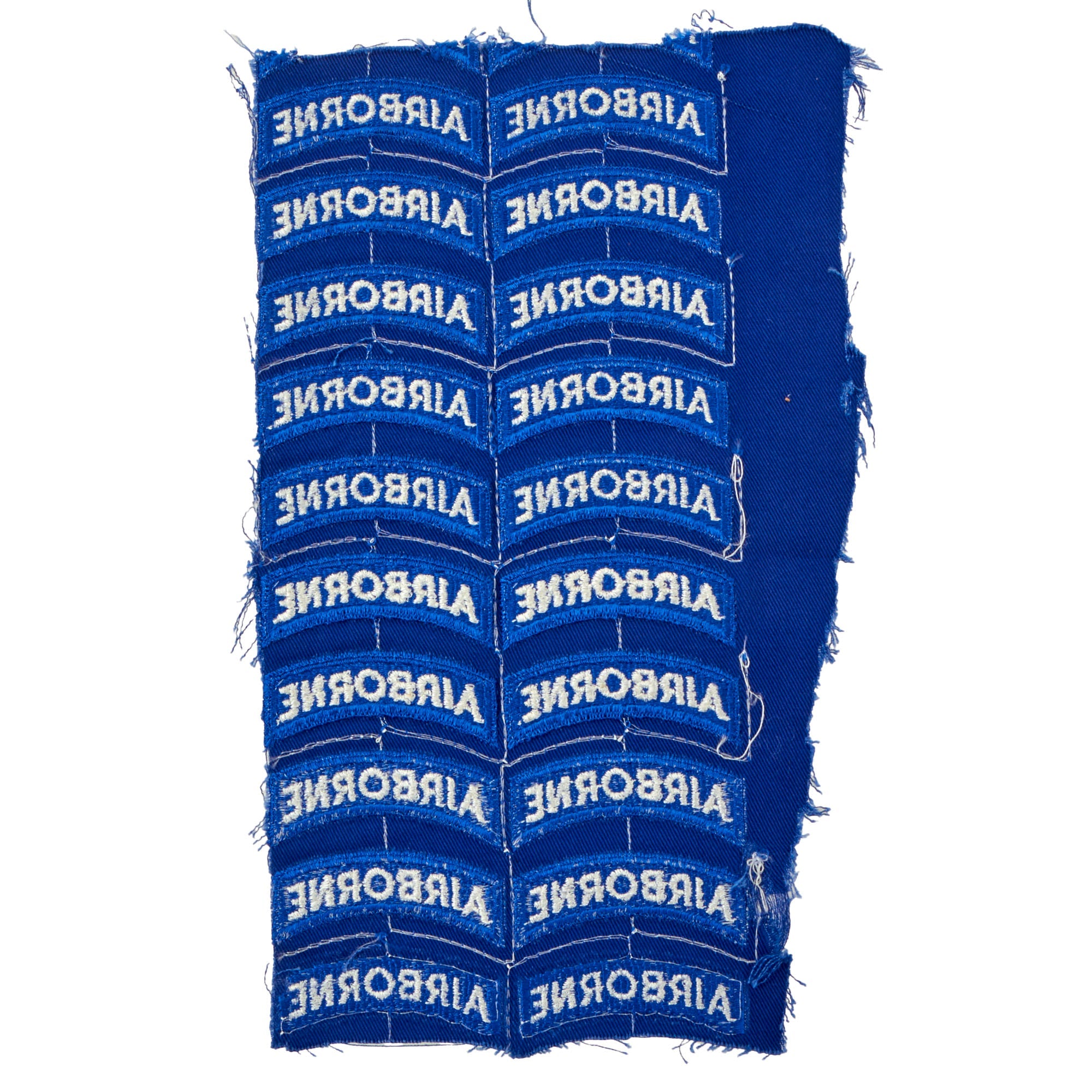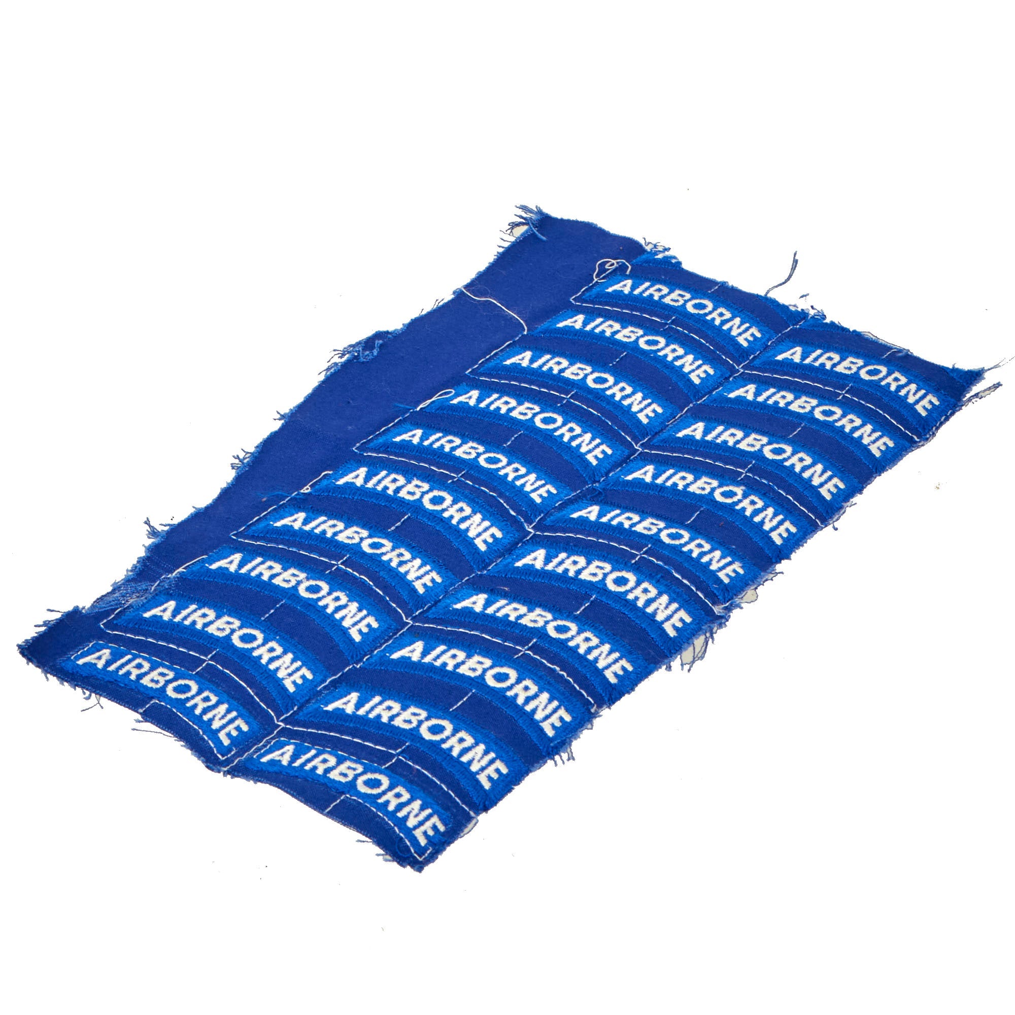 Original Item. One-of-a-Kind. This is an outstanding piece for the Airborne insignia collector. This uncut sheet of blue & white Airborne rocker patches contains twenty complete examples. But interestingly, the two on the bottom appear to be missing their blue borders. The sheet measures 10¾ x 6½” and is unevenly cut as shown.
