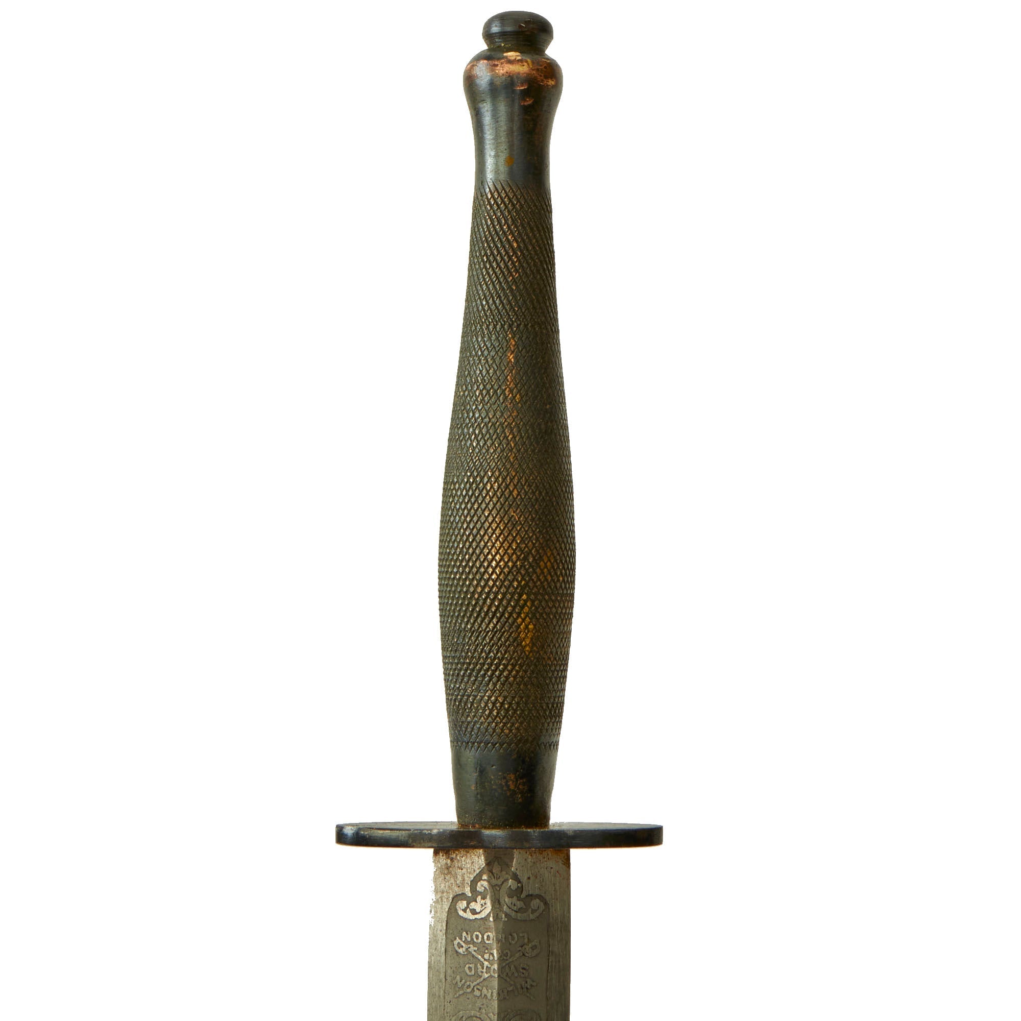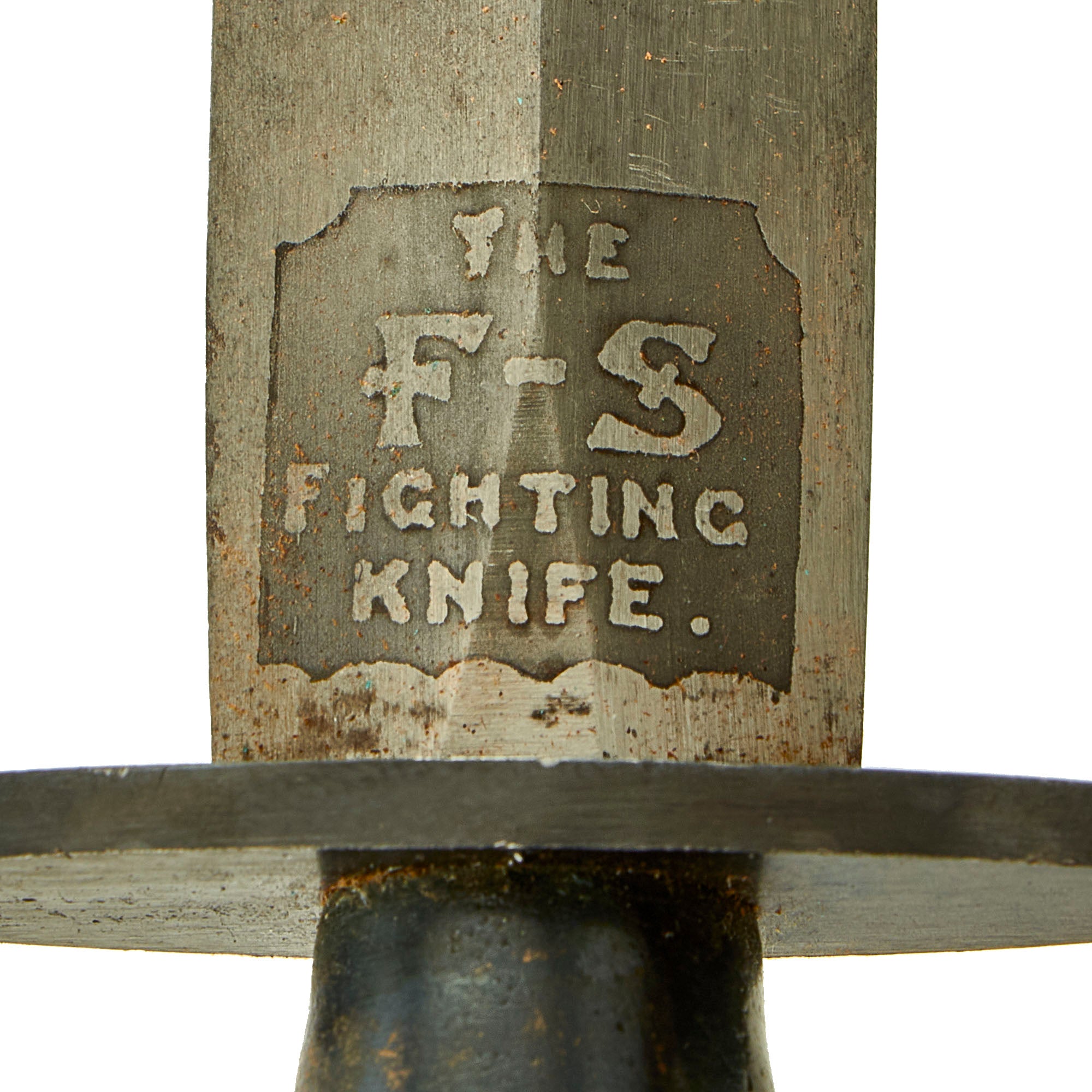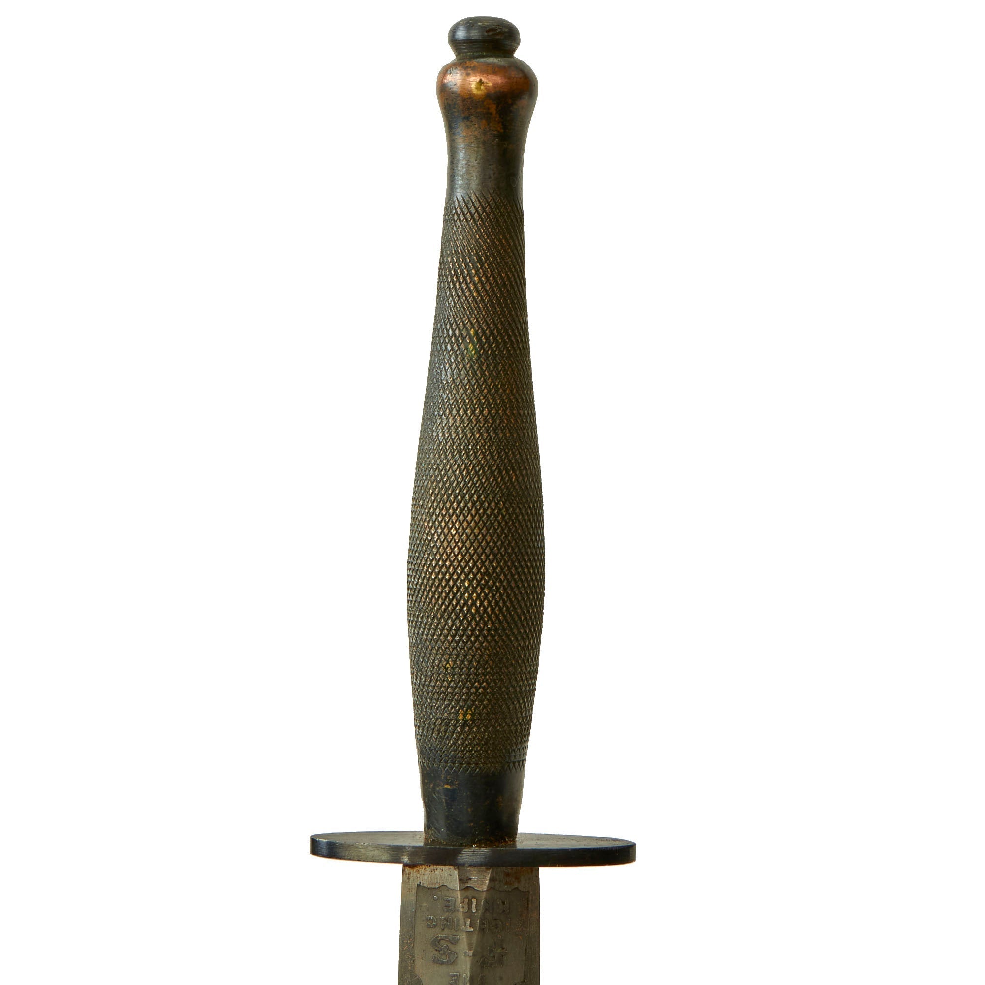 Condition of the knife is very good, still with a sharp edge, however it definitely shows use and minor sharpening. The handle has much of the original blackening retained with just a few areas showing bare brass. The crossguard is still tight to the handle and is unmarked. For more information on the 2nd pattern knife variations, please see this website: Standard P-2 Fairbairn-Sykes Knives.