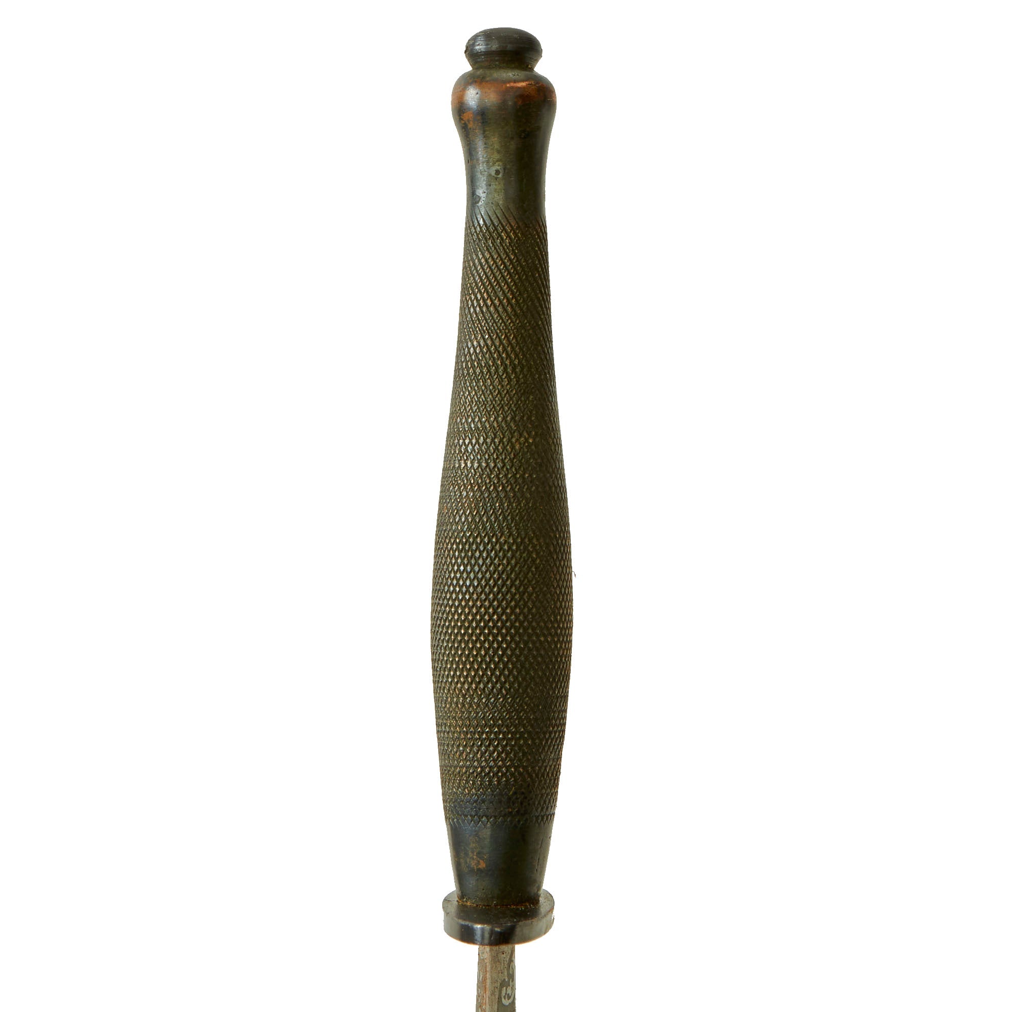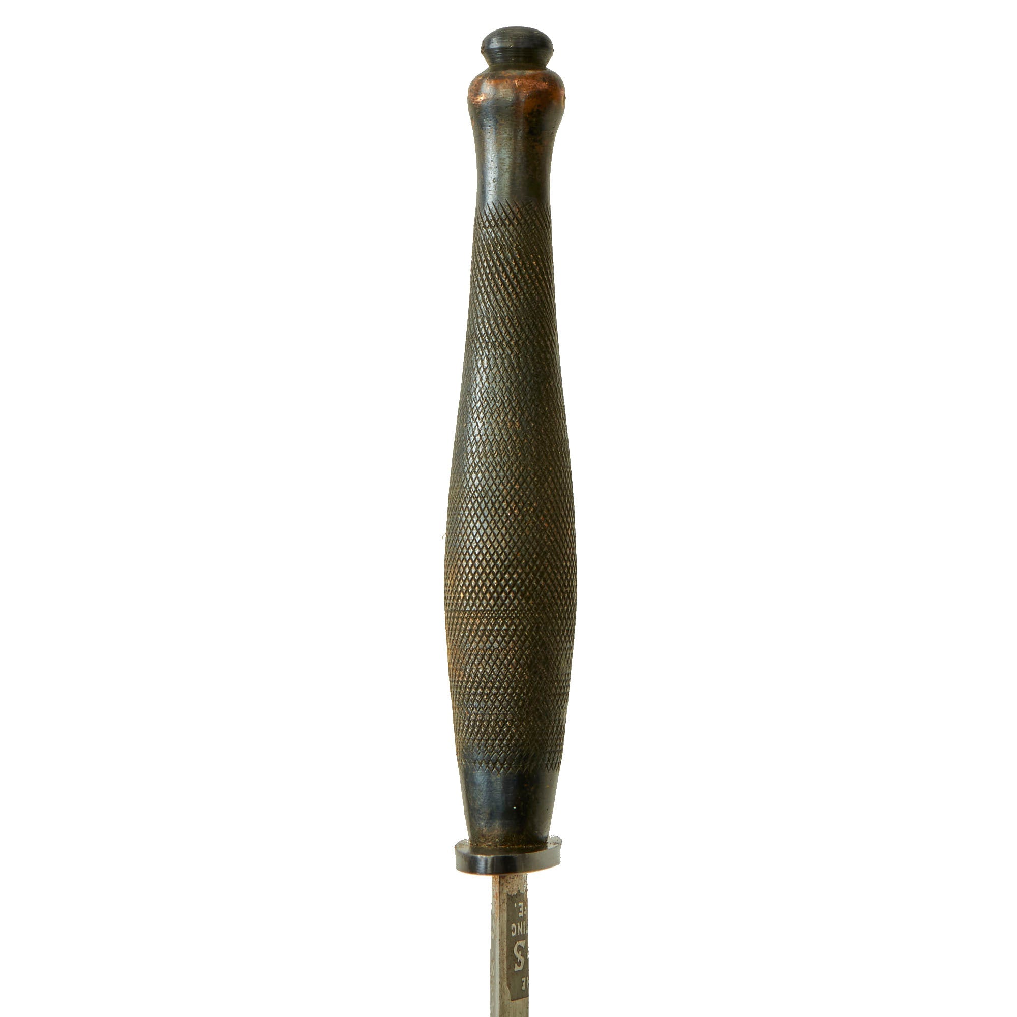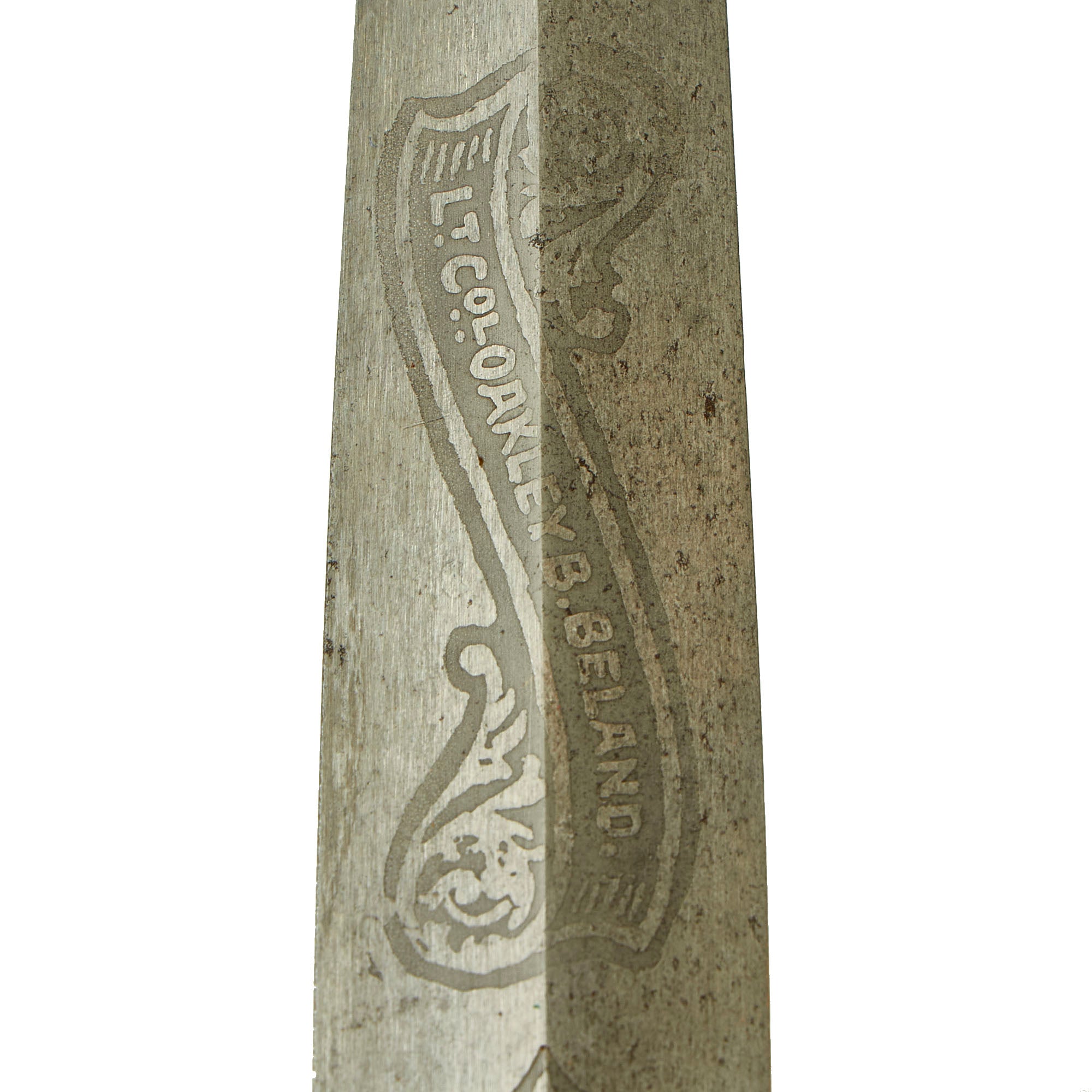 Original Item: Only One Available. This is one of the rarer versions of the Fairbairn-Sykes fighting knives. Featuring a blackened brass handle and etched blade, making this an even more attractive offering. The blade ricasso has a lovely WILKINSON SWORD CO / LONDON marking with nearly all details still retained. The blade is etched with the name of LT. COL. OAKLEY B. BELAND in a scroll which retains all details. After a quick search we found that Beland was the 2nd Battalion Commander of the 120th Infantry Regiment serving under the command of the 30th Infantry Division. It isn’t very often that we come across a Fairbairn-Sykes knife that is named etched/engraved, making this a rare and fantastic research opportunity.