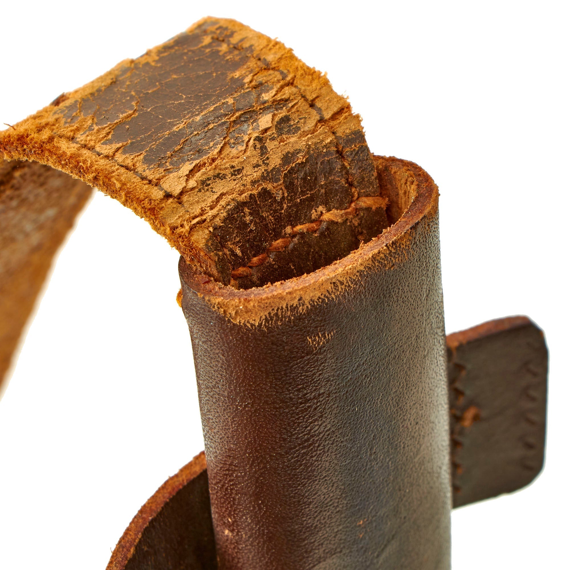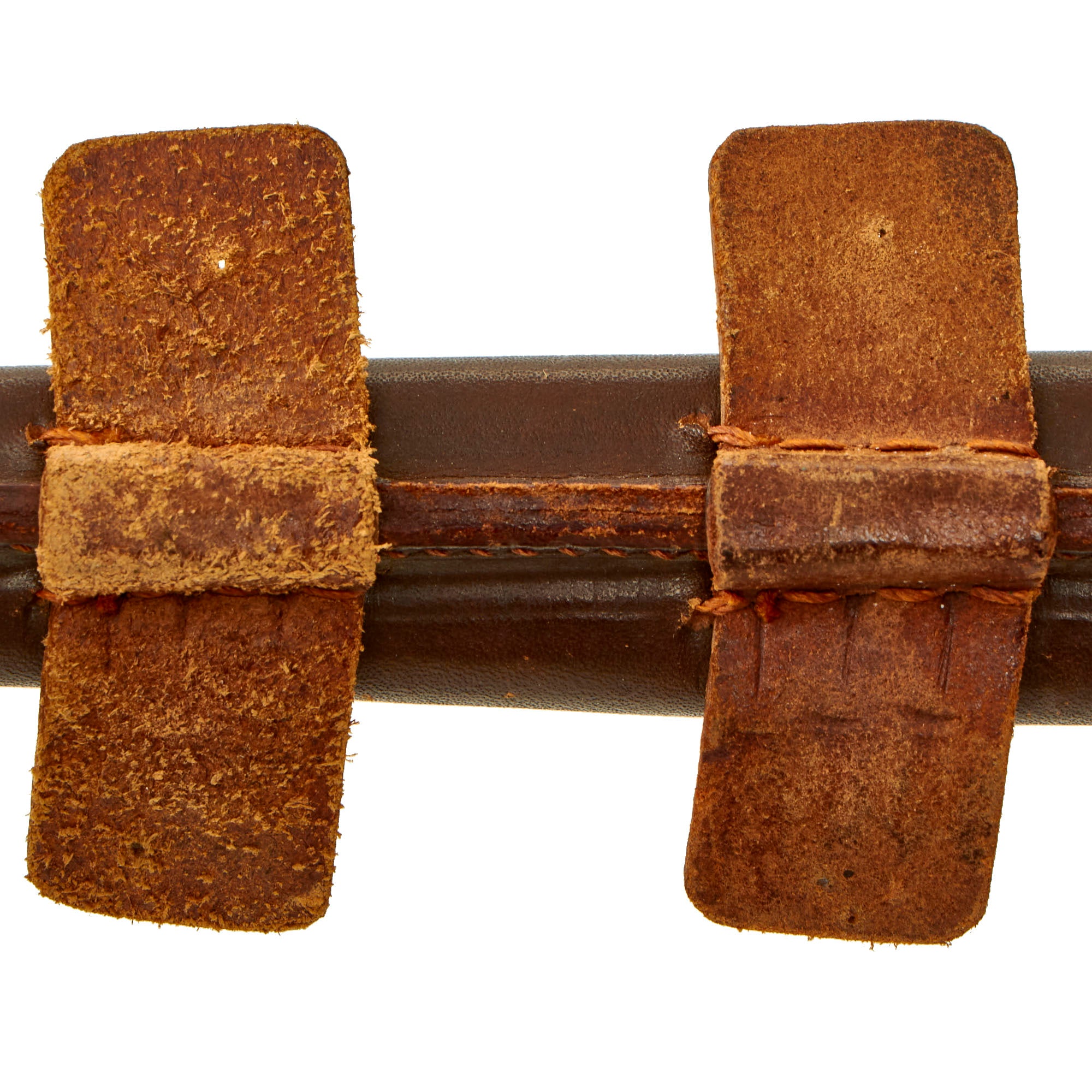 Scabbard is in used condition, with a lovely patina of age. The belt loop has broken and completely missing. The reinforced tongue is missing the extra leather piece at the top entirely.