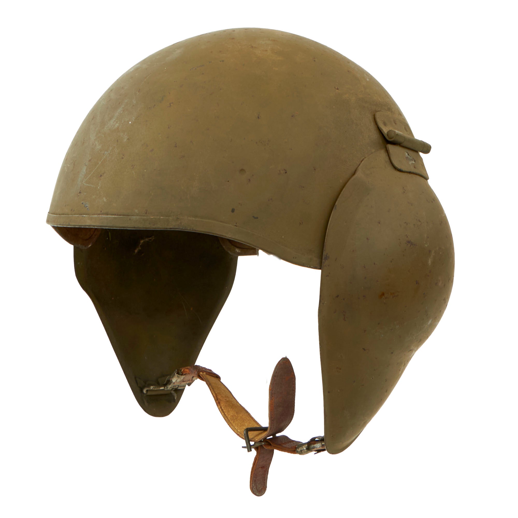 Like the previous models, the M5 is a three-piece steel helmet comprising a skull and deep hinged ear-flaps. The ear flaps were modified compared to the M3 and M4, and made deeper to provide additional protection to the wearer's cheeks. The chin straps were now clipped to swivel bales, for more easy replacement, an advancement that made its way to the M1 helmet in the post war period. They were also made of leather, as with the M4 flak helmet, and had a chamois interior, until later in the war, when they were replaced with canvas. The M1-style front brim was also removed. Also, instead of the M4's cloth cover, the M5 has standard olive drab paint, but it is covered with a thin "flocked" fuzzy covering, which prevents fingers and skin from freezing to the helmet surface.