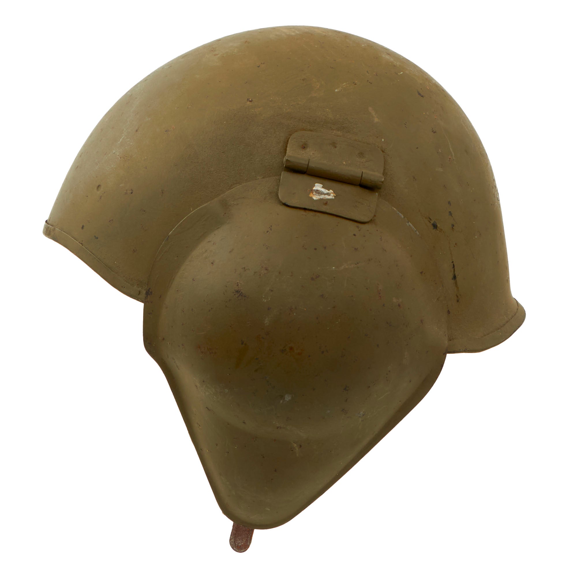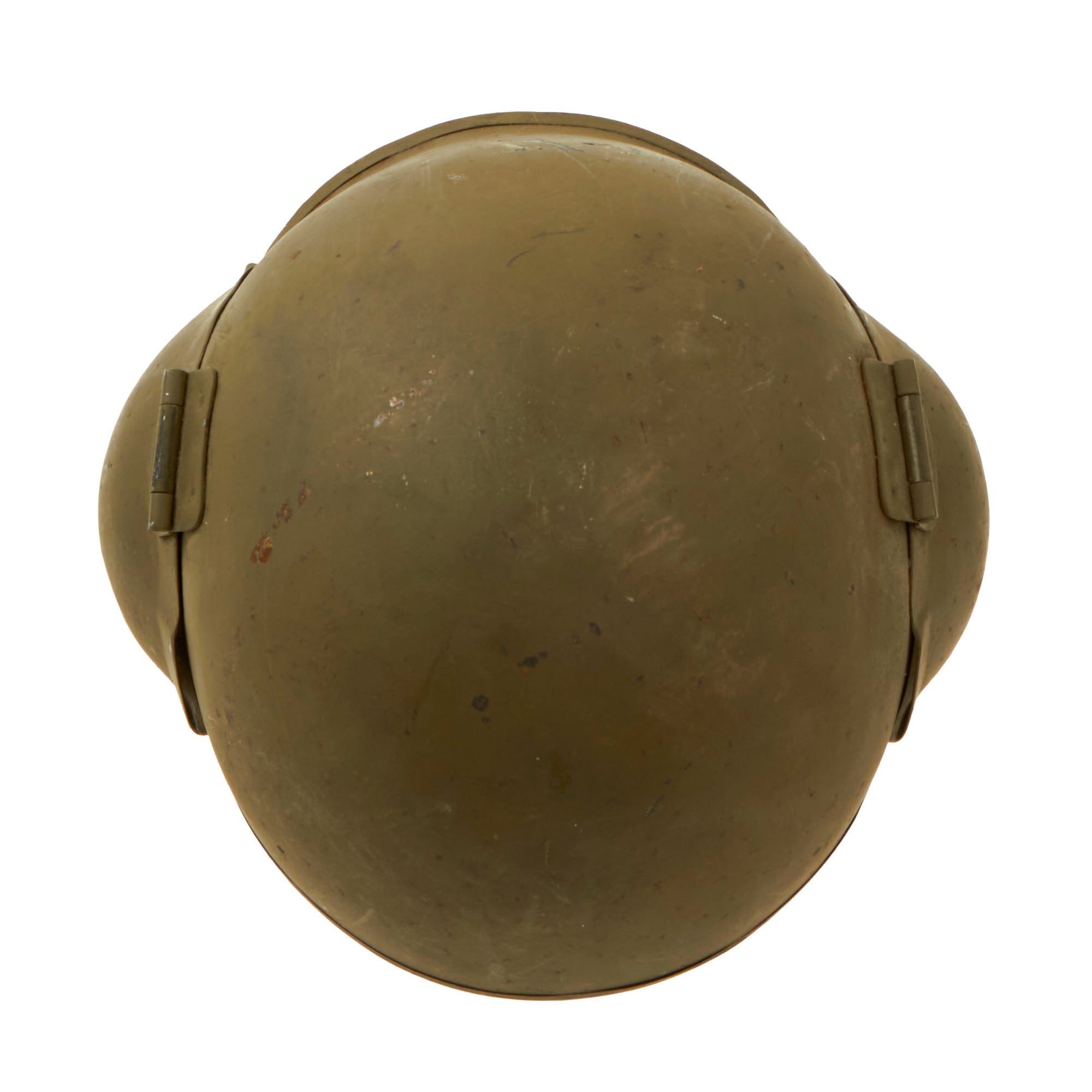 Original Item: Only One Available. This is a very hard to find USAAF WWII issue M5 Flak Helmet, in good service-worn condition. It looks to have been issued, but it does have minor storage wear on the exterior shell, which has removed most of the "flocked" coating on the exterior. World War Two American bomber crews in the skies over Europe needed something more than their leather flying helmets to provide them with shrapnel injuries, however it took a surprisingly long time for a new helmet to be developed and deployed to meet that need. Not until December of 1943 did the M3 reach the ETO, it was the first of three versions of the American flak helmet. The M4 followed, and in January 1945, this model, the M5, became the standard issue to bomber crews.