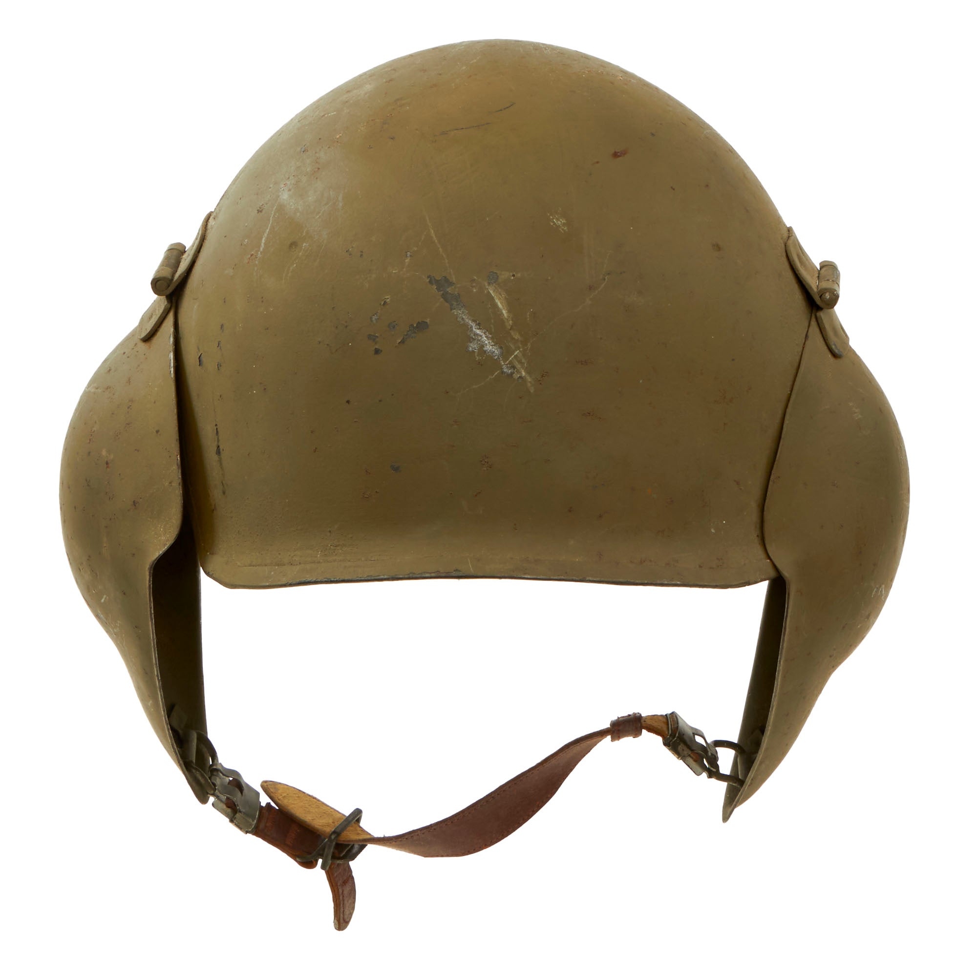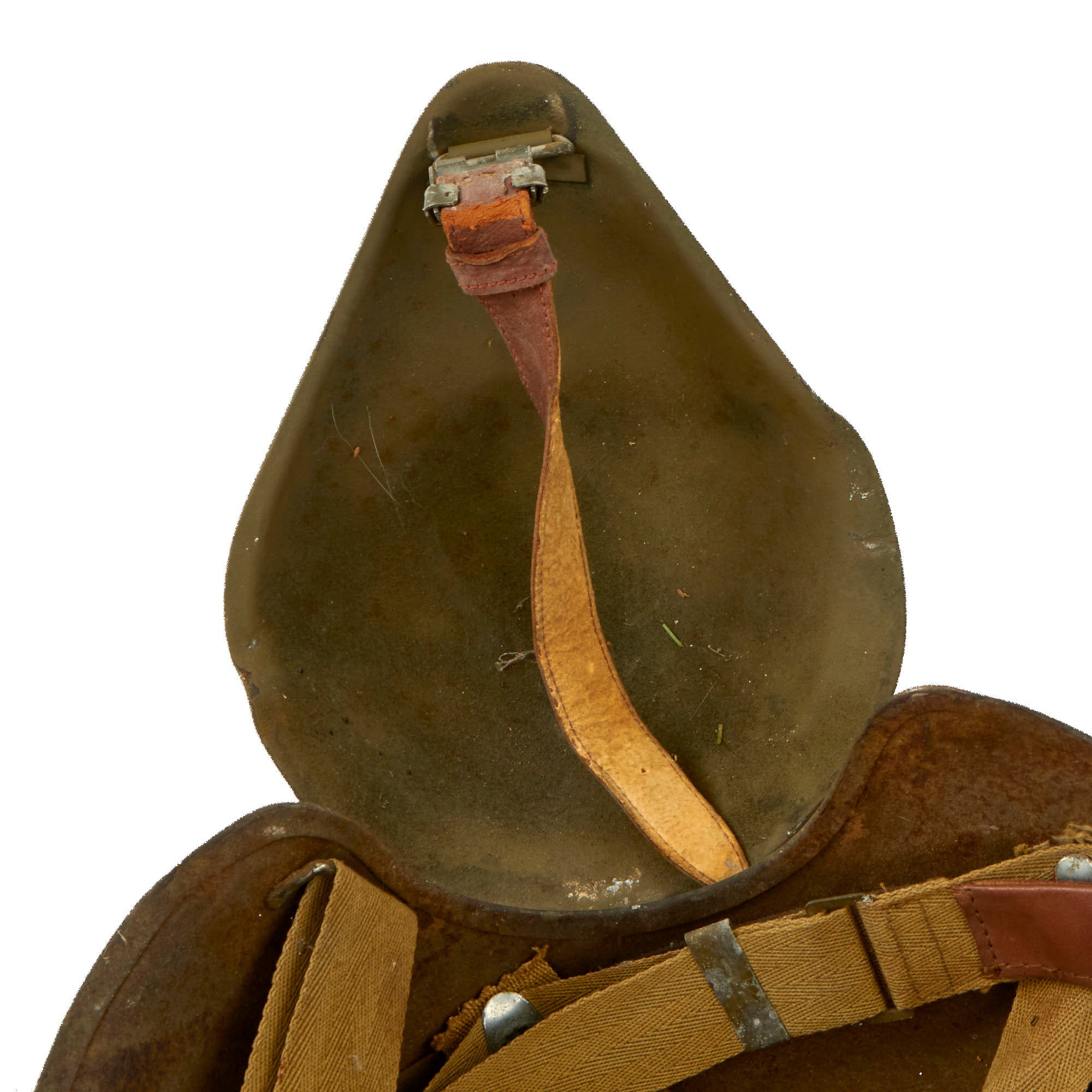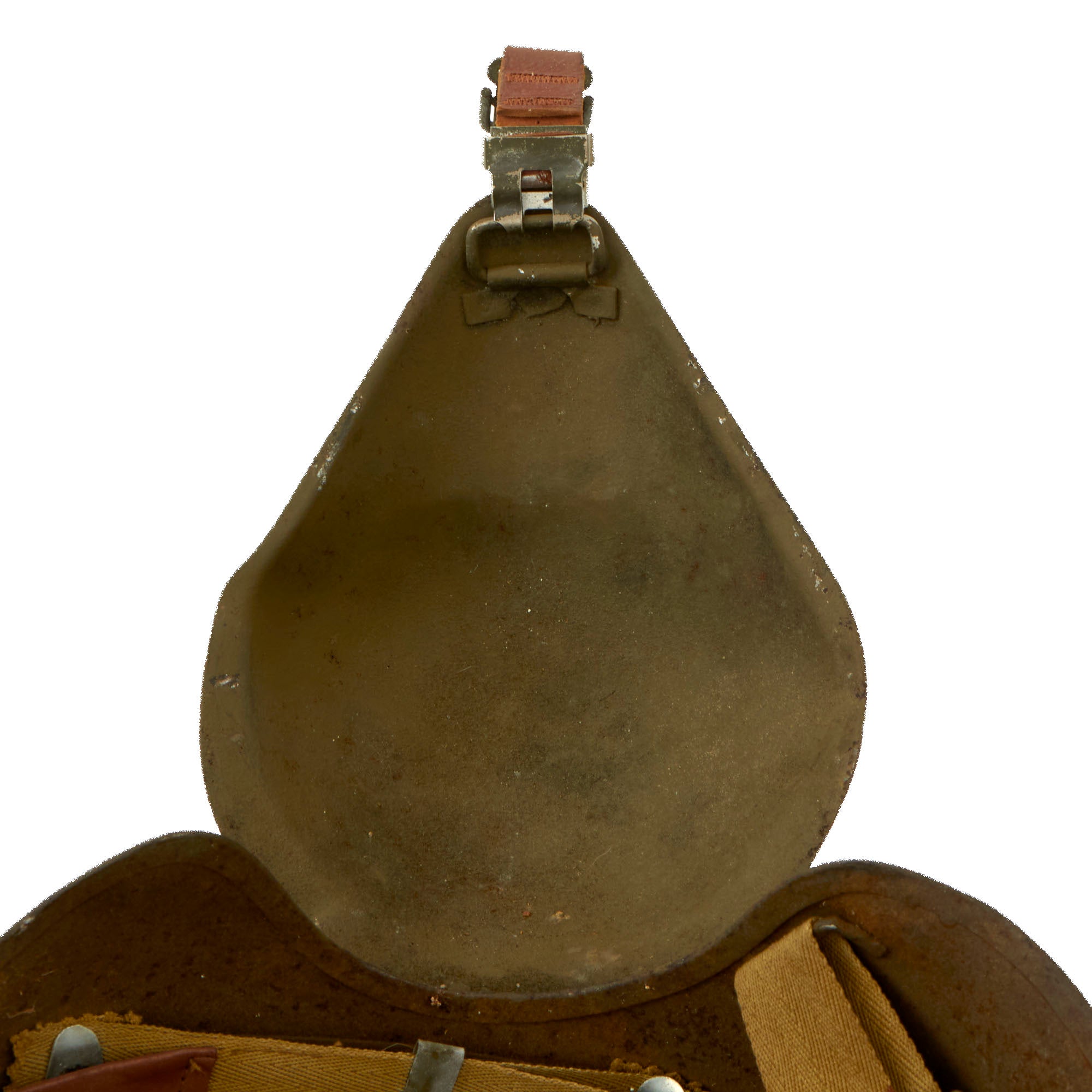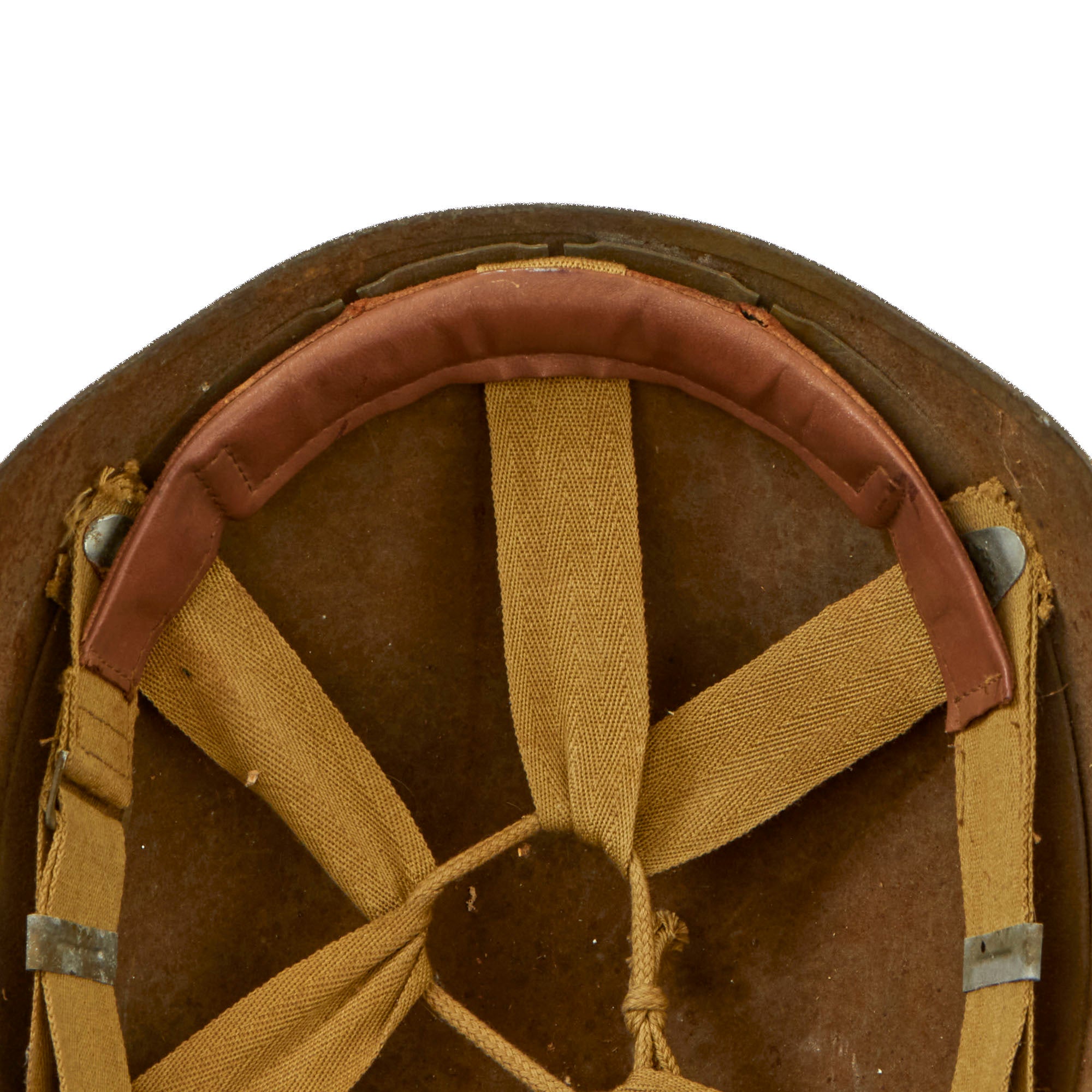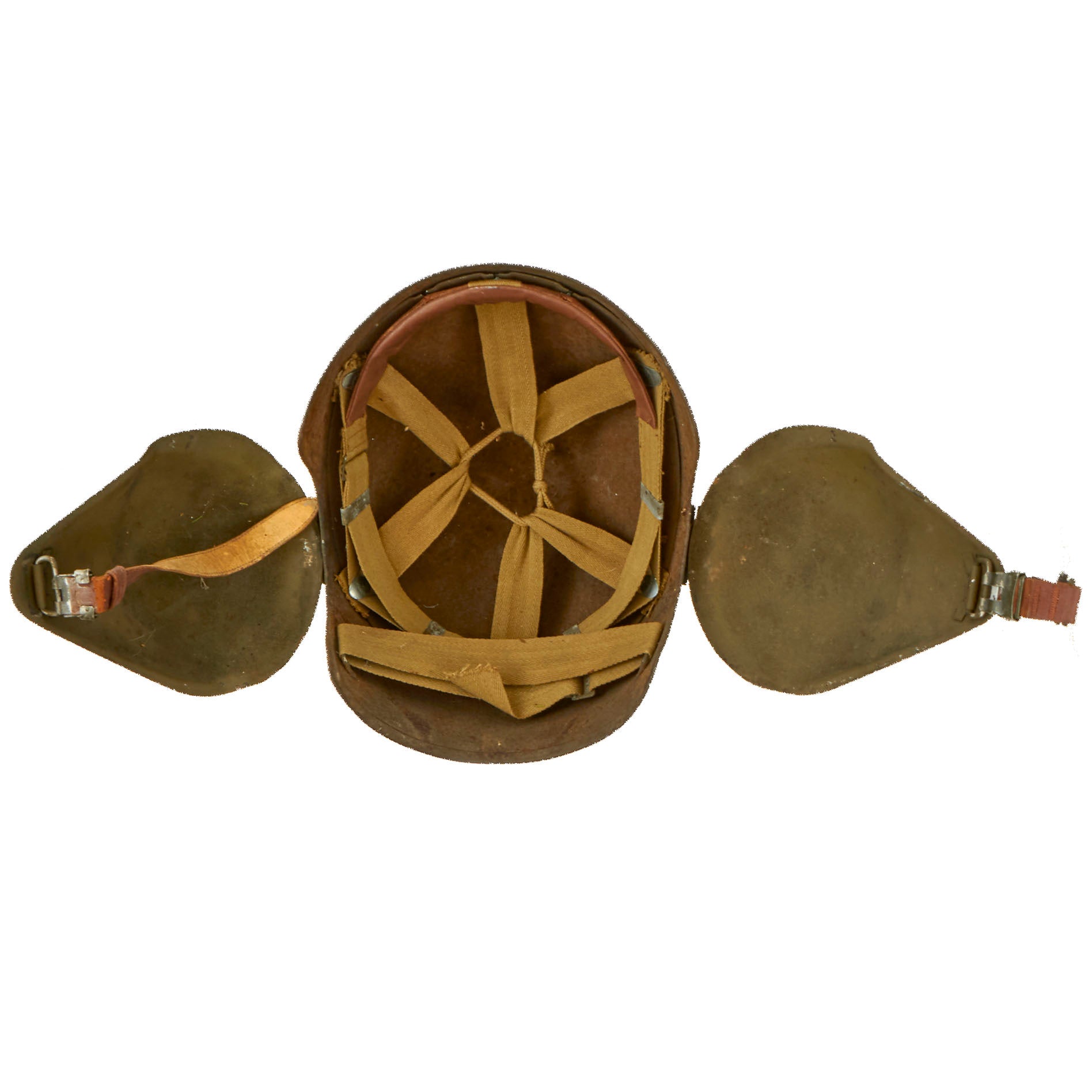 This example is offered in good condition. The interior rigging is complete with the forehead sweatband. The chinstrap is original and works well but the leather is stiff and shows some weakness near the end.