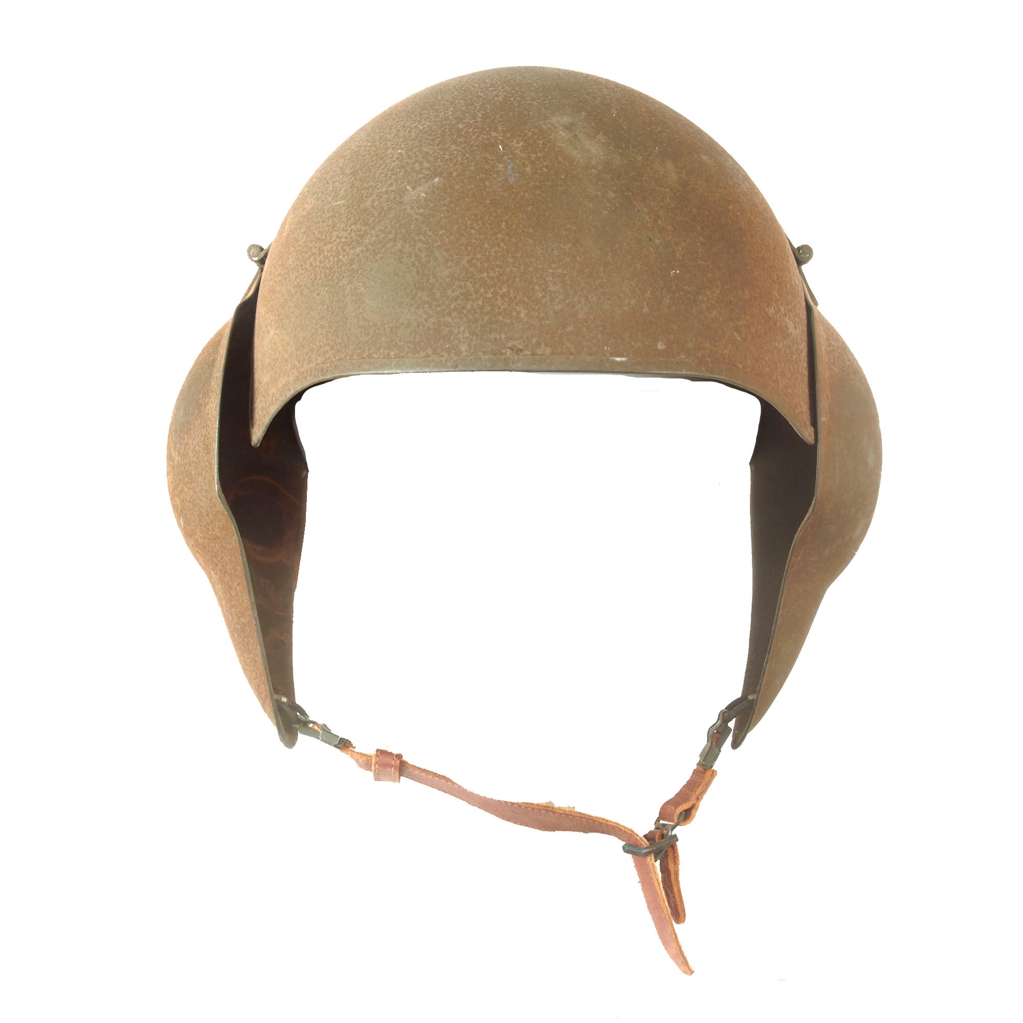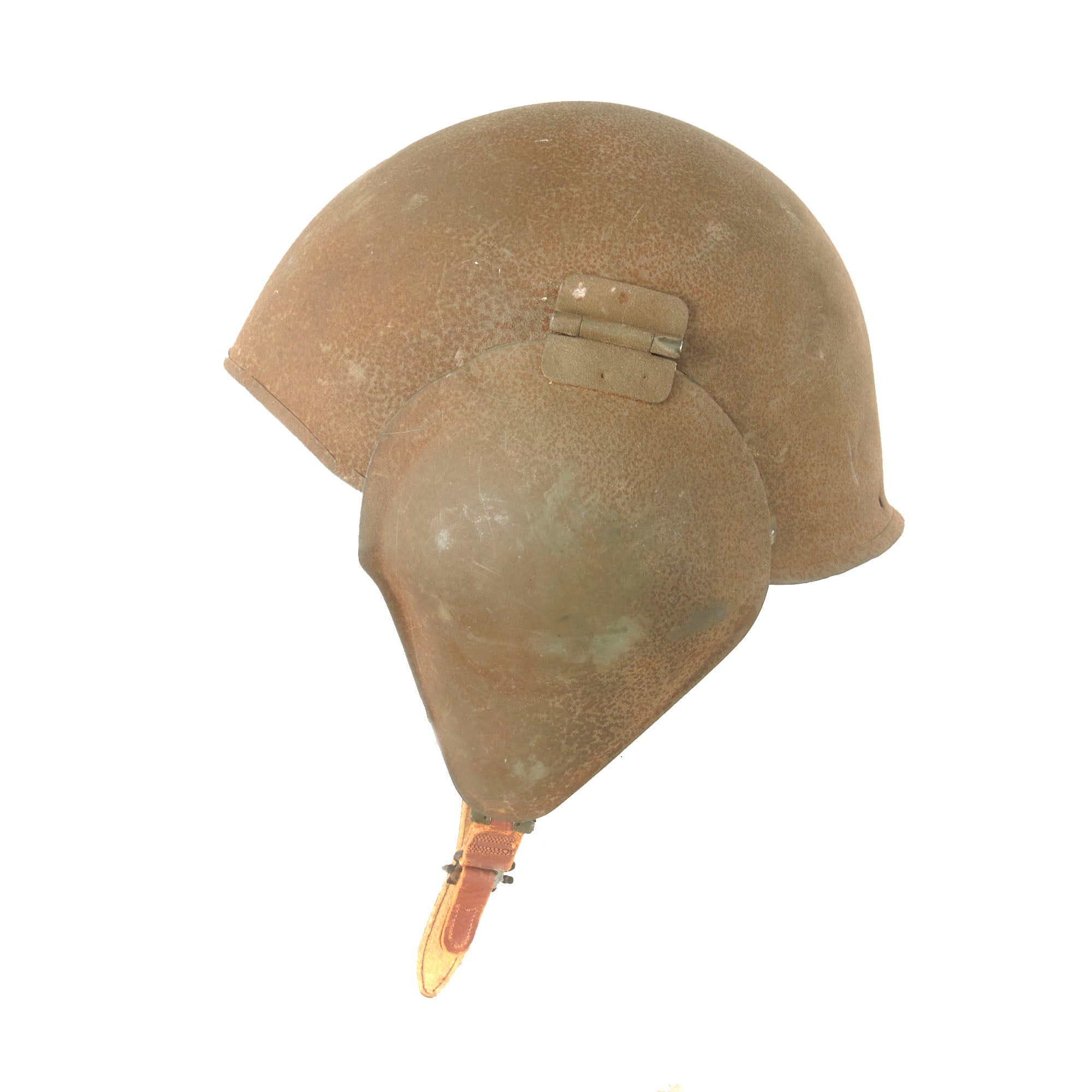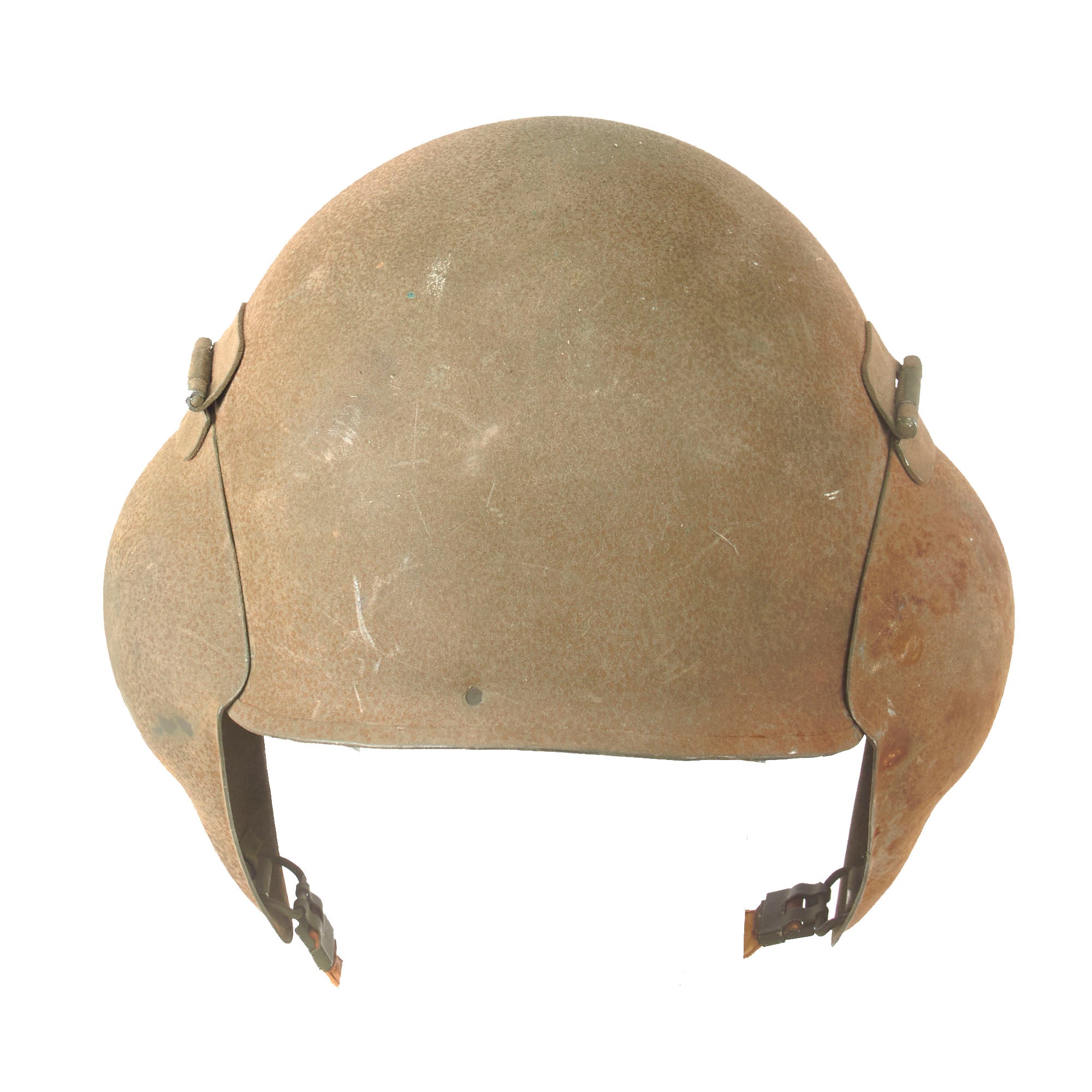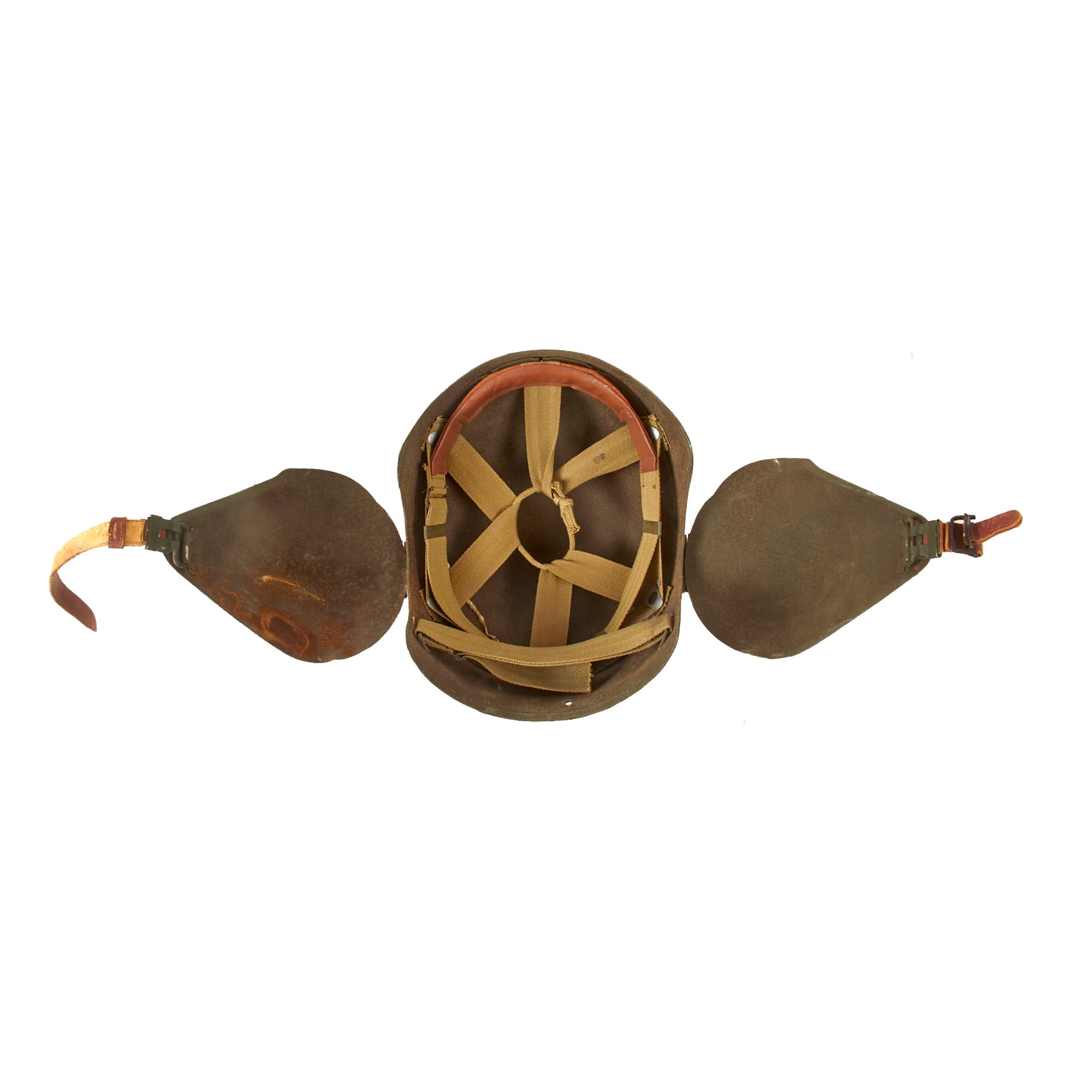 Original Item: Only One Available. This is a very hard to find USAAF WWII issue M5 Flak Helmet, in good service-worn condition. It looks to have been issued, but it does have minor storage wear on the exterior shell, but the "flocked" coating on the exterior is still very well-retained. World War Two American bomber crews in the skies over Europe needed something more than their leather flying helmets to provide them with shrapnel injuries, however it took a surprisingly long time for a new helmet to be developed and deployed to meet that need. Not until December of 1943 did the M3 reach the ETO, it was the first of three versions of the American flak helmet. The M4 followed, and in January 1945, this model, the M5, became the standard issue to bomber crews.