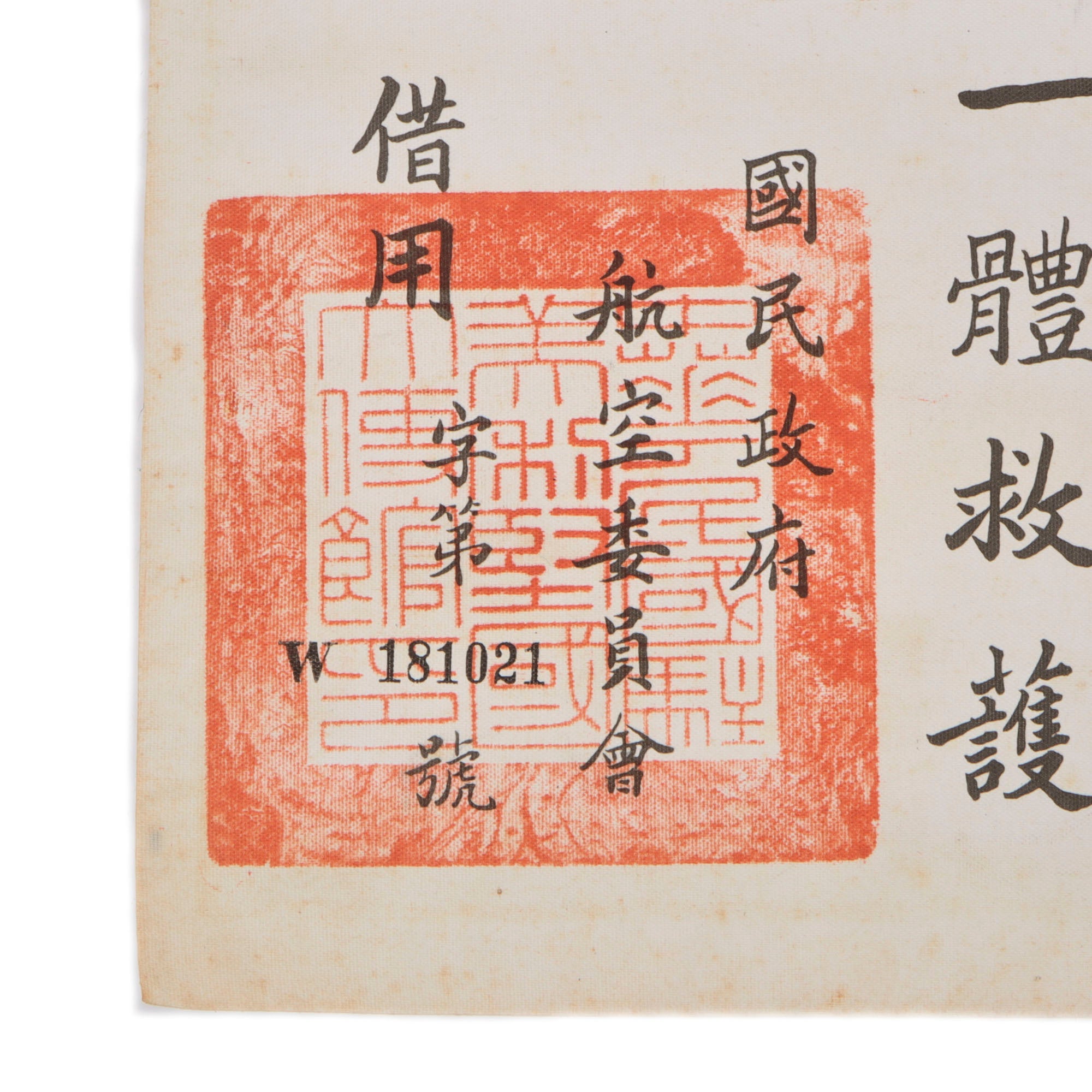 • Original Items: Only One Set Available. This is an excellent condition, original pectin-treated silk blood chit. It bears a World War Two printed Chinese National Flag with Chinese Characters and a temple stamp. It measures approximately 7 ⅞ inches by 9 ⅞ inches. This would have been stitched to the back or inside lining of a U.S. Aviator flight jacket. This example is marked with identification number W 181021, and these are part of the standard contents of a China Burma India Survival set. Condition is very good, with just a bit of staining and a small hole, as well as creases from decades of being folded.