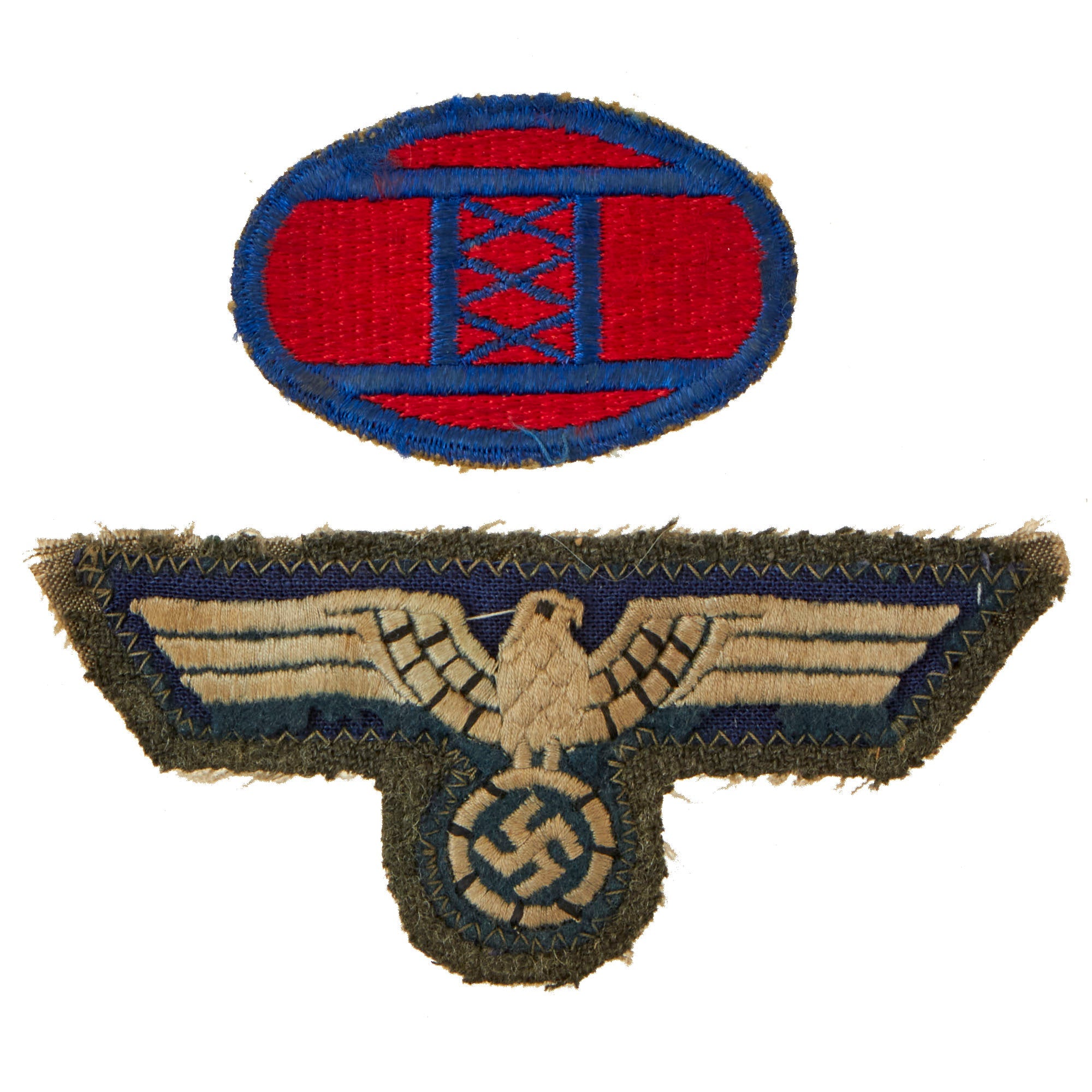 The Breast Eagle patch looks to be military, but it is not really a type that we recognize. Due to the blue color and white embroidery, we would assume it is Luftwaffe. It shows mothing to the front, which has removed the border around the eagle that holds it to the stitching.