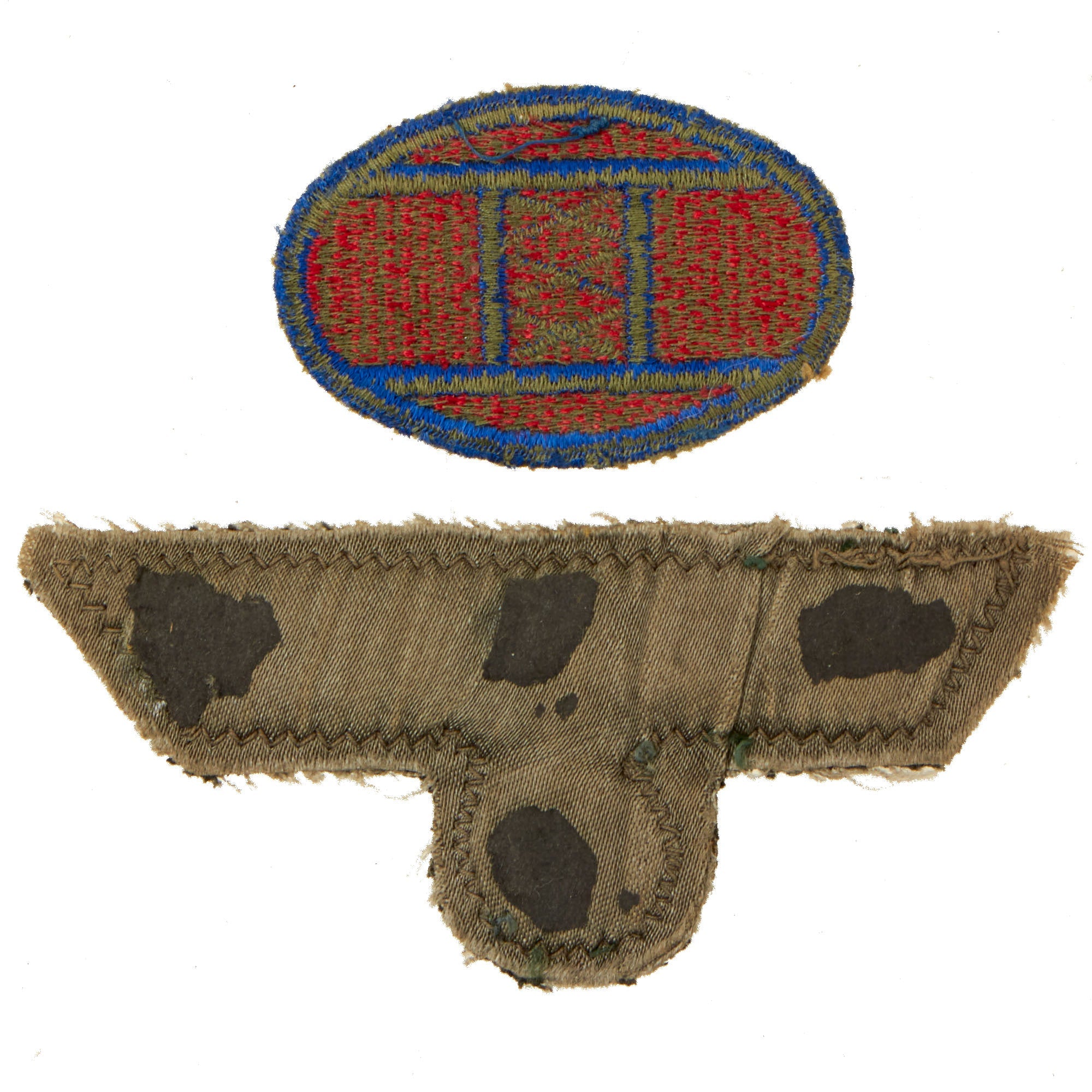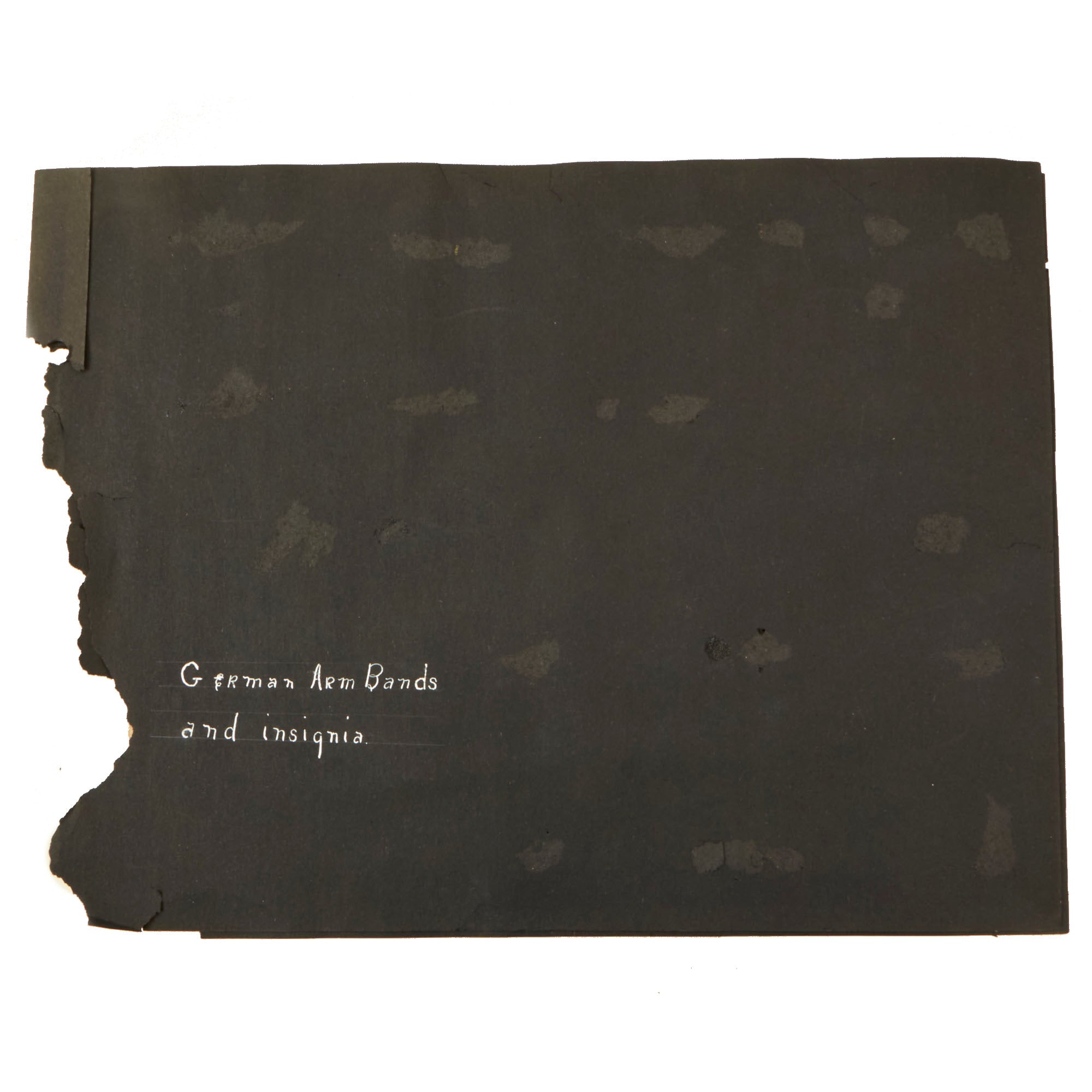 The removed items still show pieces of the black paper on the back, as they were torn off, and the glue still remains. There are three armbands, a uniform cutoff Reichsadler eagle, and even a U.S. WWII 30th Infantry "Old Hickory" Division shoulder patch, which may indicate that the owner of the scrapbook was a member of the division. We unfortunately do not have any information on who owned the scrapbook these pages came from, but they definitely have some great display potential.