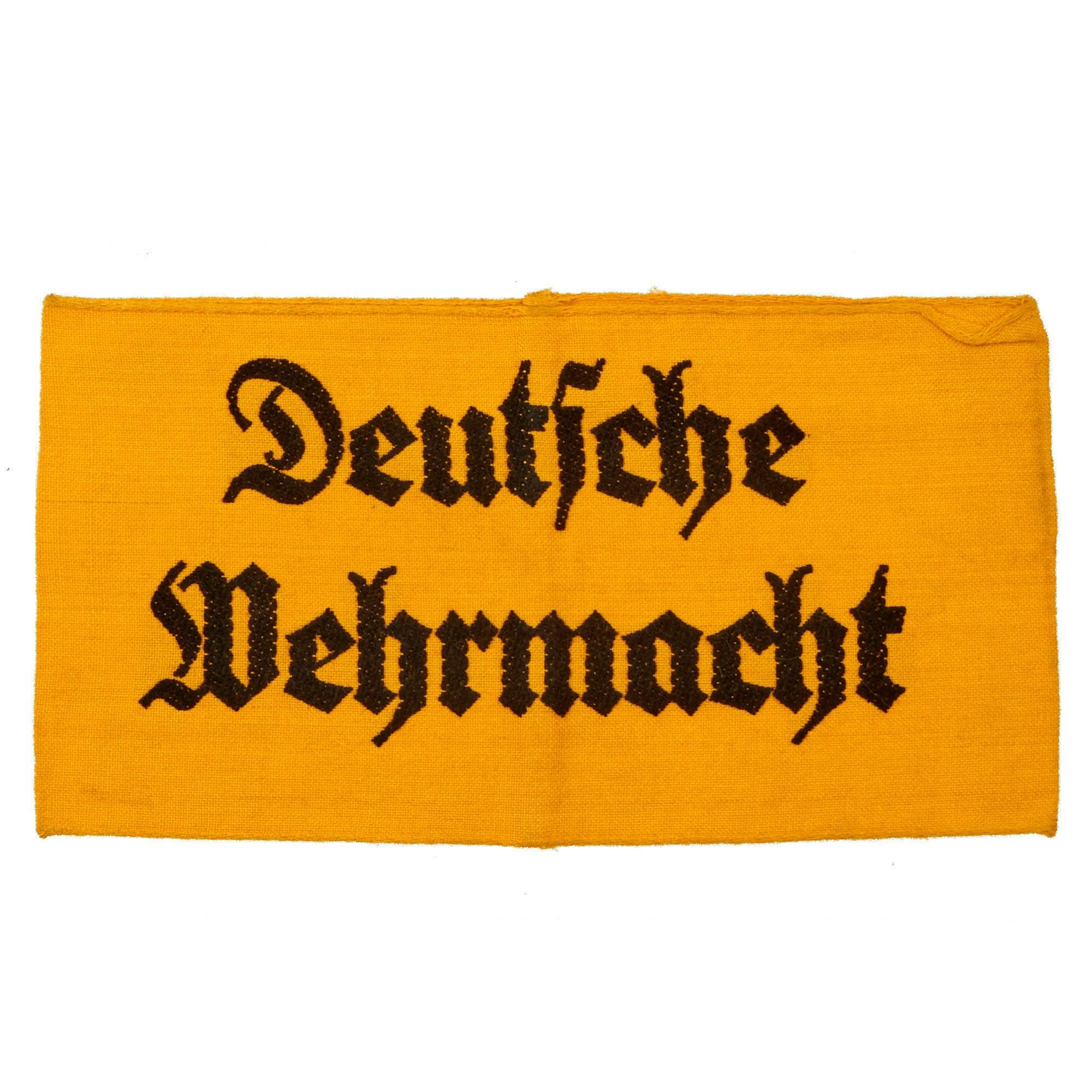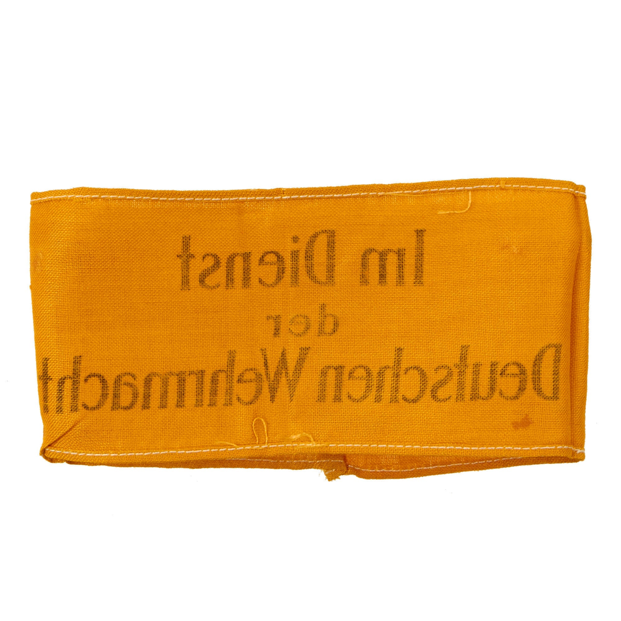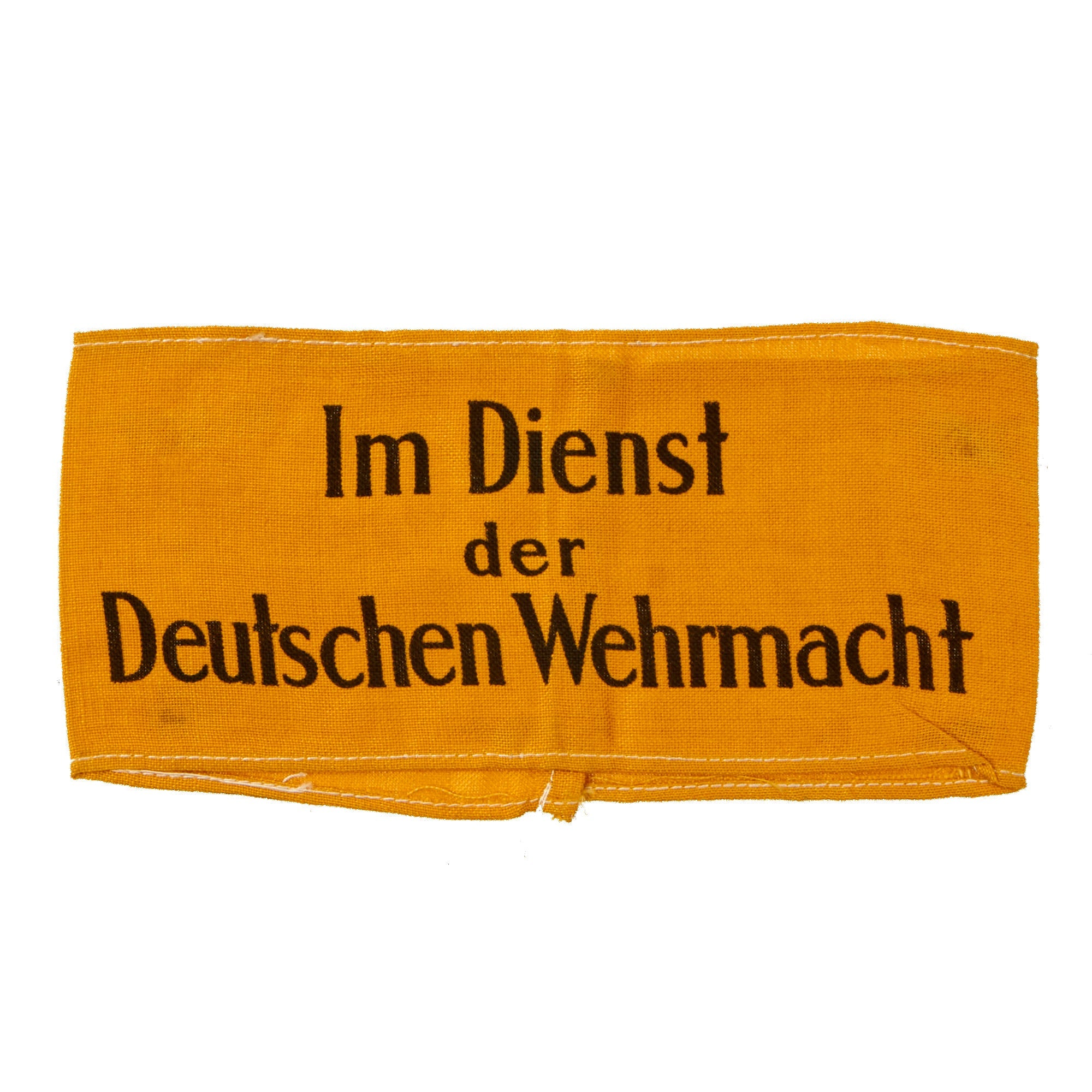 The yellow printed Im Dienst der Deutschen Wehrmacht ("In Service of the German Armed Forces") armband was introduced on 1 October 1941 for wear by non-German civilians serving the Armed Forces and for Russian Auxiliaries when not in uniform. The armband was worn on the upper left sleeve. These were necessary to identify the growing sector of non-uniformed personnel serving in a military capacity with a branch of the German armed forces. Often, these were worn by men of the Reichsarbeitsdienst and Reichsbahn who were operating with the German Army in the occupied countries. The armband measures 16" x 3 5/8", with the ends sewn together in the back. It still retains the black paper remnants on the back, and is quite flat from decades of being pressed in the scrapbook.