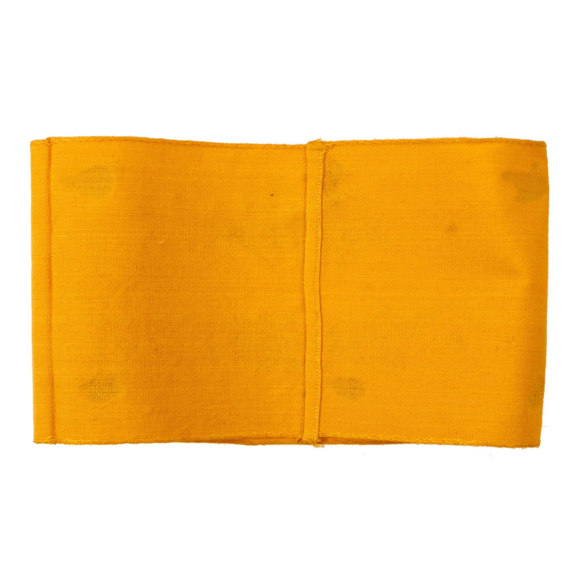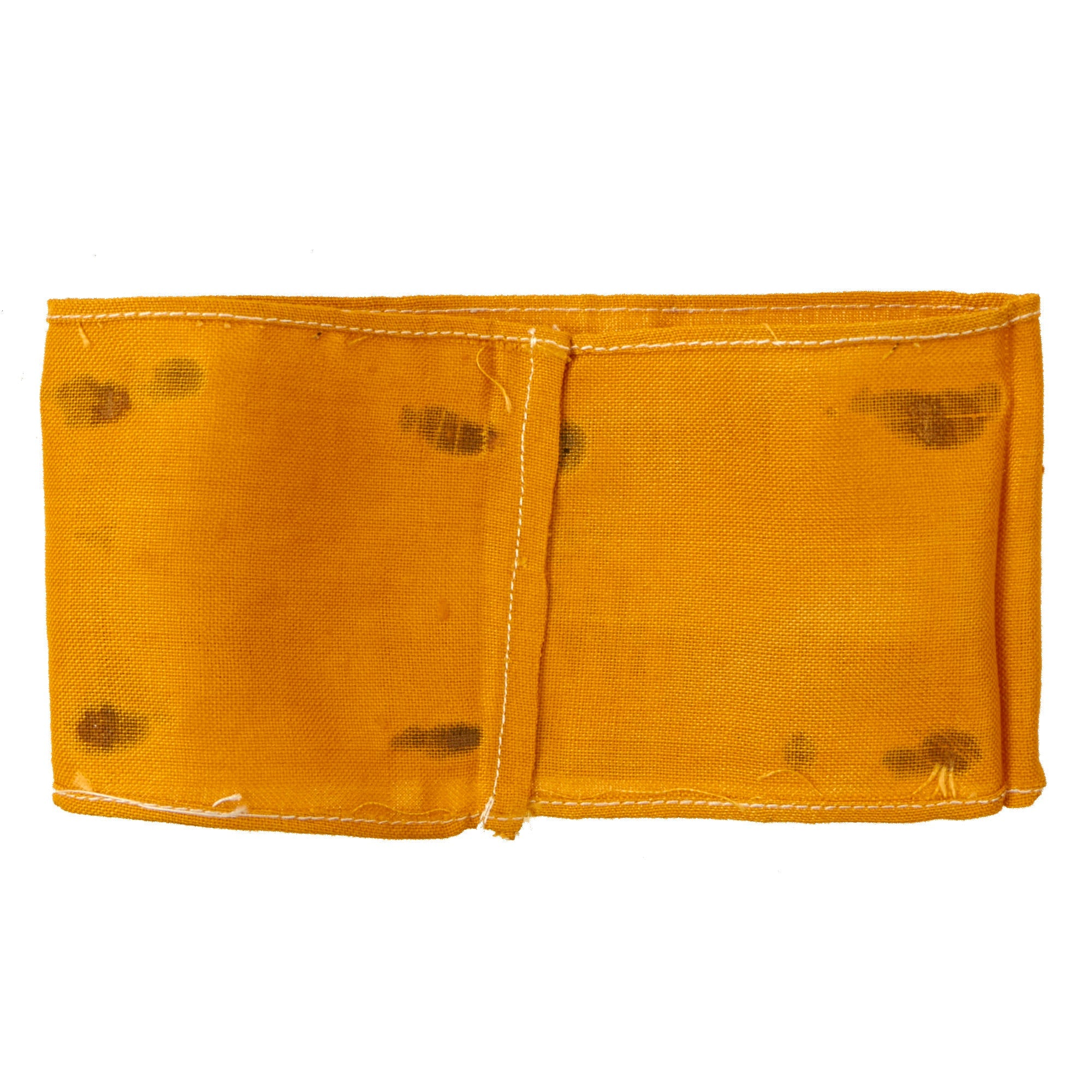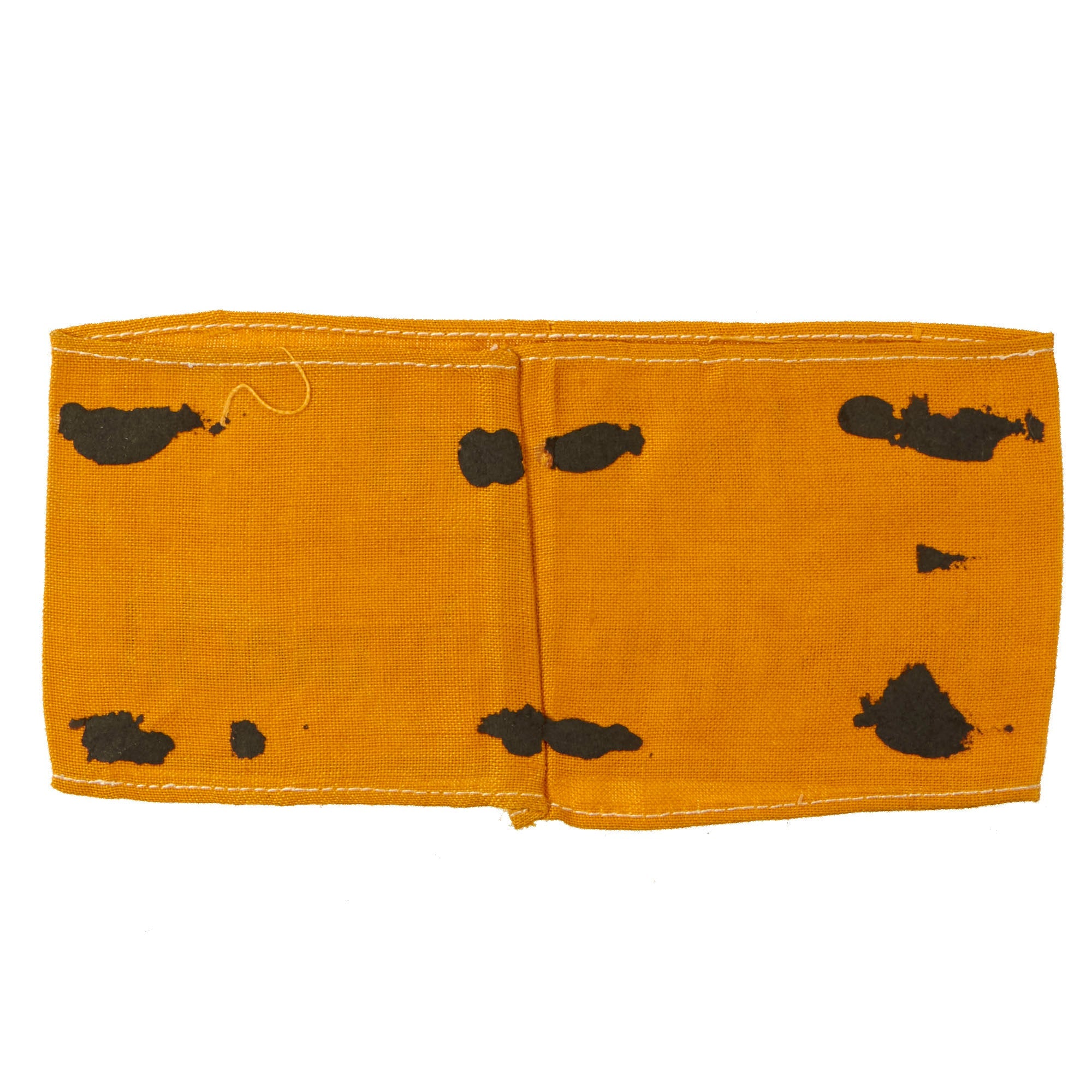 The yellow printed Im Dienst der Deutschen Wehrmacht ("In Service of the German Armed Forces") armband was introduced on 1 October 1941 for wear by non-German civilians serving the Armed Forces and for Russian Auxiliaries when not in uniform. The armband was worn on the upper left sleeve. These were necessary to identify the growing sector of non-uniformed personnel serving in a military capacity with a branch of the German armed forces. Often, these were worn by men of the Reichsarbeitsdienst and Reichsbahn who were operating with the German Army in the occupied countries. The armband measures 16" x 3 5/8", with the ends sewn together in the back. It still retains the black paper remnants on the back, and is quite flat from decades of being pressed in the scrapbook.