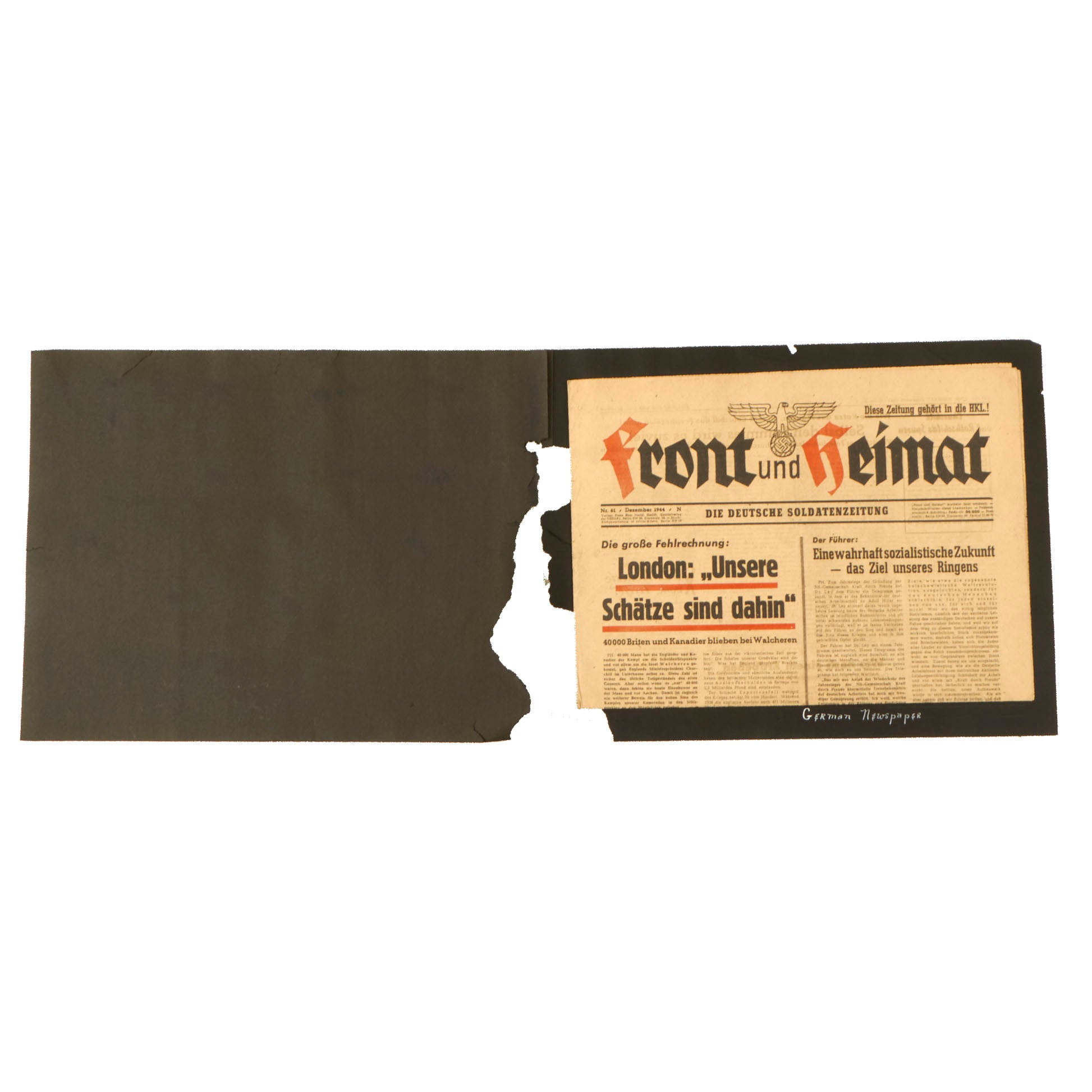 This lovely set comes with two black paper pages from such a scrapbook, each originally measuring 14 7/8" x 11", but now missing some material on the lower left. It looks like they probably fell or were torn out of the scrapbook long ago. The armbands and insignia were originally glued to the page labeled German Arm Bands and insignia, but were removed or fell off, and the second page is labeled German Newspaper, which still has the Dezember 1944 edition of the propaganda newspaper Front und Heimat (Front and Home) attached to it.