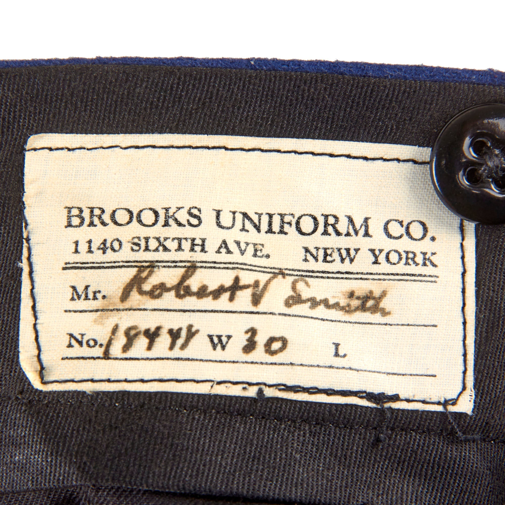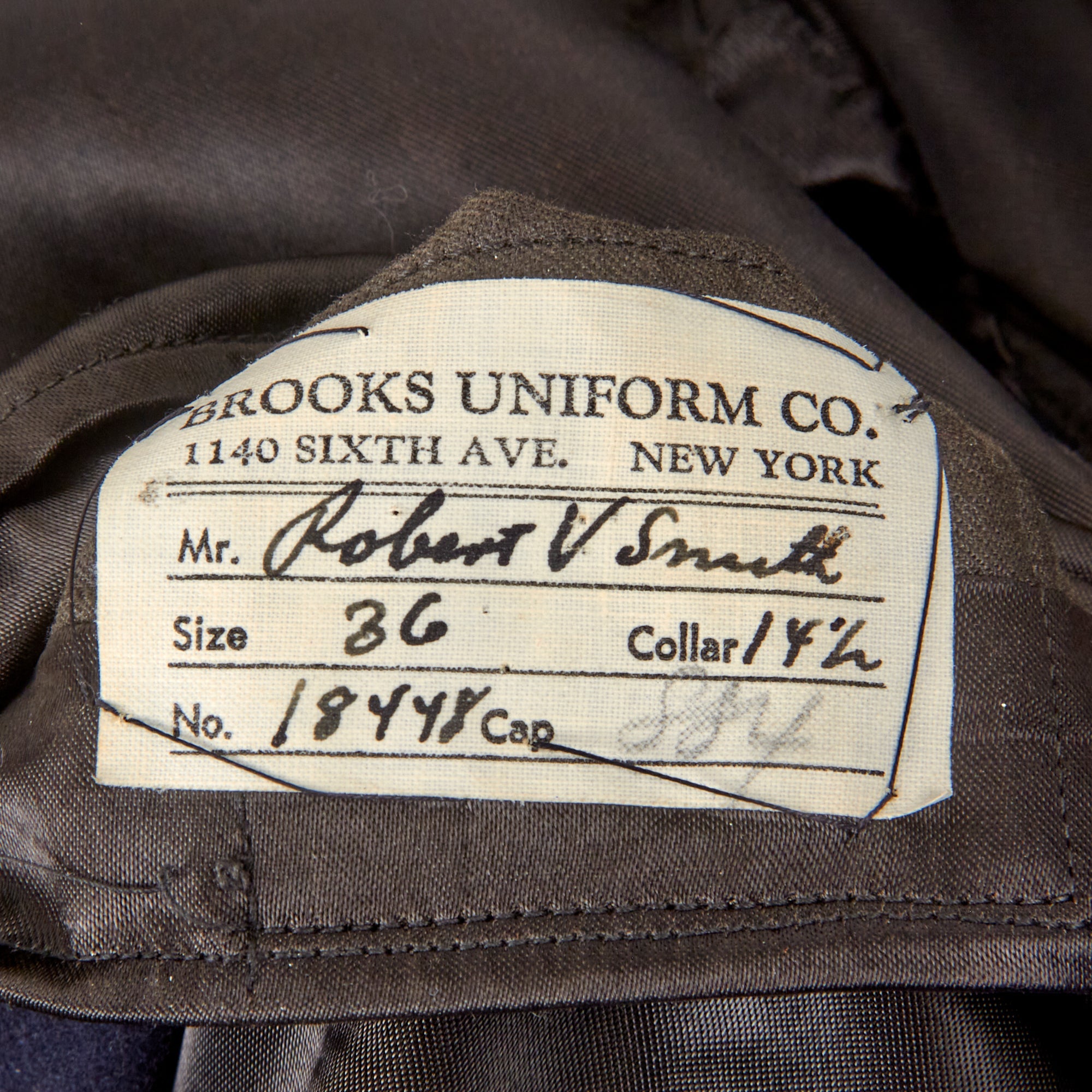 Smith’s WWII Marine Corps dress blues uniform has 3rd Marine Air Wing patches on both shoulders, Corporal chevrons on both sleeves, and Marine Aerial Radio Operator diamond patches on each cuff. We found in one of Smith’s muster rolls that he was listed as a Radio Repairman, so this is likely what he did while in the air. There are EGA collar insignia, and on the left breast is a set of Sterling Marine Aircrew wings by Amico with three attached campaign stars over a two place ribbon bar with the Navy Presidential Unit Citation with star and the Asiatic Pacific campaign medal with two stars. Under this is an Expert Rifleman badge. The jacket is roughly a size 38 US. There is a nametag in the pocket reading Robert V. Smith by Brooks Uniform Co.