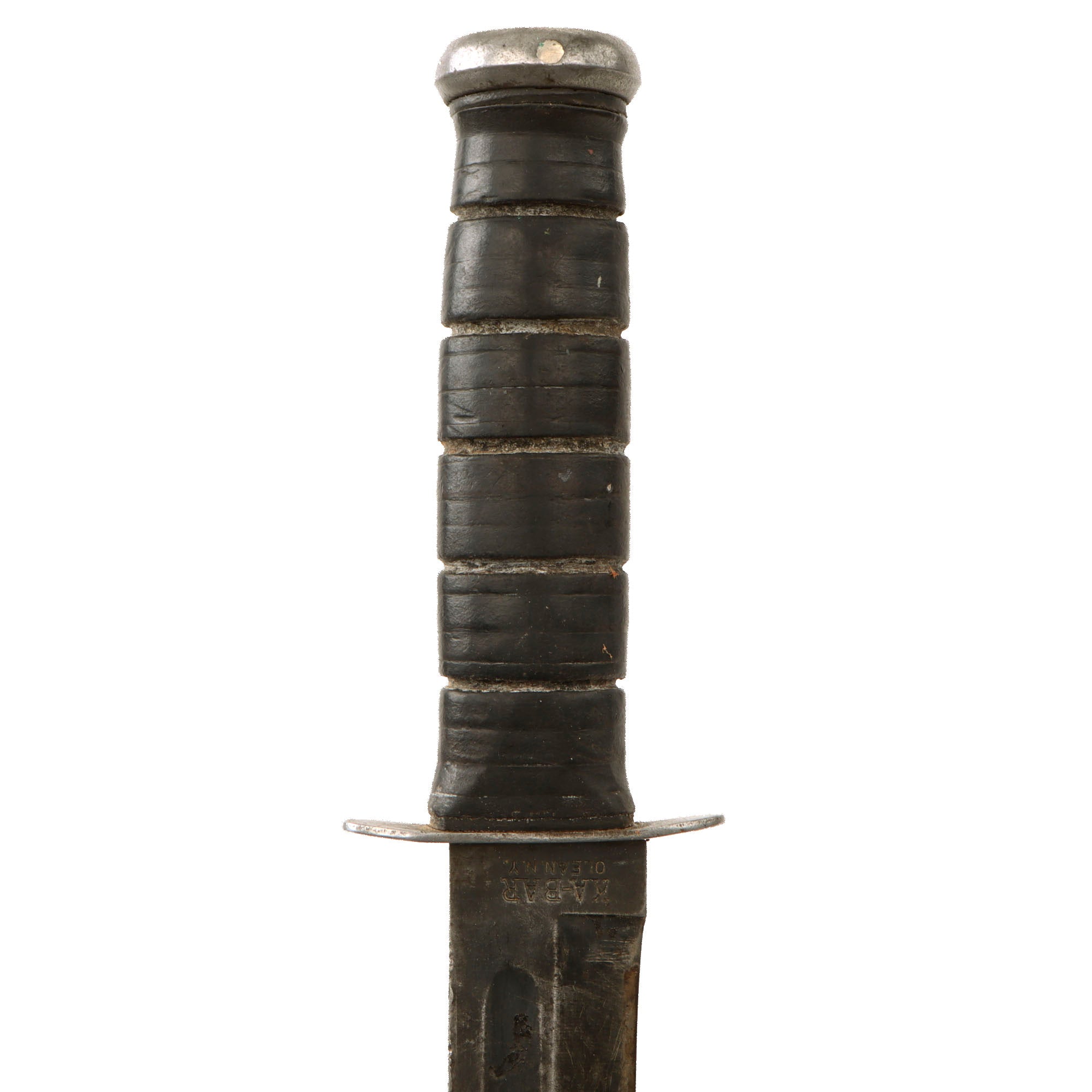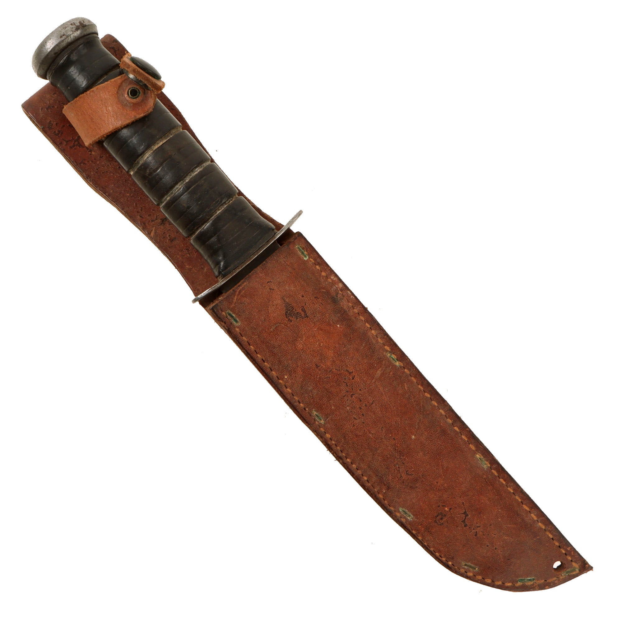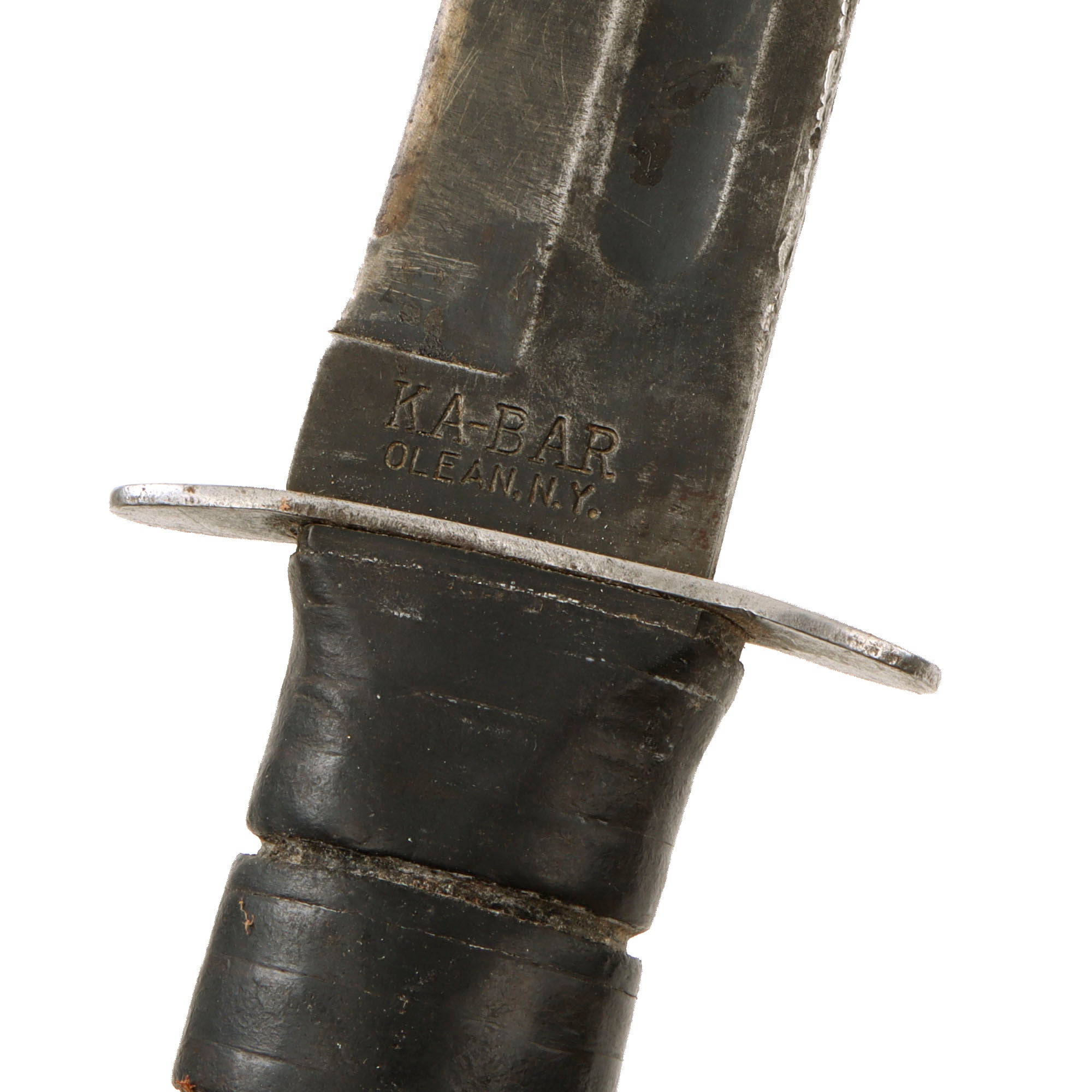 A great example of an exceptionally hard to find USMC-marked "KA-BAR" knife, field used with a very nice original leather sheath. No collection is complete without one! Ready to display!