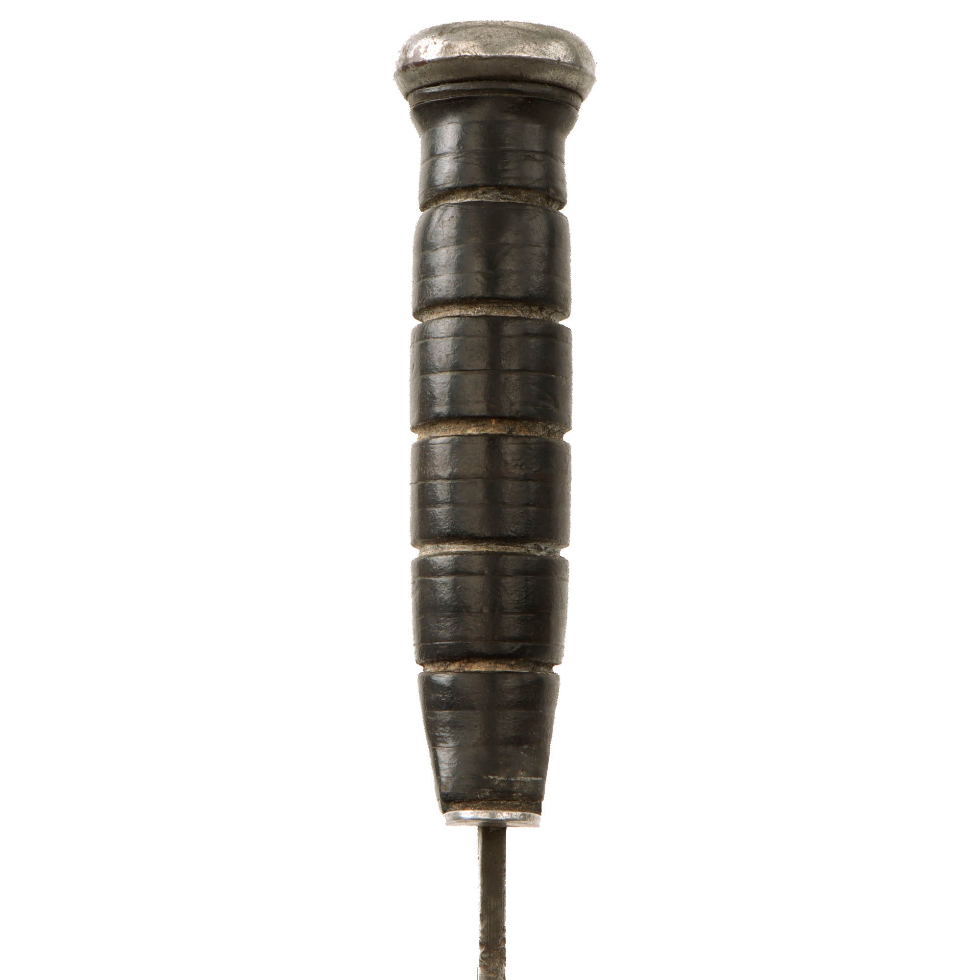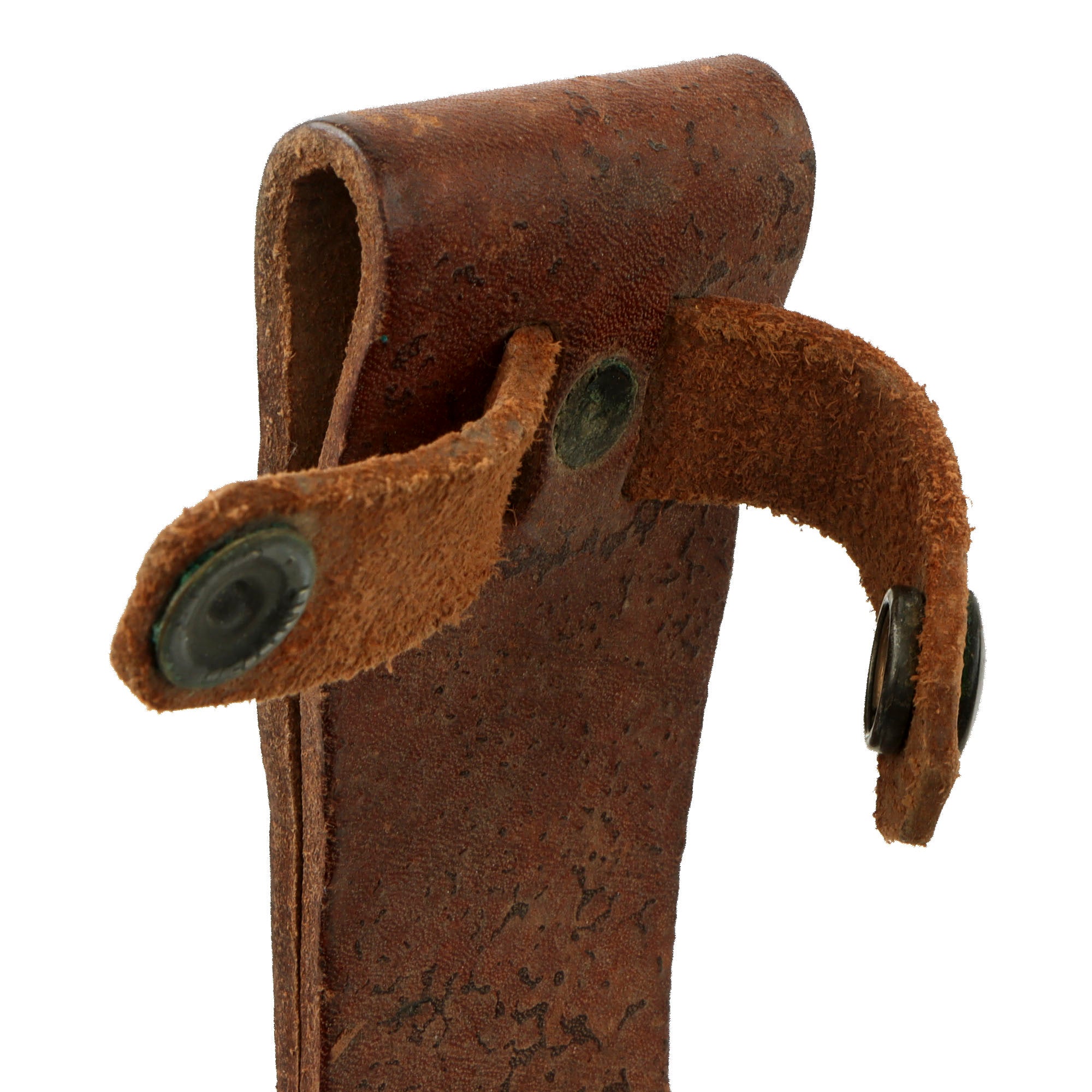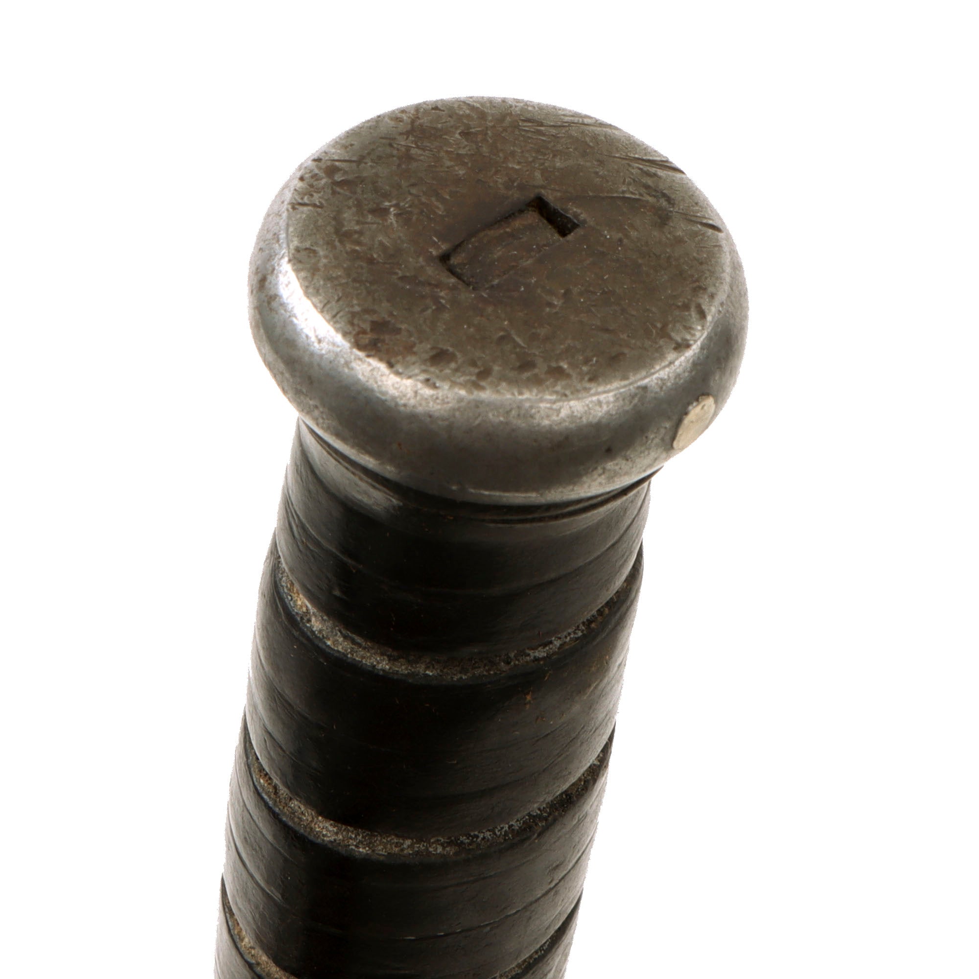 The knife features original polished leather washer grip, which is in fair condition, with heavy wear to the finish, and it has a 1/4" steel pommel with cross pinned tang. The grip is quite worn from field use. The blade retains some of the original blackened finish, with the original factory ground edge still visible.