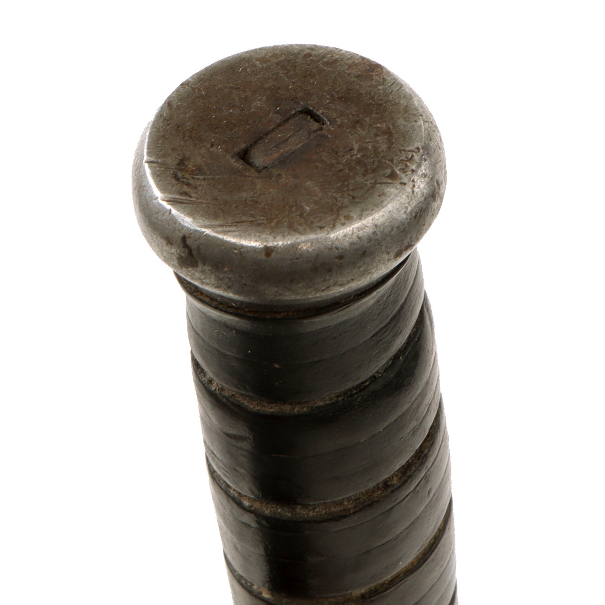 There is the Olean address under the "KA-BAR", and the "USMC" is large, which is correct for the mid war made USMC marked knives by Union Cutlery. It has the correct larger rectangular tang with a 1/4" thick pommel that is cross pinned to the tang. It also has the correct "fat" stacked polished leather handle which is now very dark. The blade has heavy wear with some oxidation and verdigris. There are some heavy dents on one side.