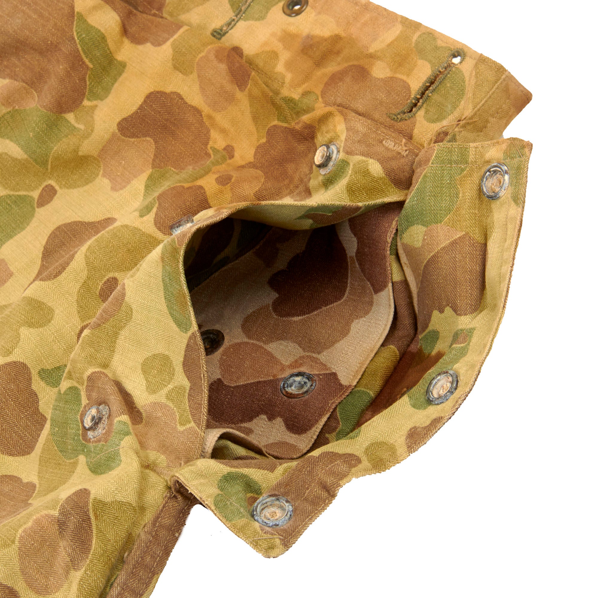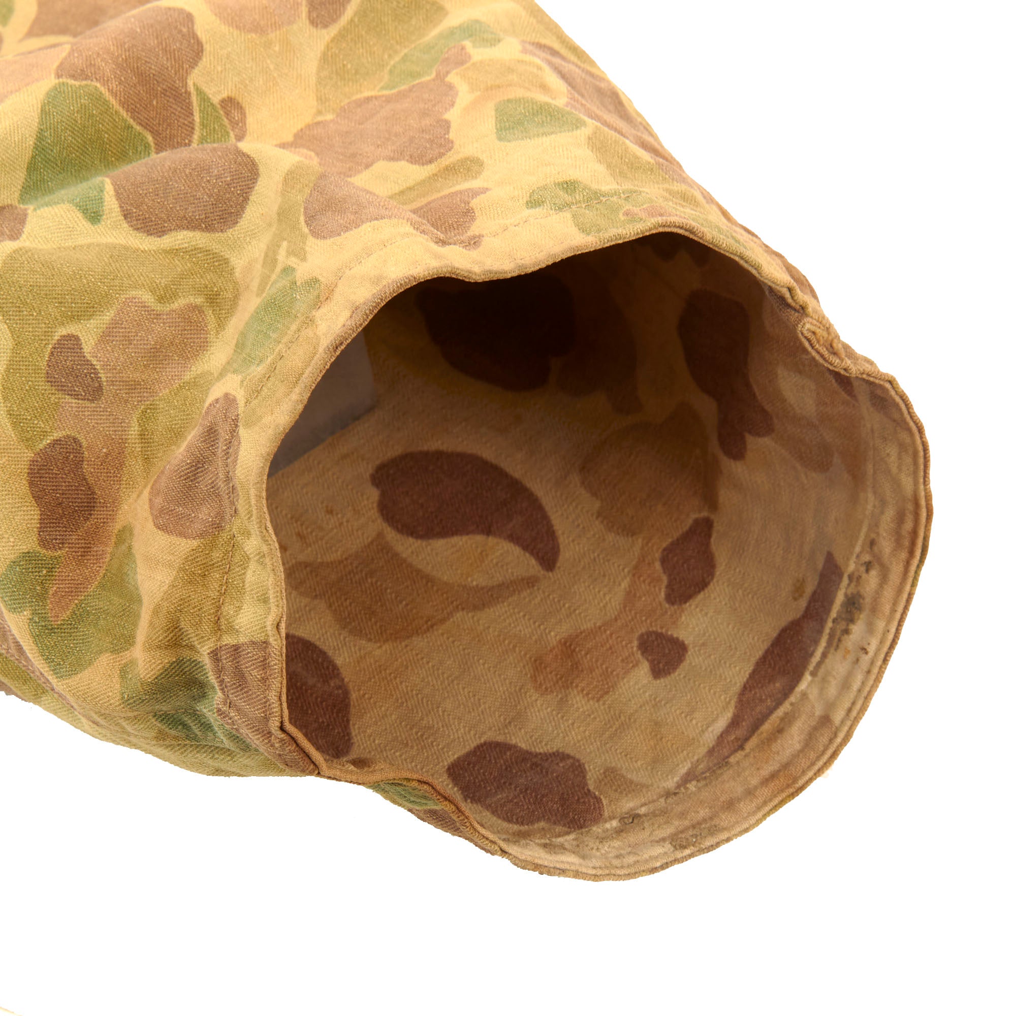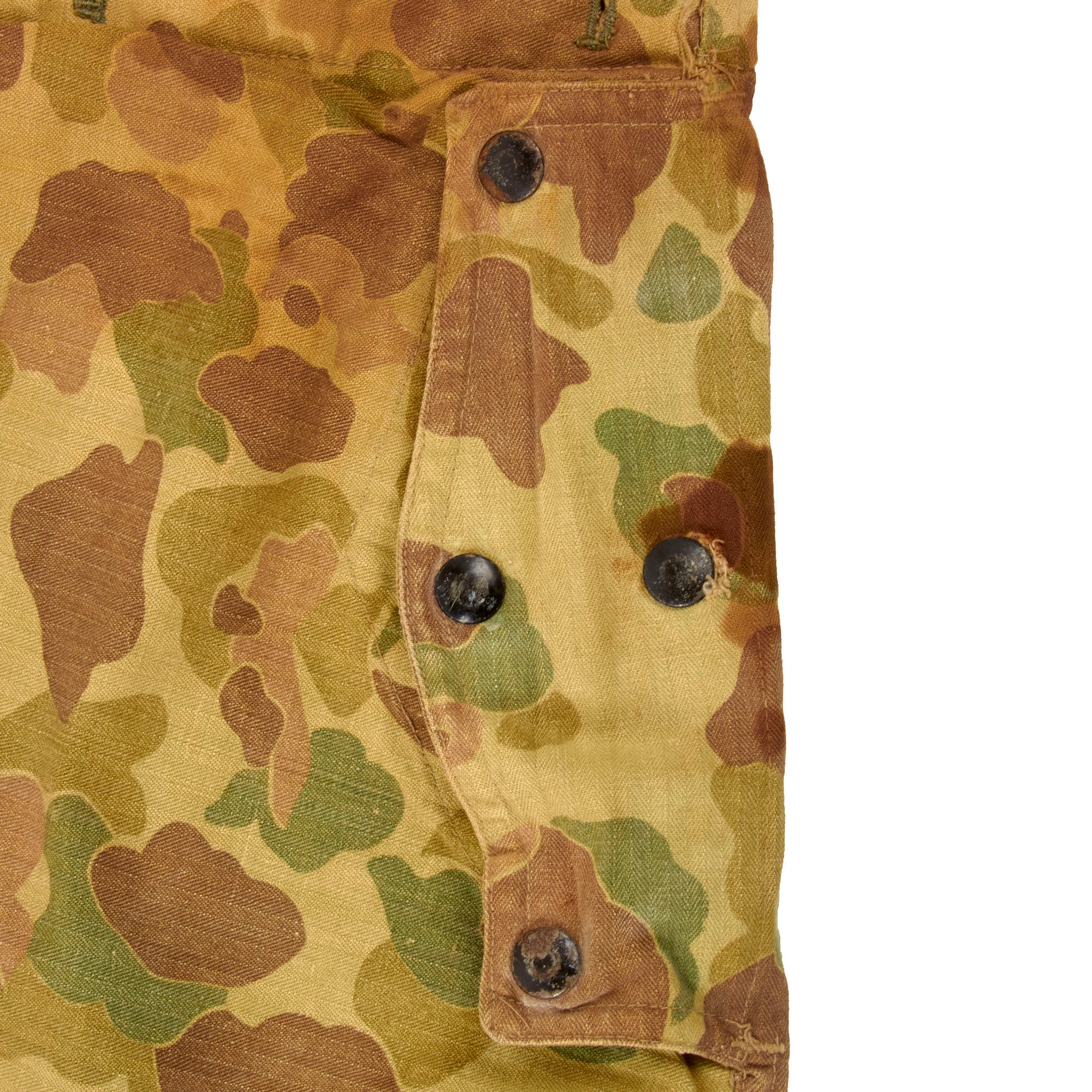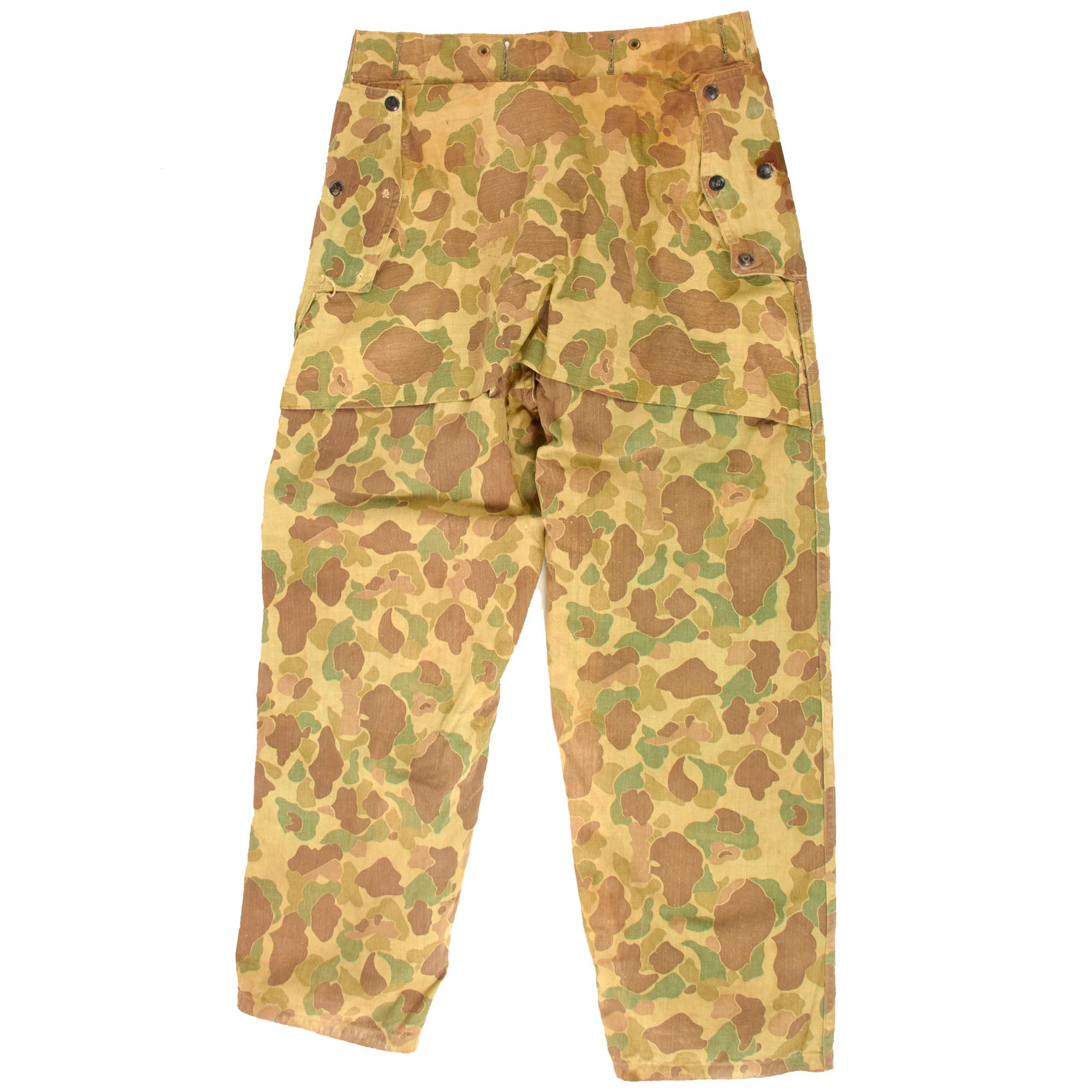 Original Item: Only One Available. This is a very service worn pair of Pattern 1944 United States Marine Corps Reversible Camouflage Utility Uniform Trousers. This cotton HBT (Herring Bone Twill) Camouflage pattern uniform was issued to Marines at the end of WWII and during the Korean war. This pattern was seen as an improvement over the one-piece "jungle" coveralls, which lacking a drop seat, made "relieving yourself" difficult in combat situations. However, the Marines who wore the Camouflage on Tarawa and elsewhere were easy to spot when moving (as opposed to be stationary) and the pattern was discontinued. The Uniform Coat and pants were both designed to be reversible. The outer side is the base green "jungle" camouflage pattern, with the tan or "sand" side inside the jacket and pants.