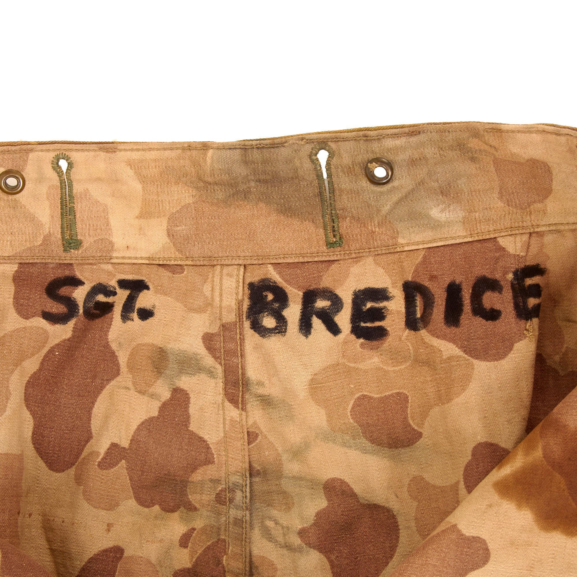 The trousers are named on the rear SGT. BREDICE, identifying the helmet to Anthony P. Bredice, who during World War II served with the 3rd Artillery Corps, attached to the 1st Marine Division. He took part in the Battle of Okinawa and several others. He remained in the Marine Corps into the Korean War era, when he was promoted to sergeant.
