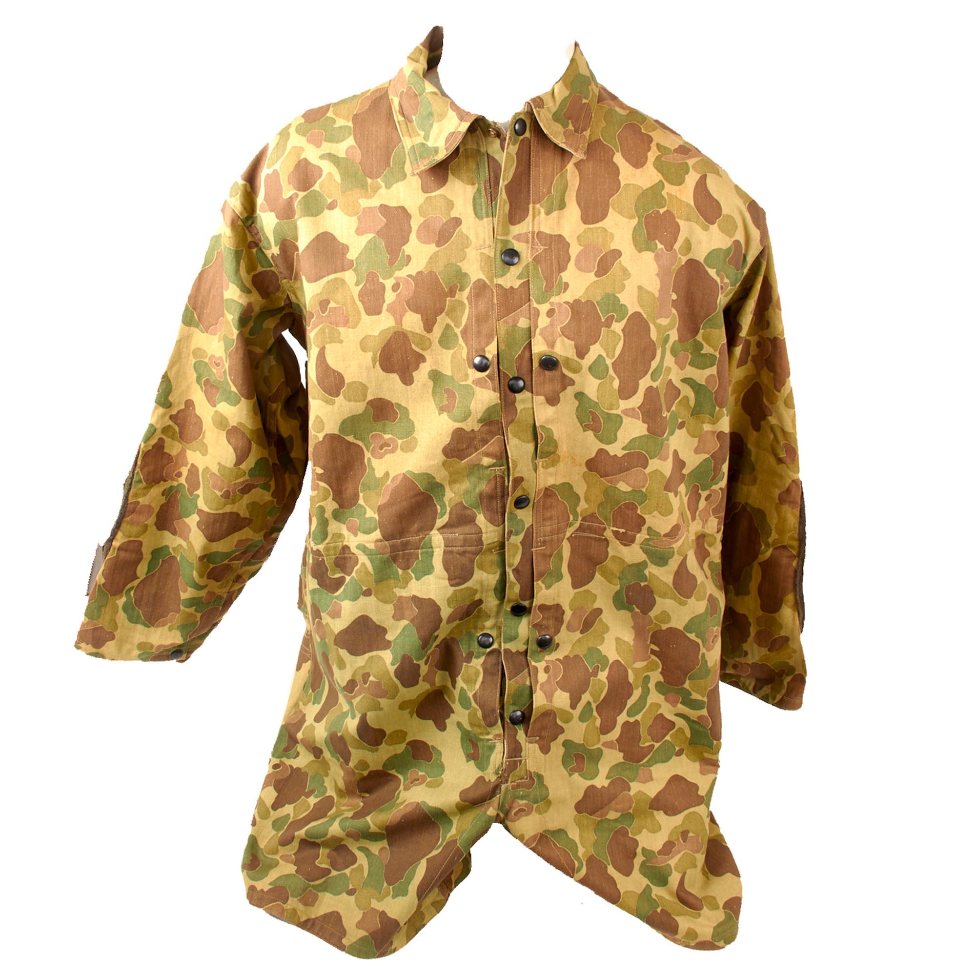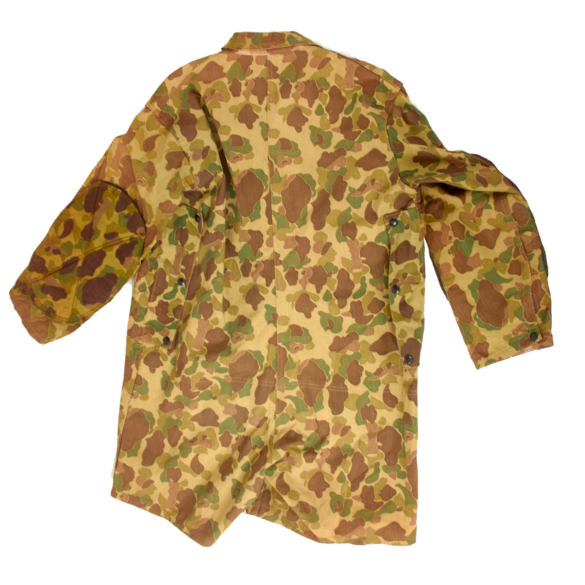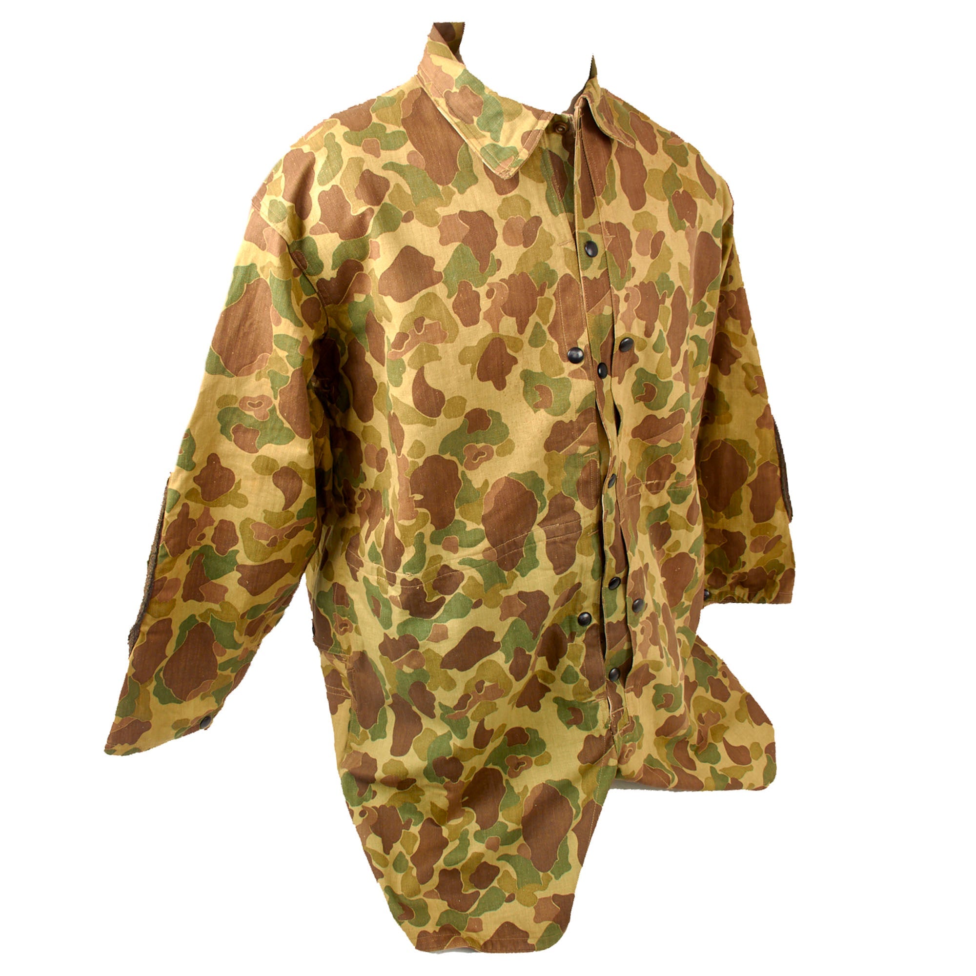 Original Item: Only One Available. This is a genuine, ultra rare, USMC 3rd pattern Step-in smock, quite similar in design to the early German paratrooper's smock. This rare example of a virtually unissued third type jump smock is made from double-sided herringbone twill cloth, with a mixed green/tan/brown jungle pattern camouflage on one side and a brown/tan beach pattern camouflage on the reverse. Configured in the "step-in" style, with black buttons. A large pocket is present on either side of the back, accessible via a 3-snap flap on the "jungle" side and a set of "Talon" branded zippers on the "beach" side. Stamped size "A" (Small). Of particular note are the integral elbow pads on each arm. It is also stamped #38 twice on the interior.
