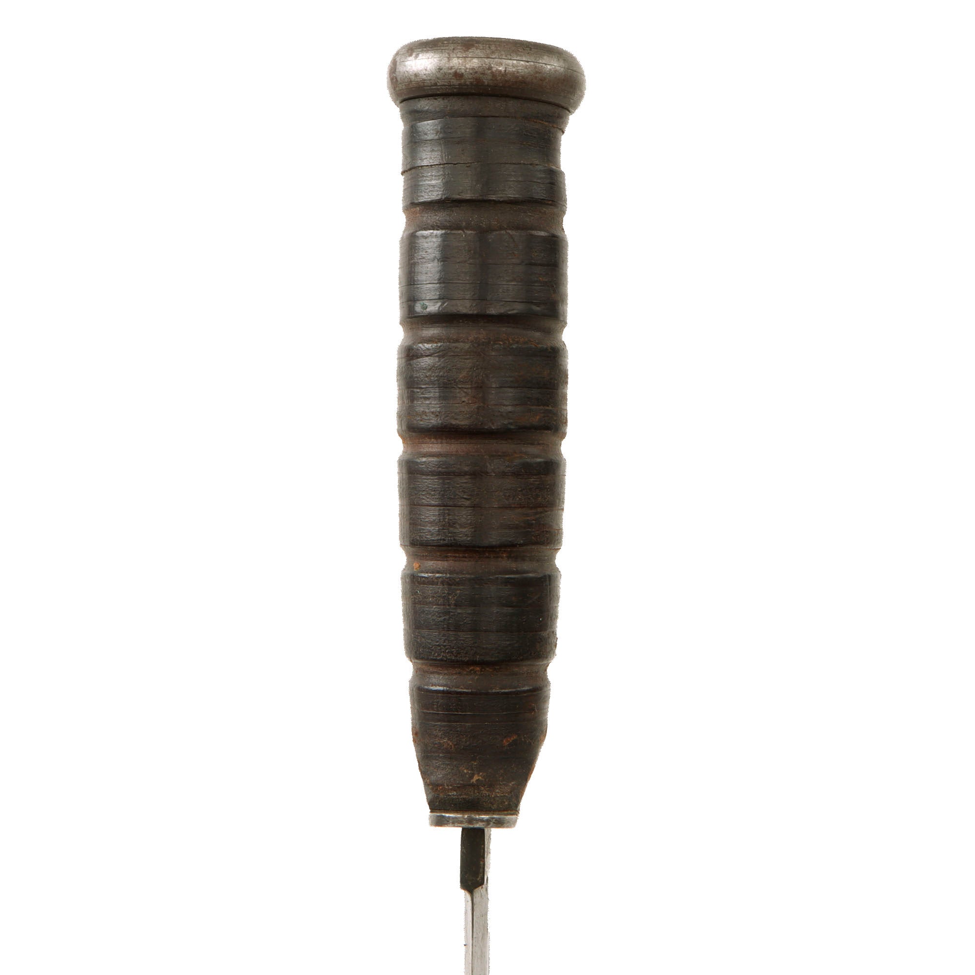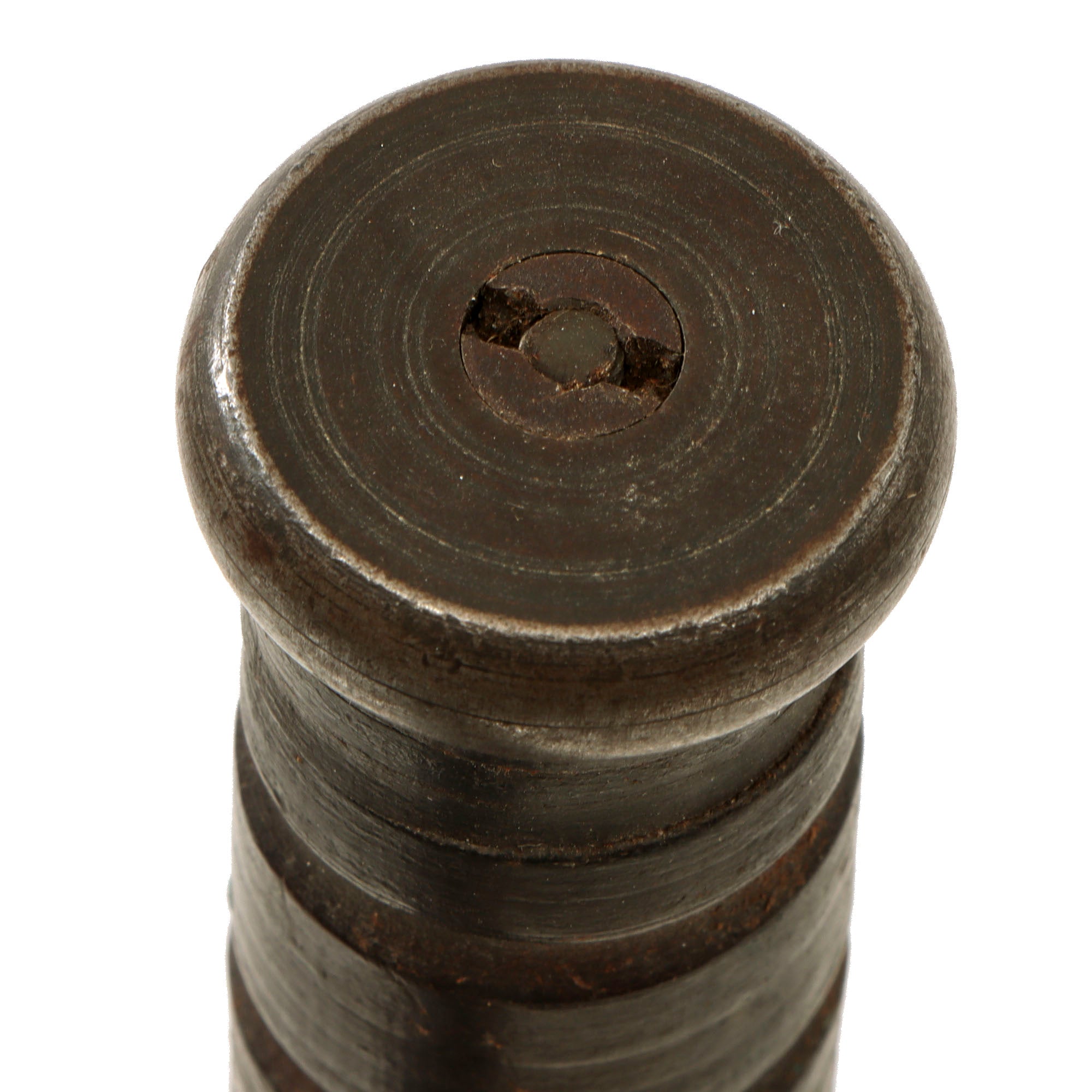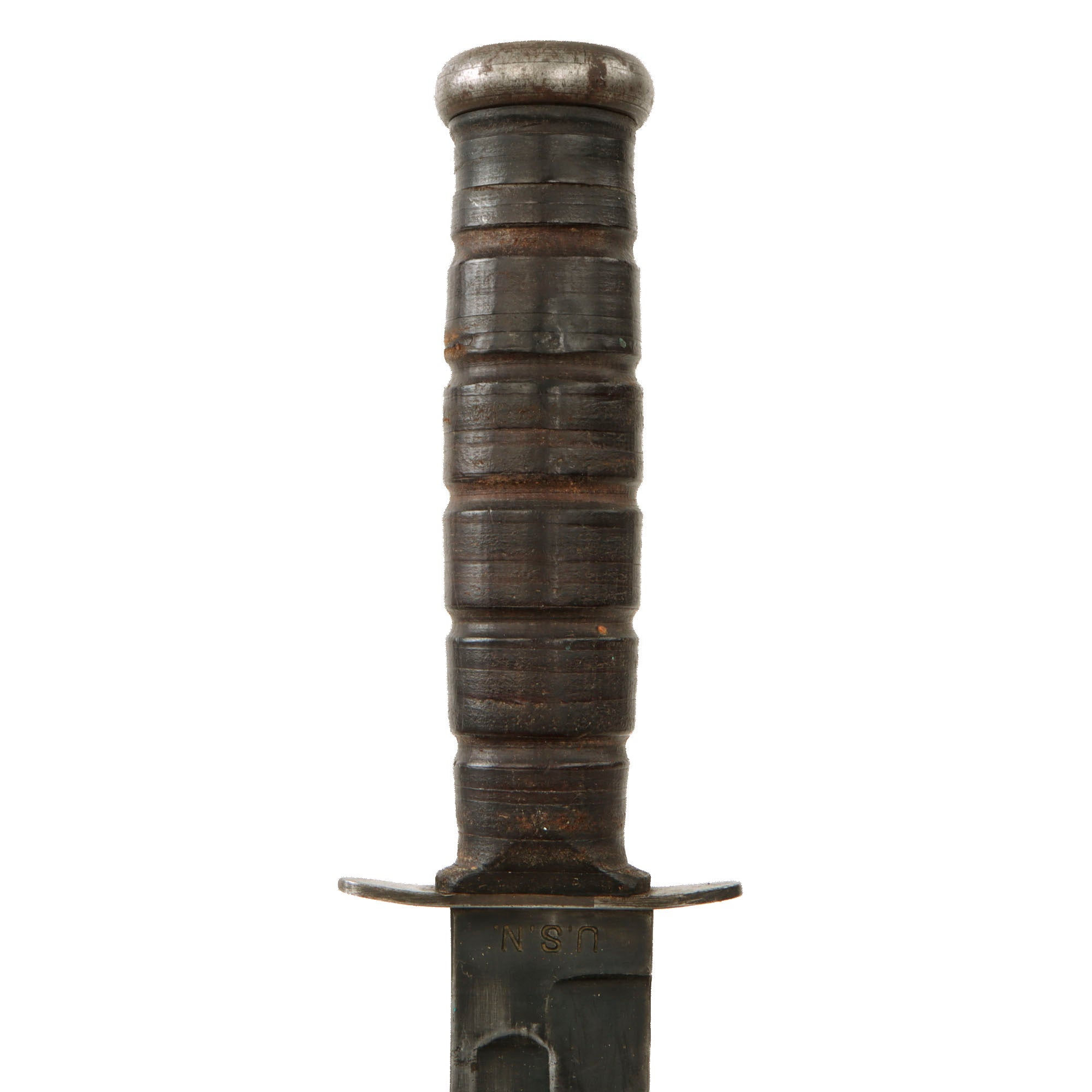 In 1944, the US Navy put through a change order to have the markings moved from the blade to the cross guard, so this knife was produced before that change. Knife features original leather washer grip, which is in great condition, with good service wear, and it has a heavy steel pommel with early threaded tang, which is a bit loose. The grip is quite shiny, as it still has some of the original factory "buffed" finish. The blade has much of the blackened finish but does show some loss from service-use.