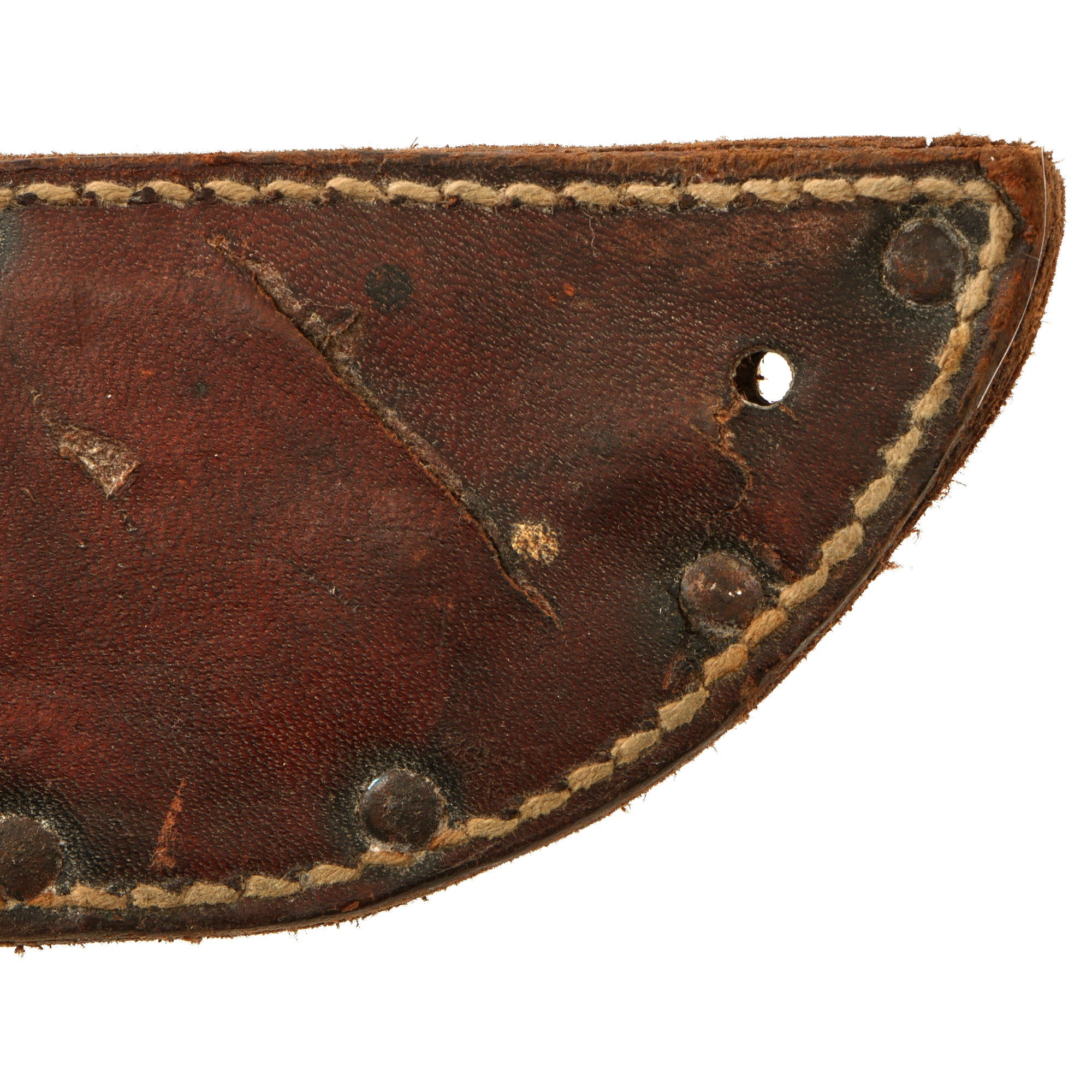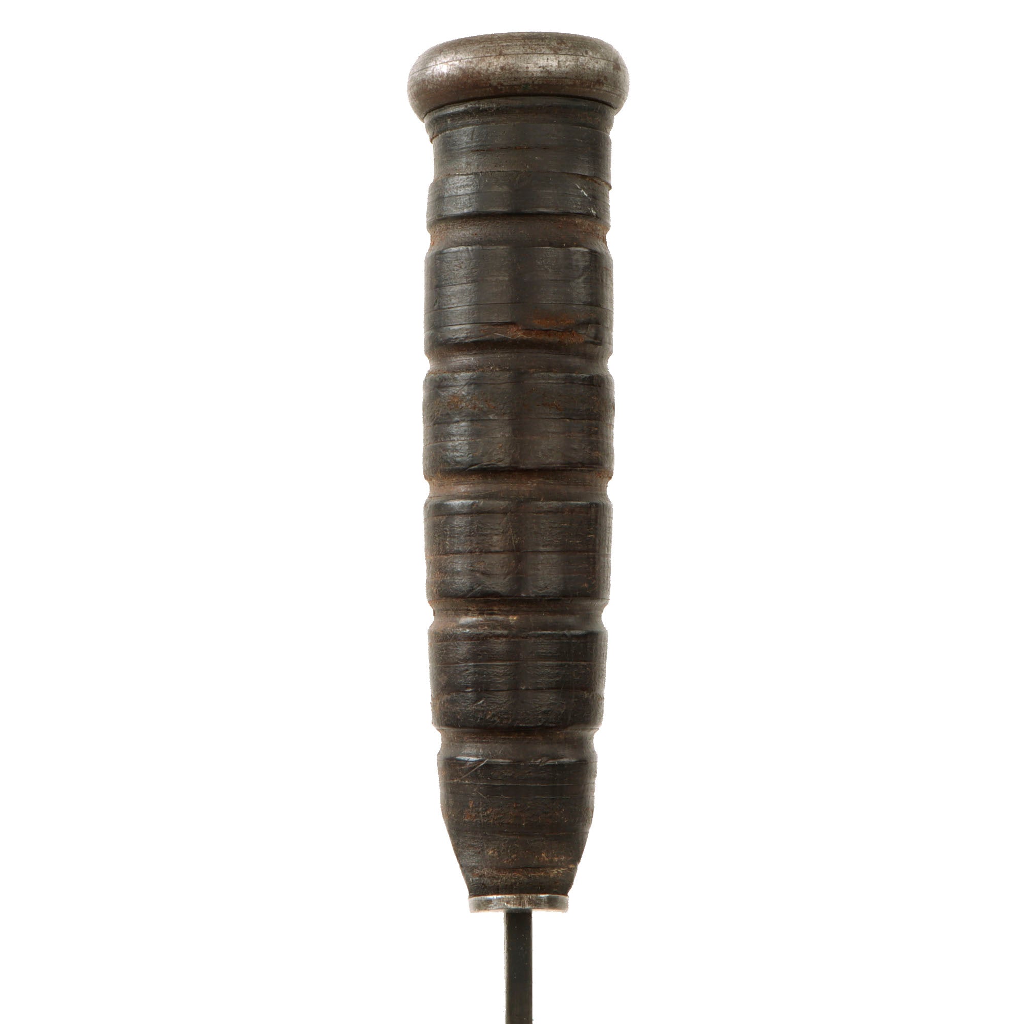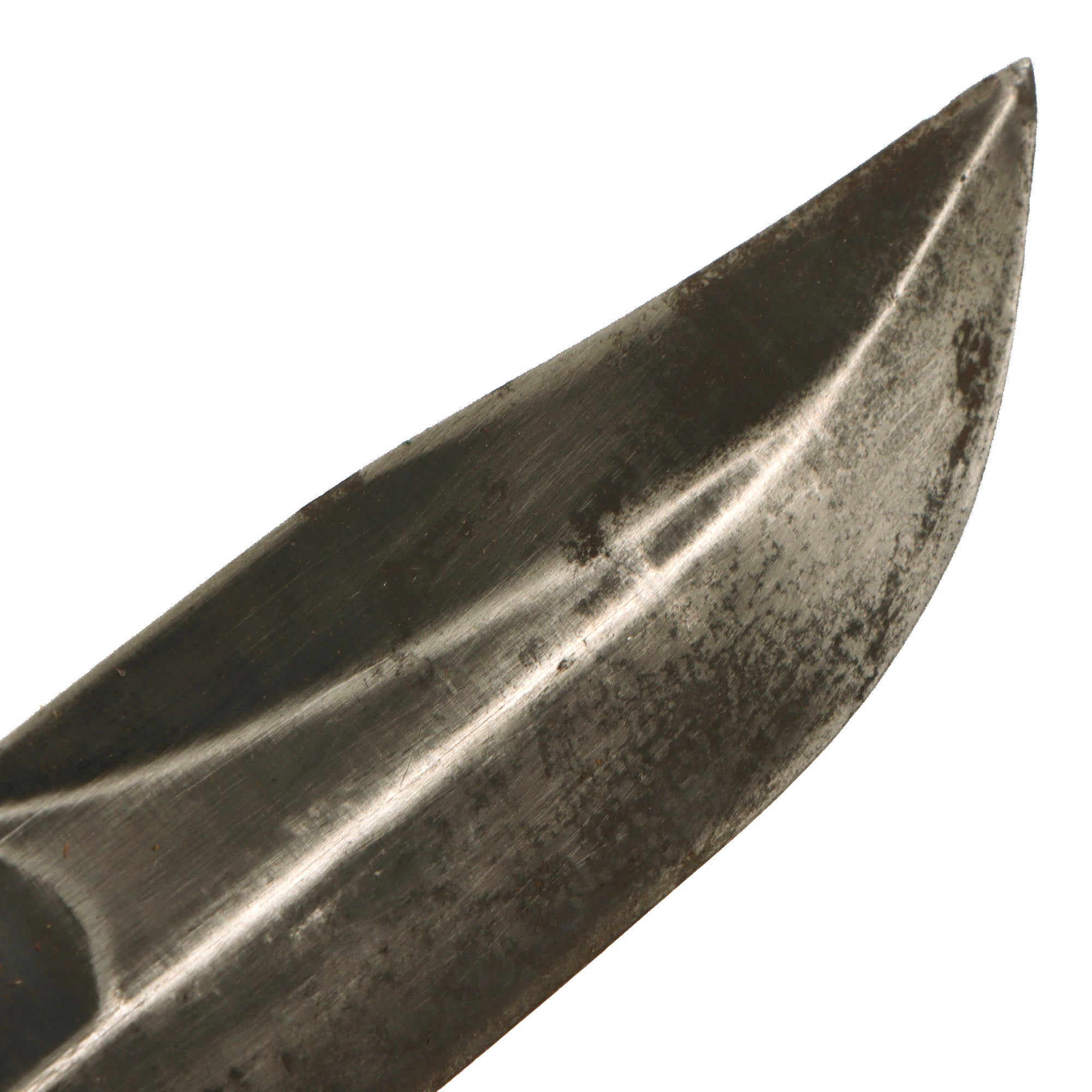 In 1944, the US Navy put through a change order to have the markings moved from the blade to the cross guard, so this knife was produced before that change. Knife features original leather washer grip, which is in great condition, with good service wear, and it has a heavy steel pommel with early threaded tang, which is a bit loose. The grip is quite shiny, as it still has some of the original factory "buffed" finish. The blade has much of the blackened finish but does show some loss from service-use.