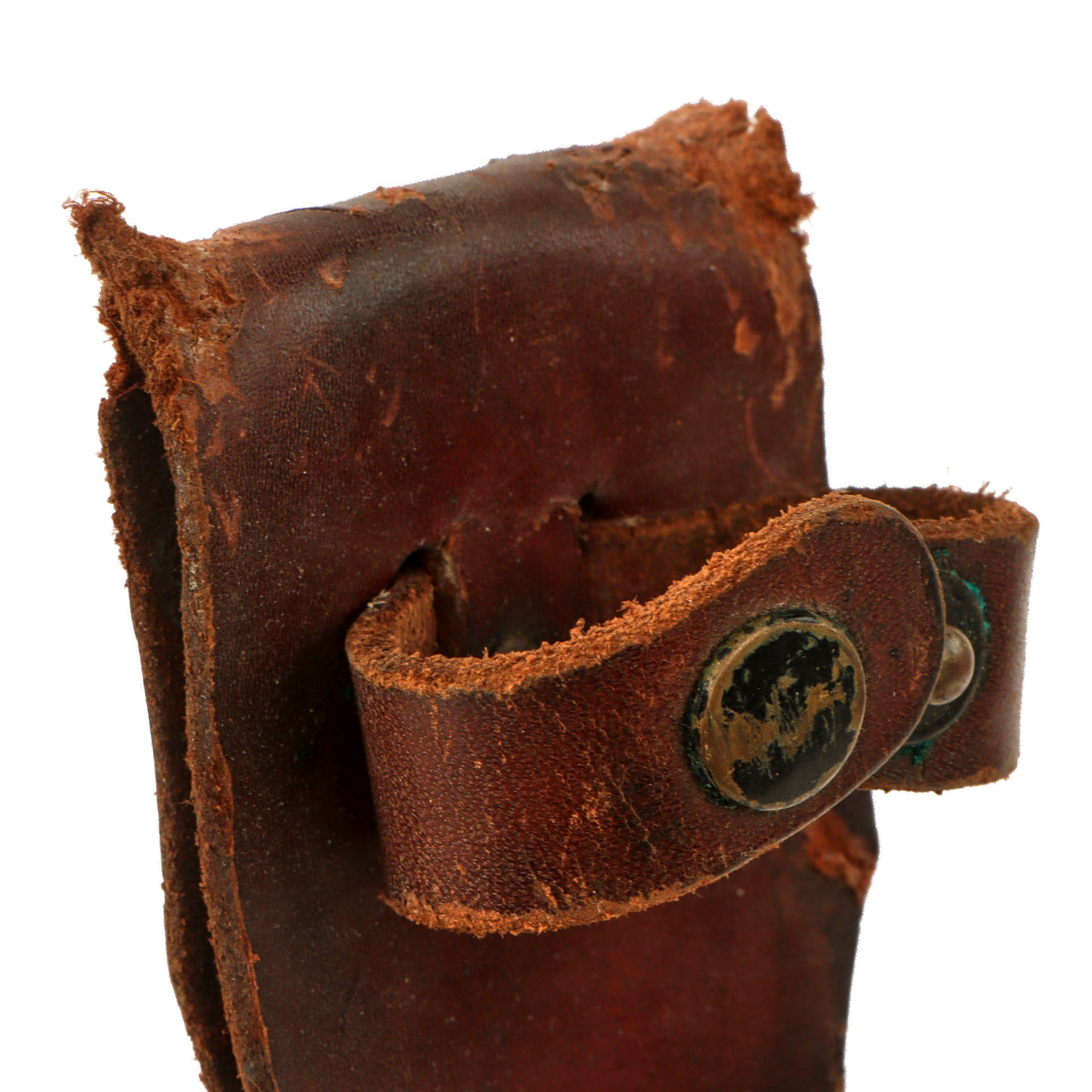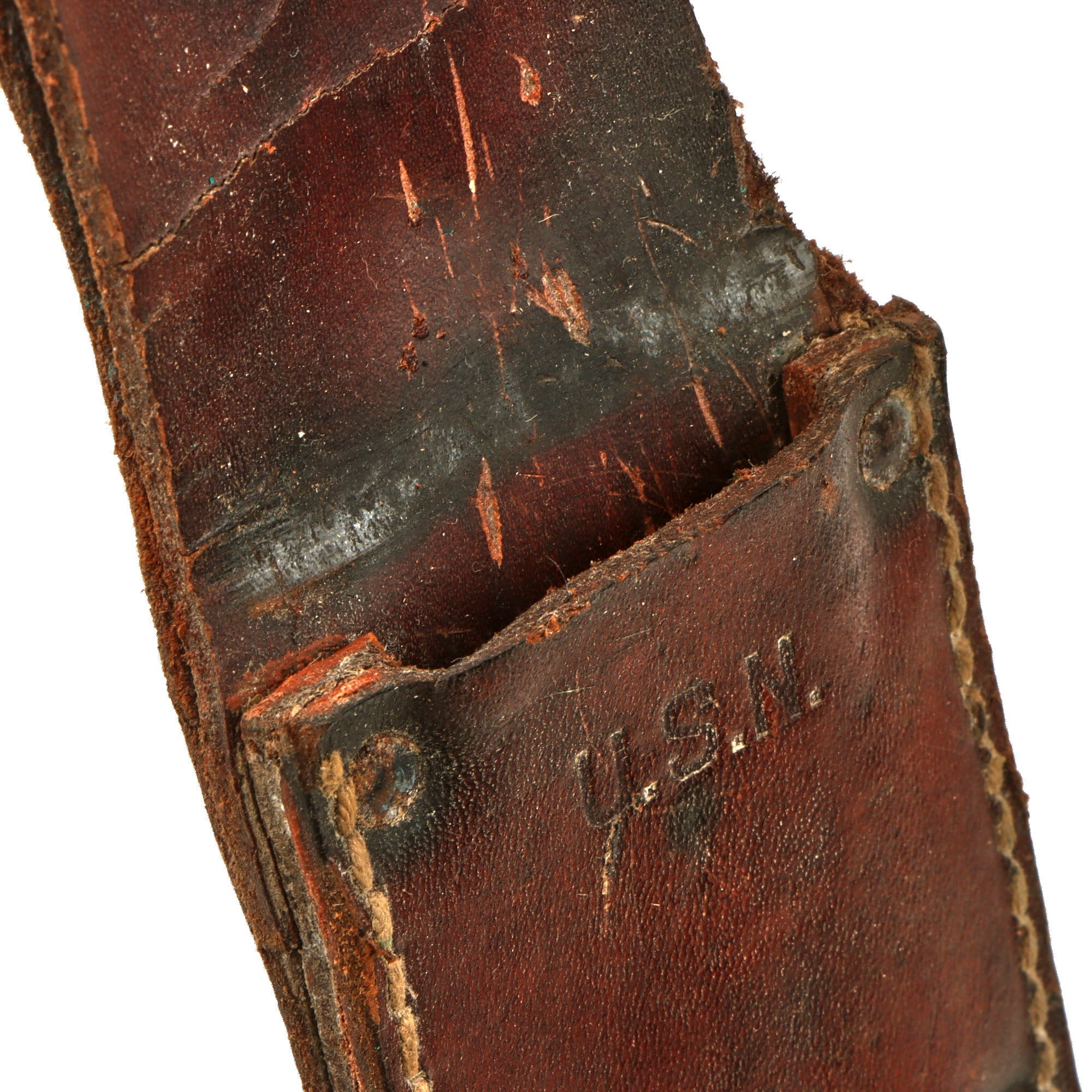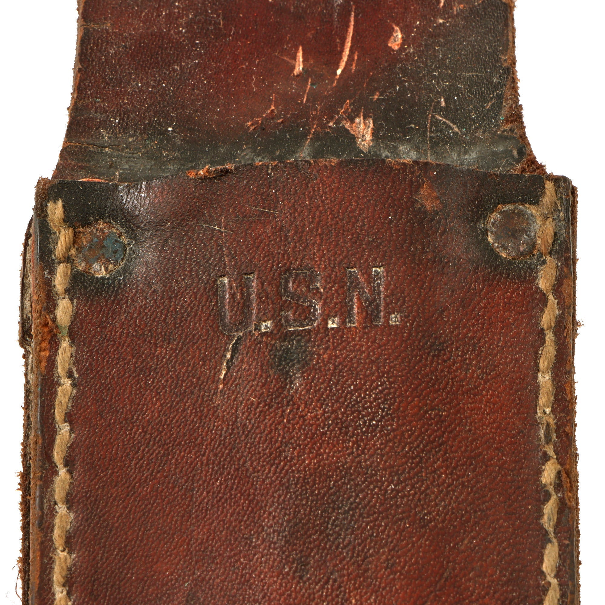 The leather sheath is the standard type used with the Mark 2, and is in good, used condition. The leather has some dry roy and cracking as shown with rubbing of the material.There is cracking and crazing as well. All of the stitching and rivets are still intact, and it is structurally very sound. The securing strap is intact, and the snap is still functional, with a faded finish. The front is correctly marked with USN.
