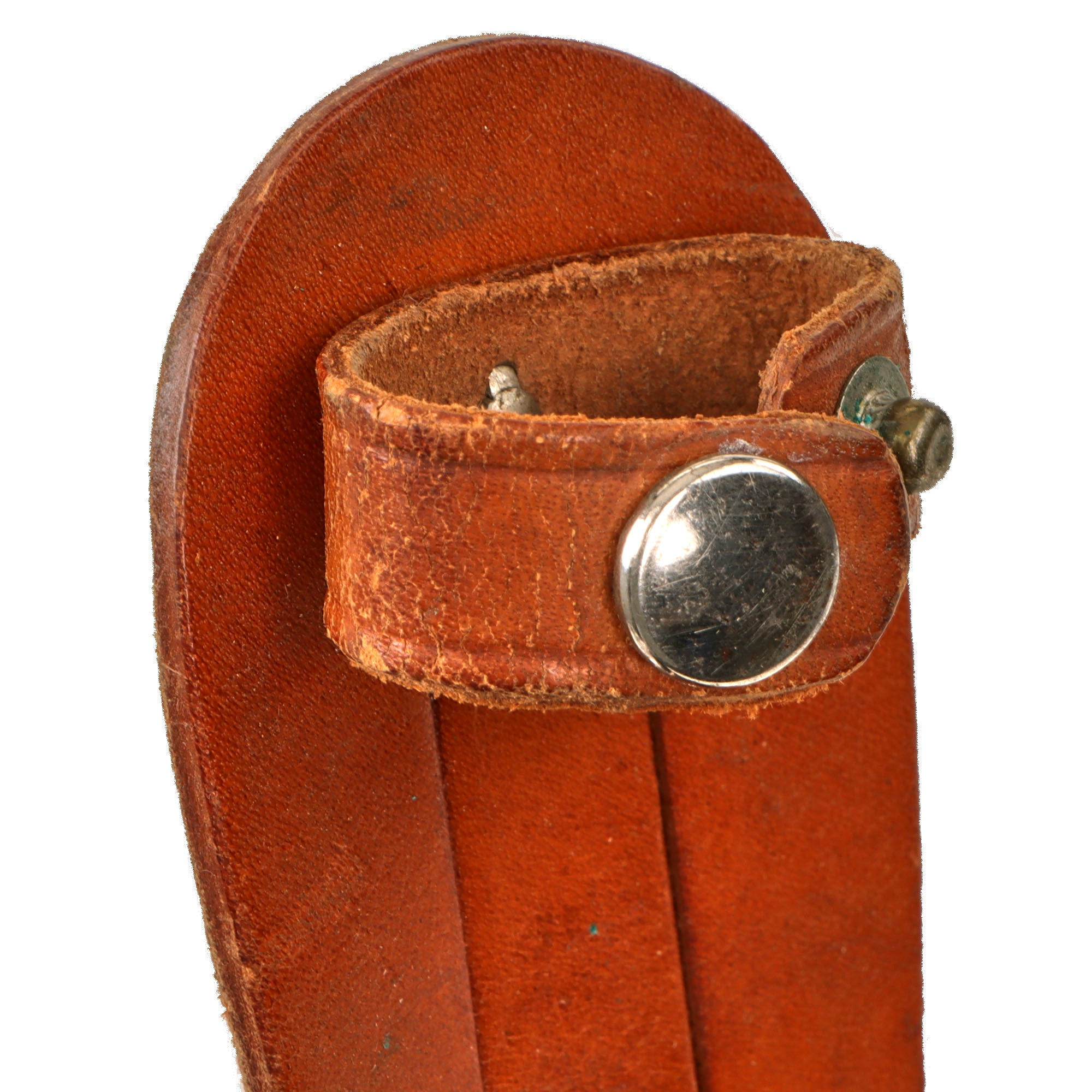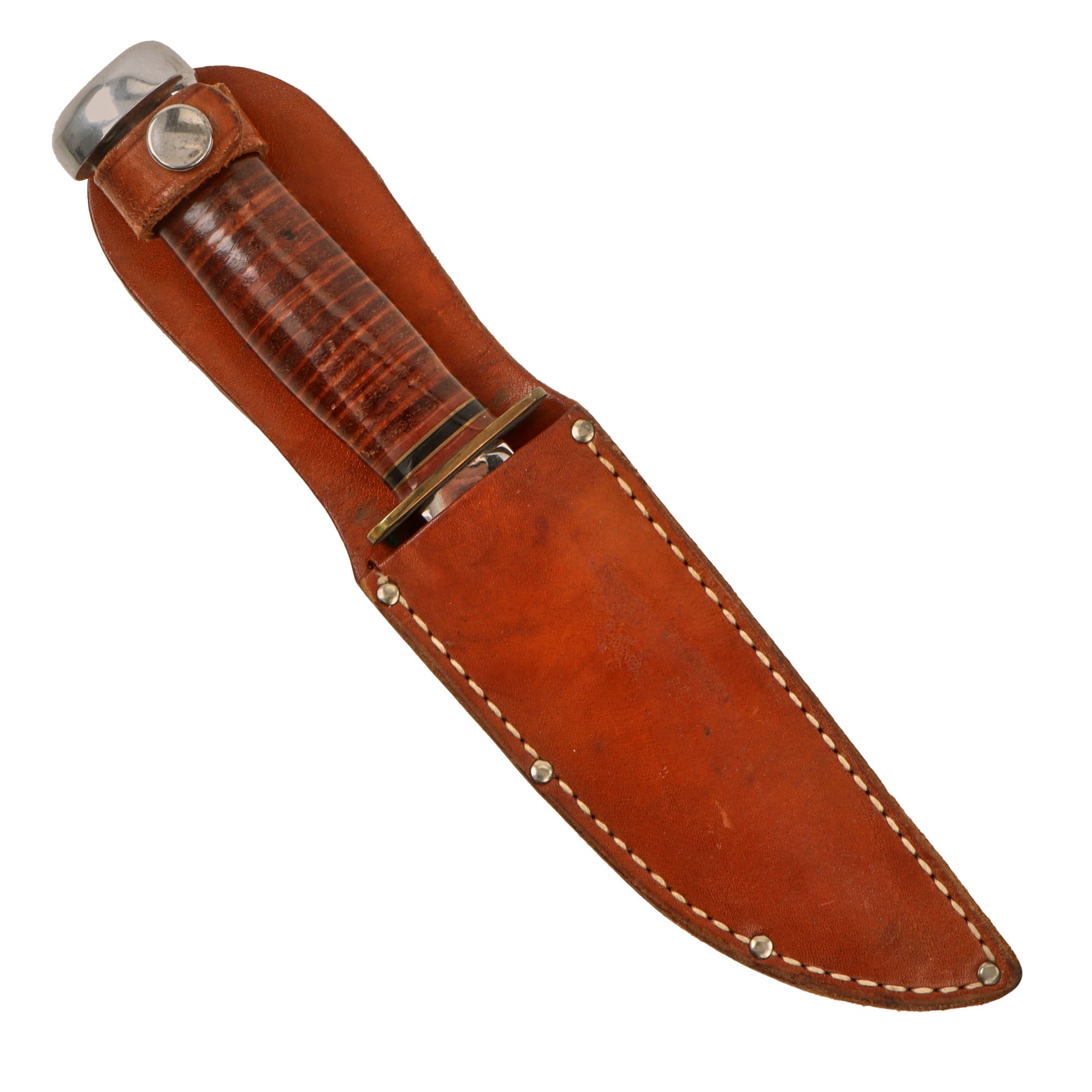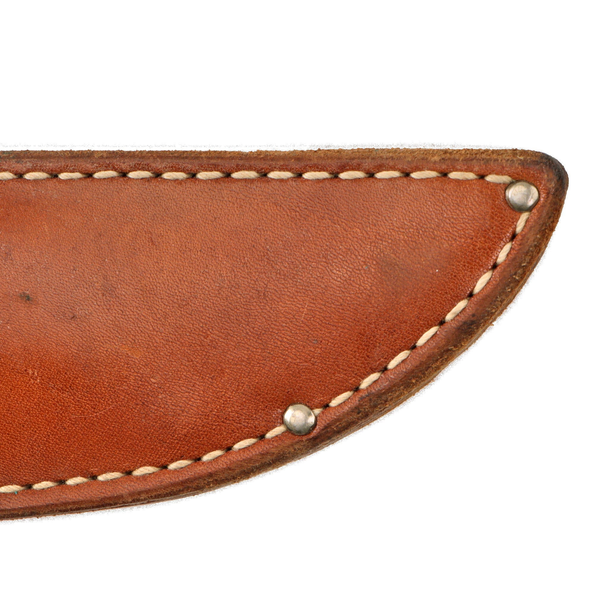 The sheath is the standard belt sheath for private purchase fighting knives like this one, and retains the leather securing strap with a working snap. The length of the sheath is 9 ¾” including the belt loop.