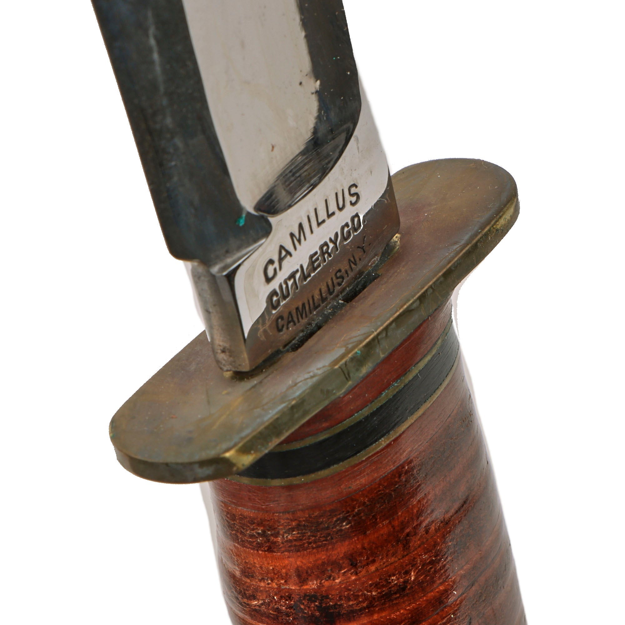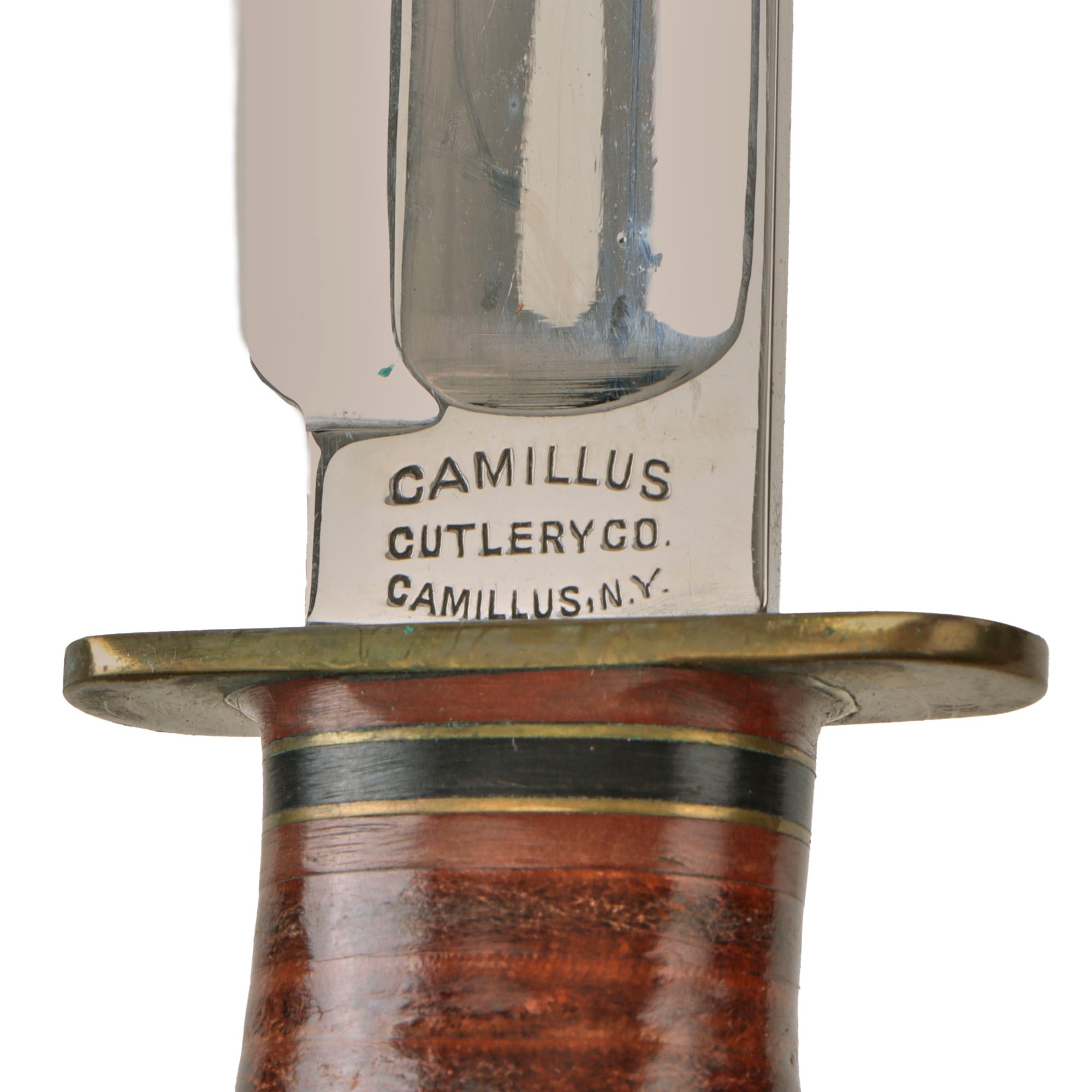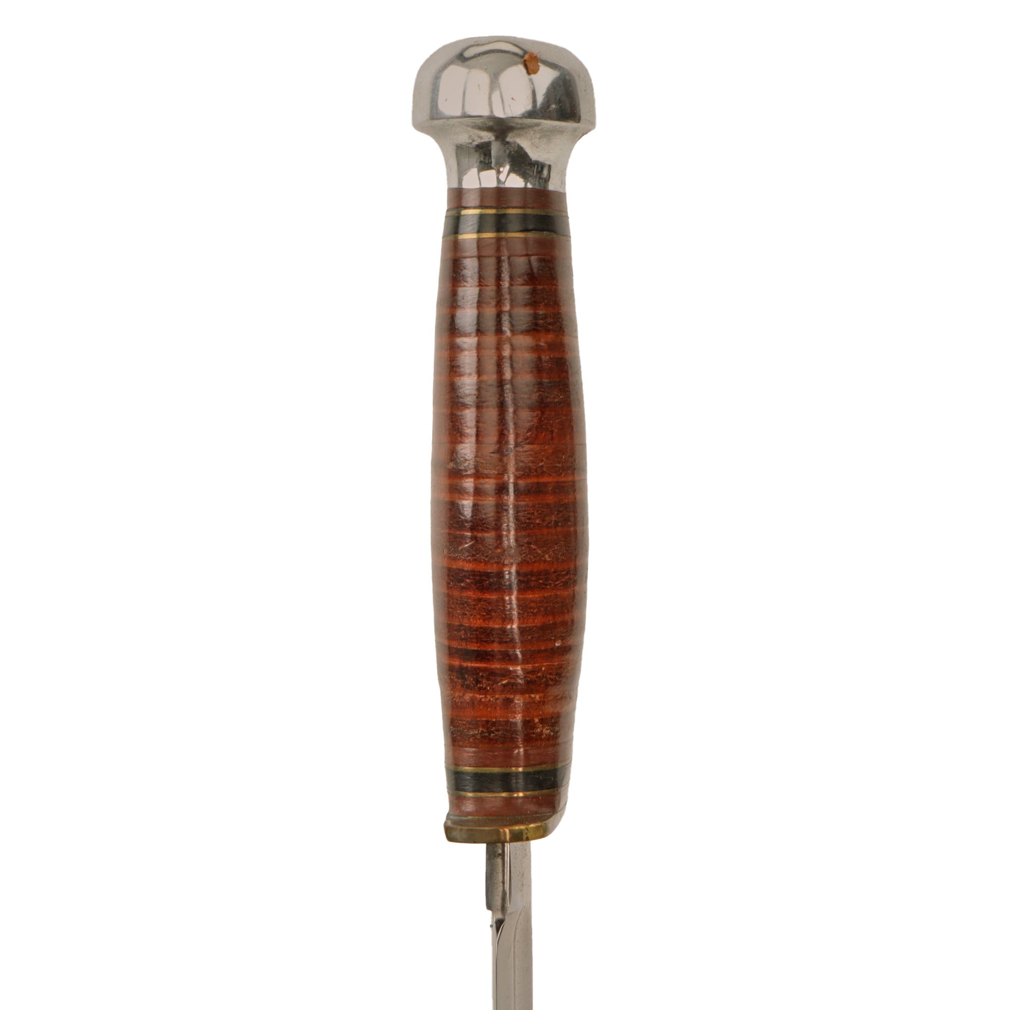 This is most likely a commercial version of that knife, sporting a 5” chromed blade with a wide fuller on each side. The blade is in the bowie style. The overall length is 9 ⅛”.