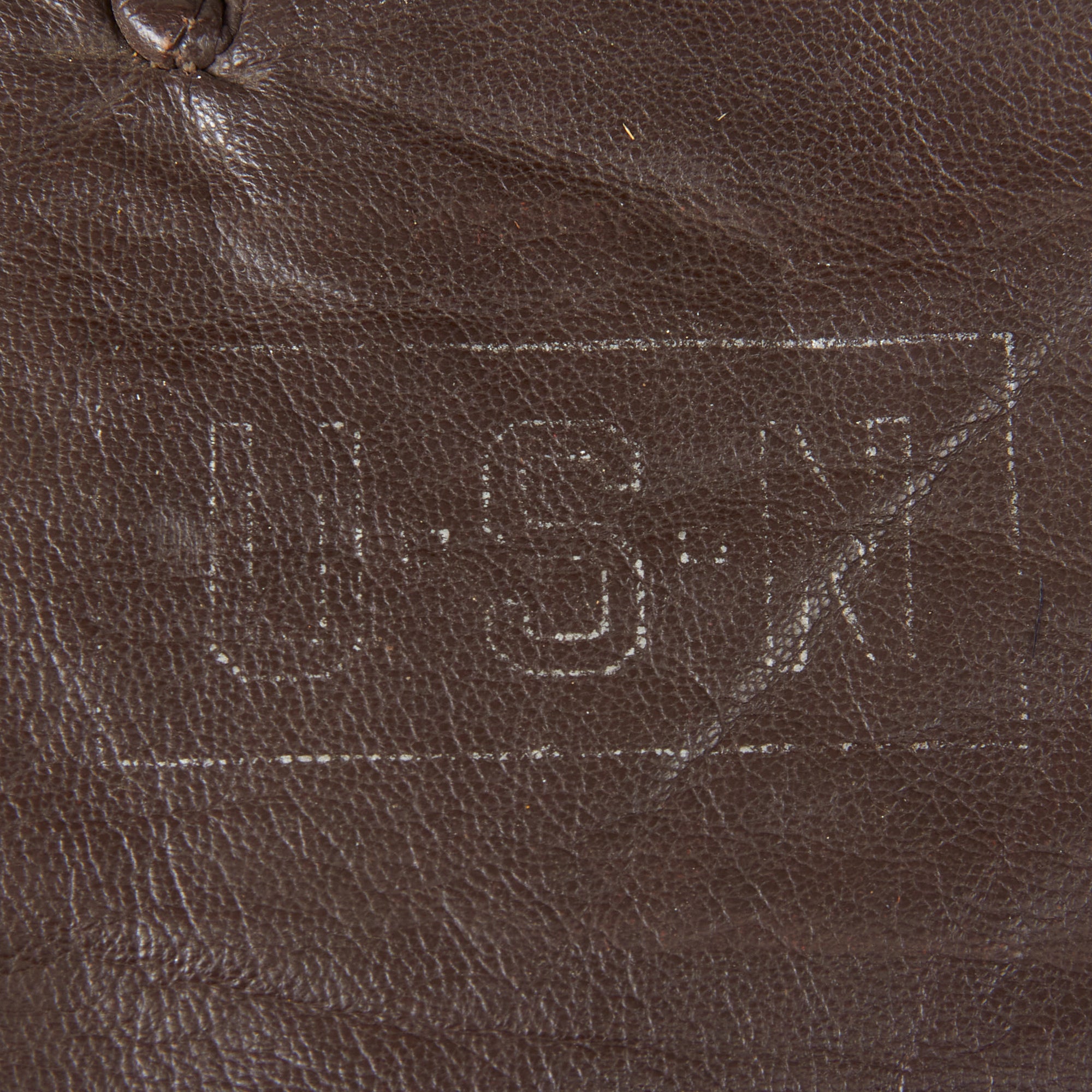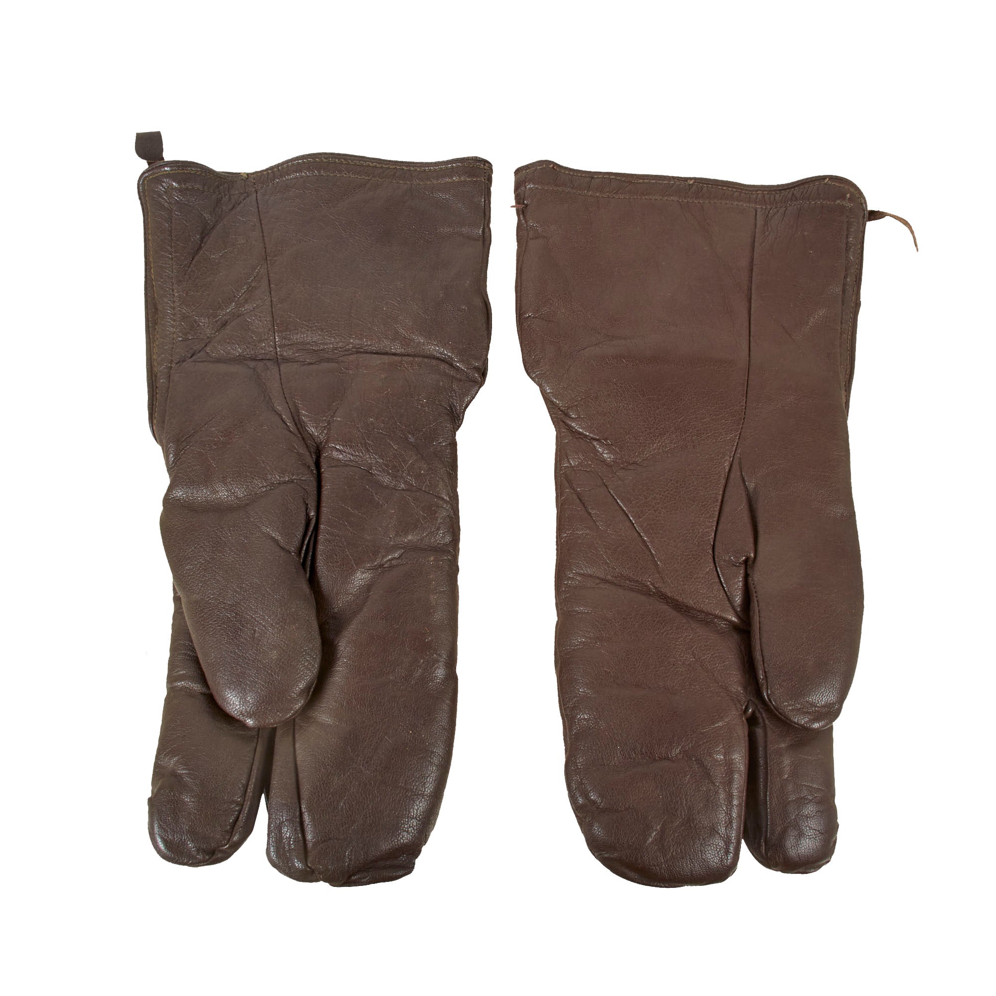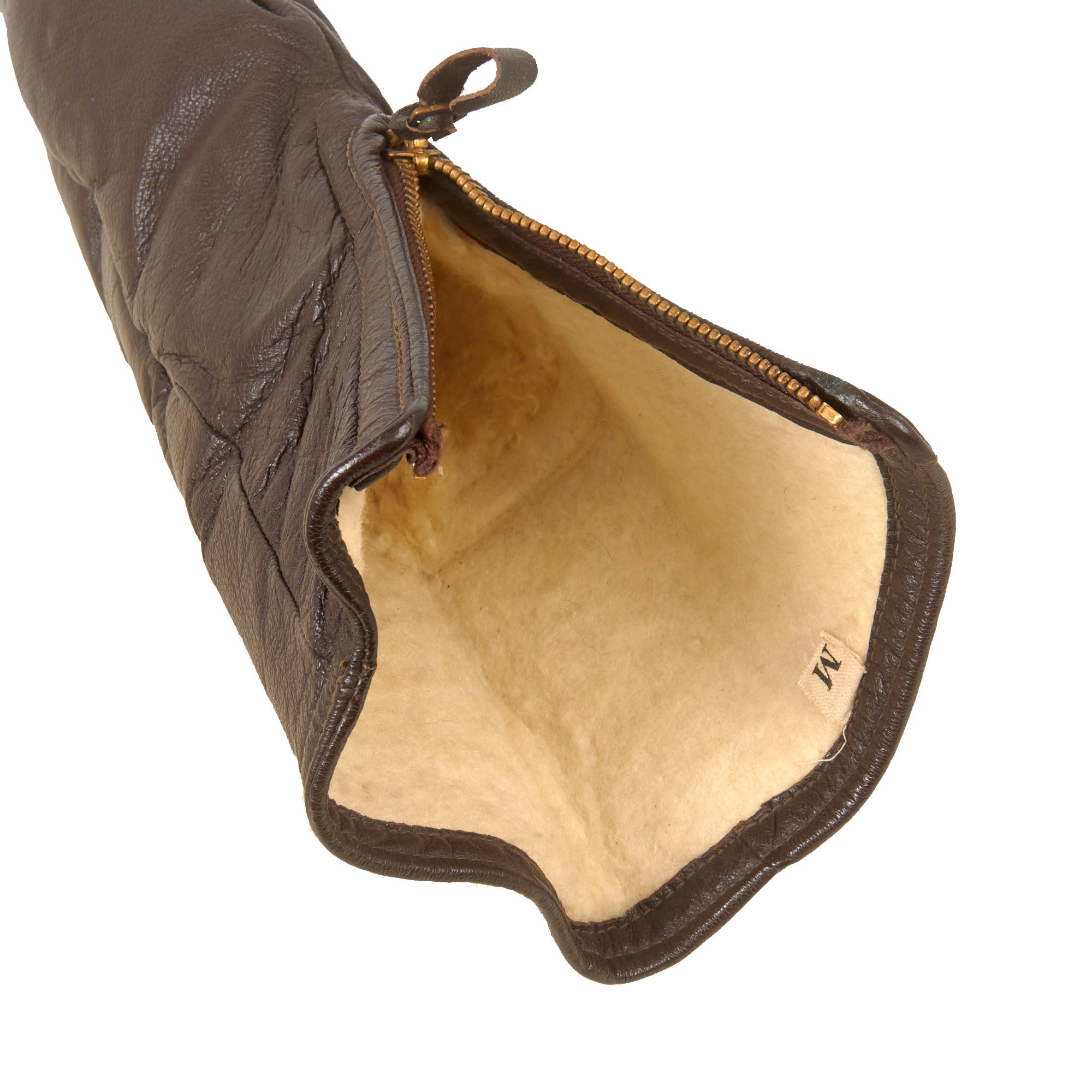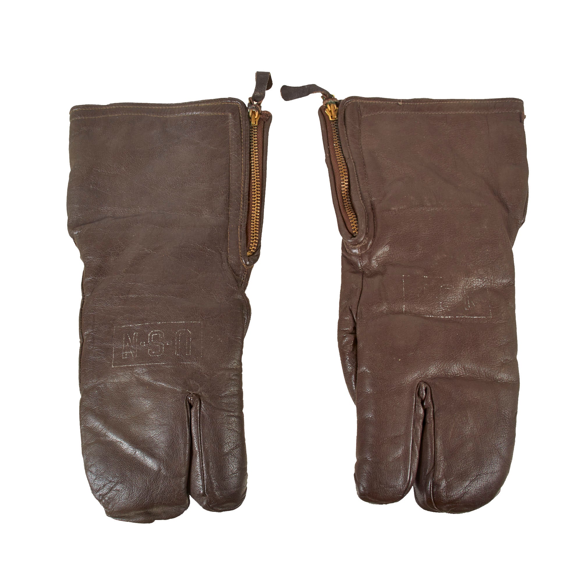 Original Item. Only One Set Available. This is a great set of WWII USN-marked pilot’s gloves. These gloves, similar to the A-9 gauntlet glove, feature a separate thumb and trigger finger from the rest of the glove. The brown leather of the gloves is in very good shape with some creases visible, and the fleece liner only shows a few signs of staining here and there.